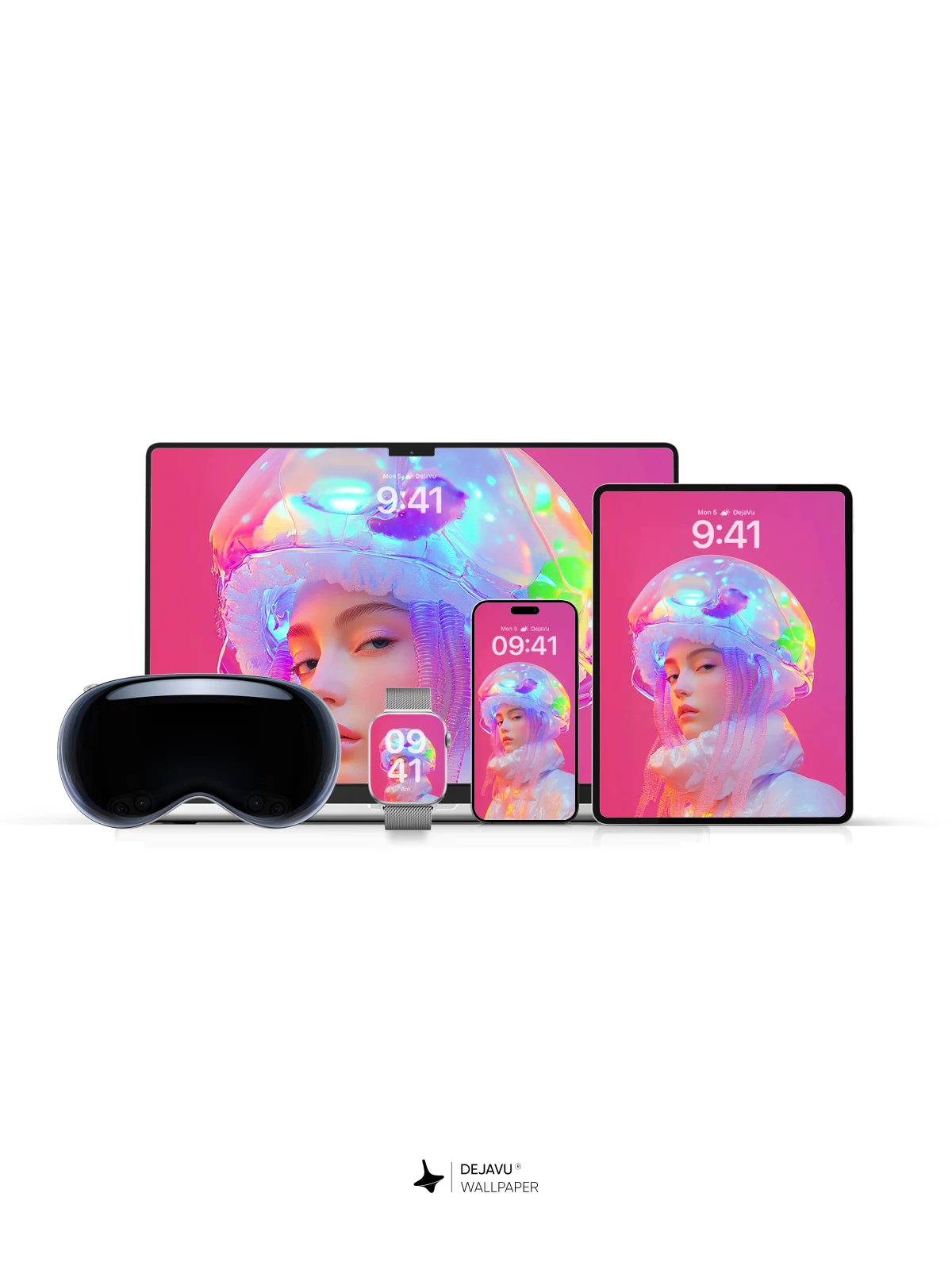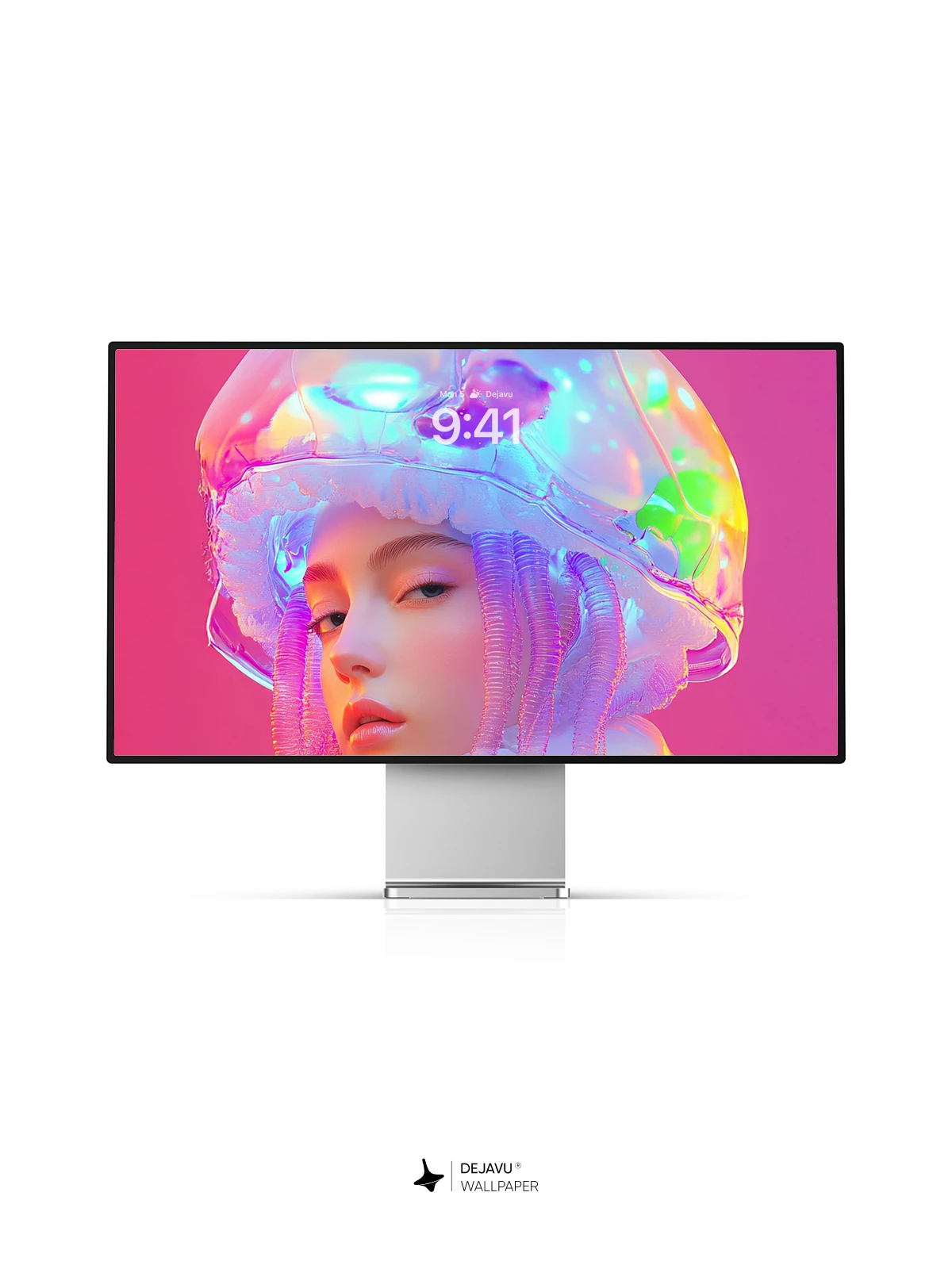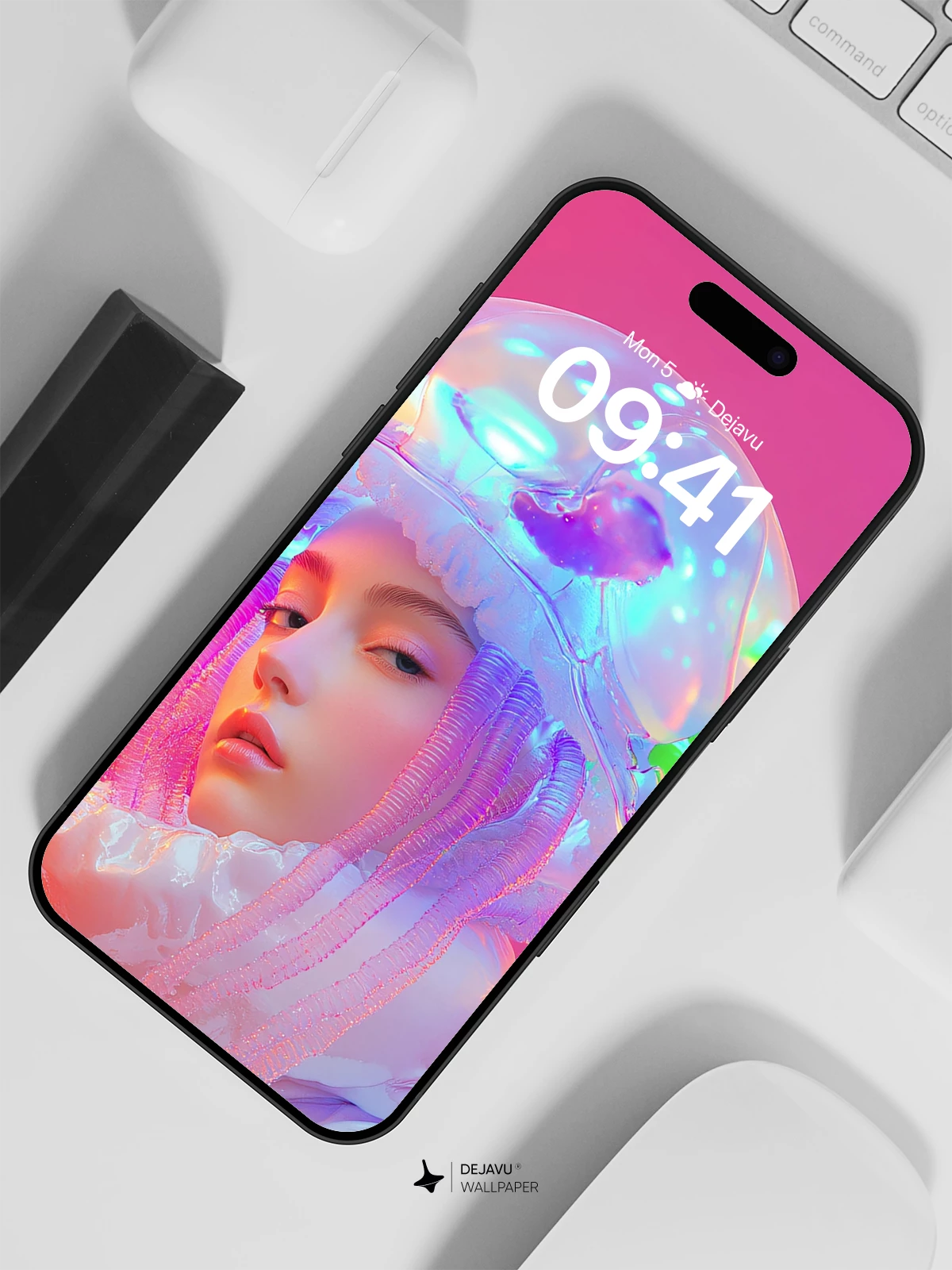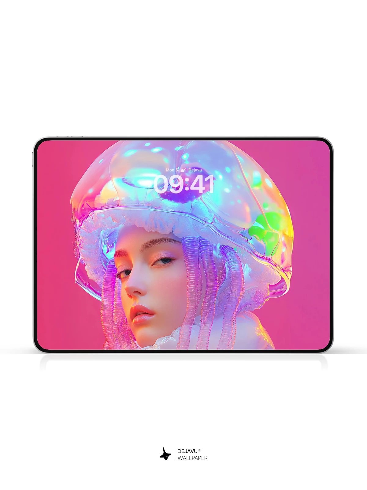 This mesmerizing 8K wallpaper blends fantasy and futurism, featuring a woman adorned with a glowing jellyfish-like headpiece that pulses with iridescent colors against a vivid pink backdrop. The surreal design evokes a dreamlike underwater world fused with cyberpunk aesthetics, creating an otherworldly visual experience. Ideal for iPhone, Android, and tablets, this high-resolution artwork brings a touch of cosmic elegance to your mobile device.