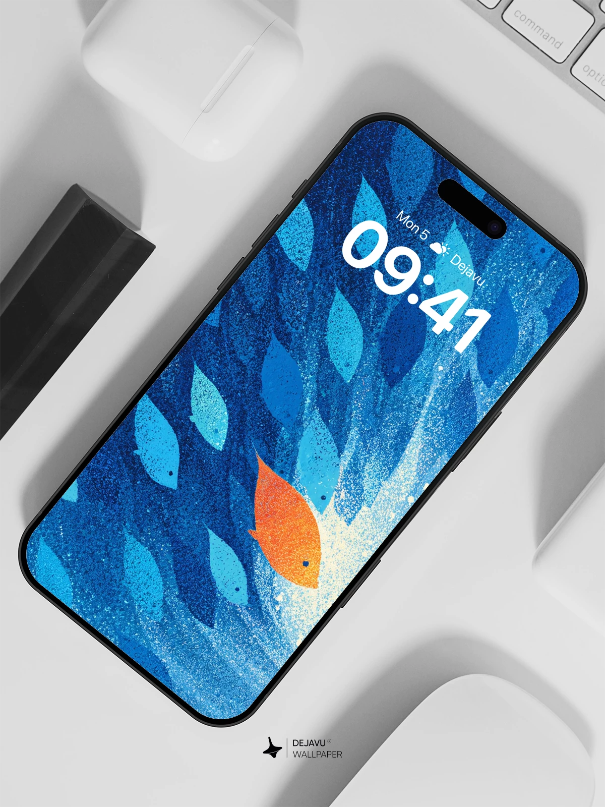 In this evocative digital artwork, a single orange fish dares to swim against the current, emerging from a swirling school of blue silhouettes into radiant light. The image captures themes of individuality and courage with a poetic, dreamlike quality that resonates emotionally. Ideal for those seeking expressive, high-resolution wallpapers, this 8K masterpiece is beautifully suited for iPhone, Android, tablets, and other mobile devices, transforming screens into windows of inspiration and serenity.