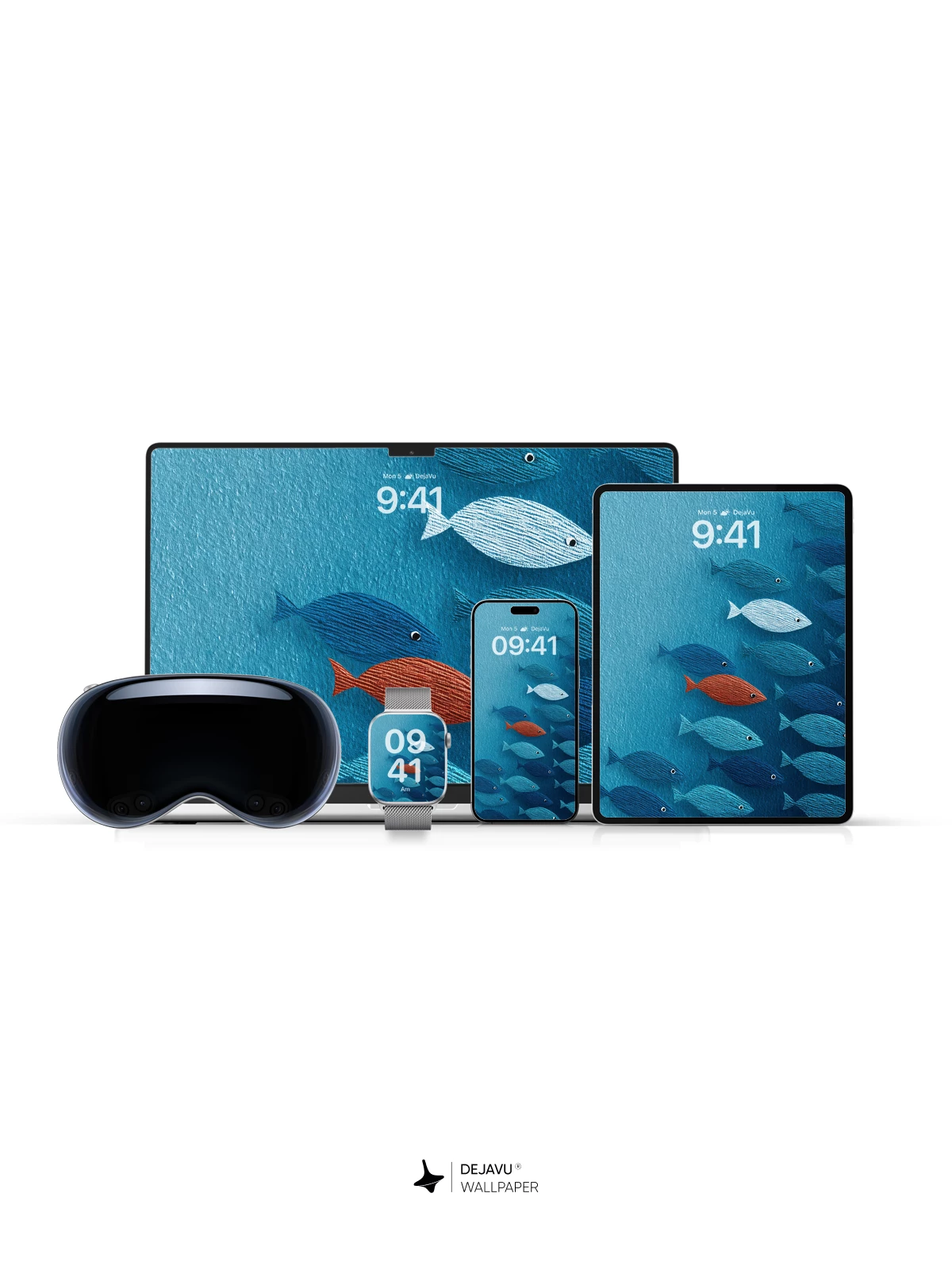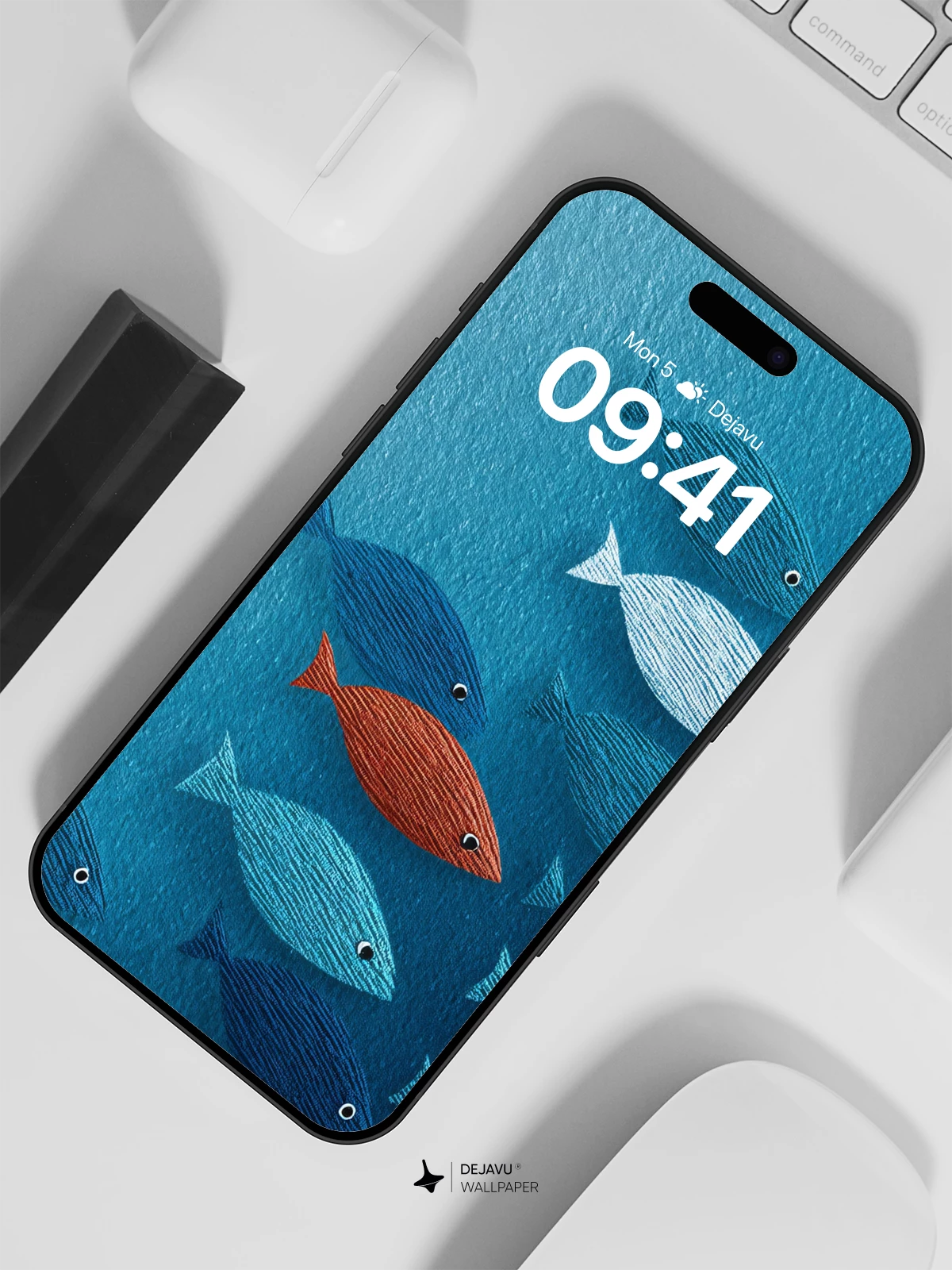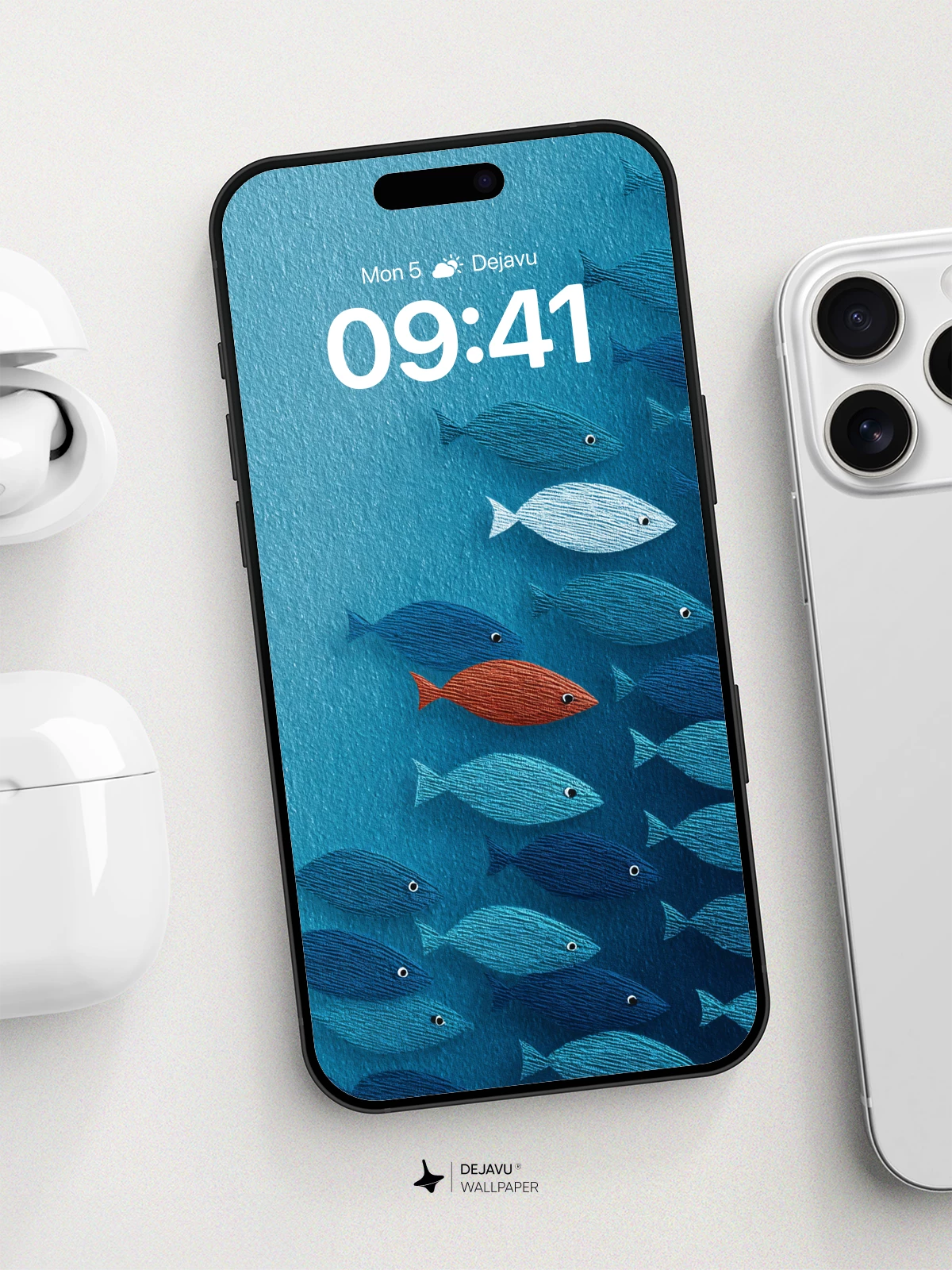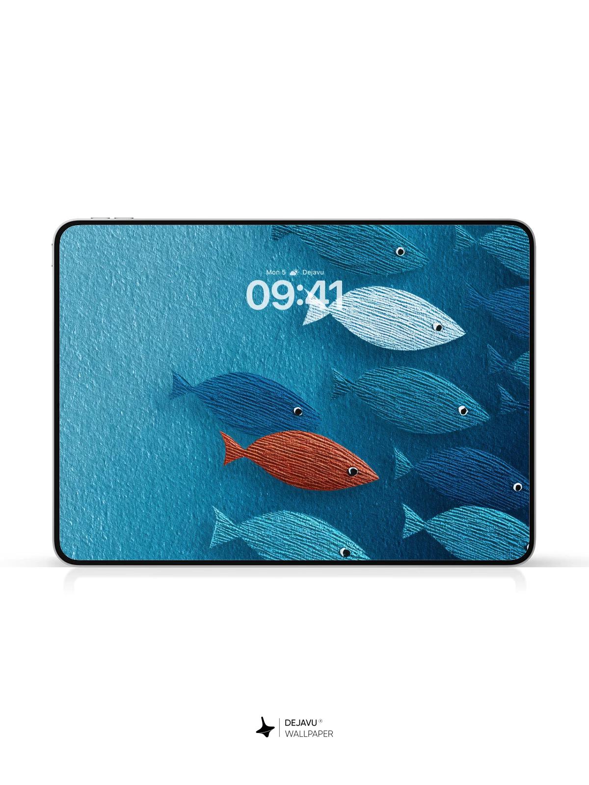 This stunning 8K wallpaper captures a tranquil ocean depths where a school of textured blue fish swims in unison, led by a single striking red fish that breaks the pattern. Inspired by minimalist aquatic art, the image evokes themes of individuality and belonging, making it ideal for iPhone, Android, and tablet screens. The rich blues and subtle textile-like textures add depth and elegance, transforming any device into a canvas of serene marine beauty.