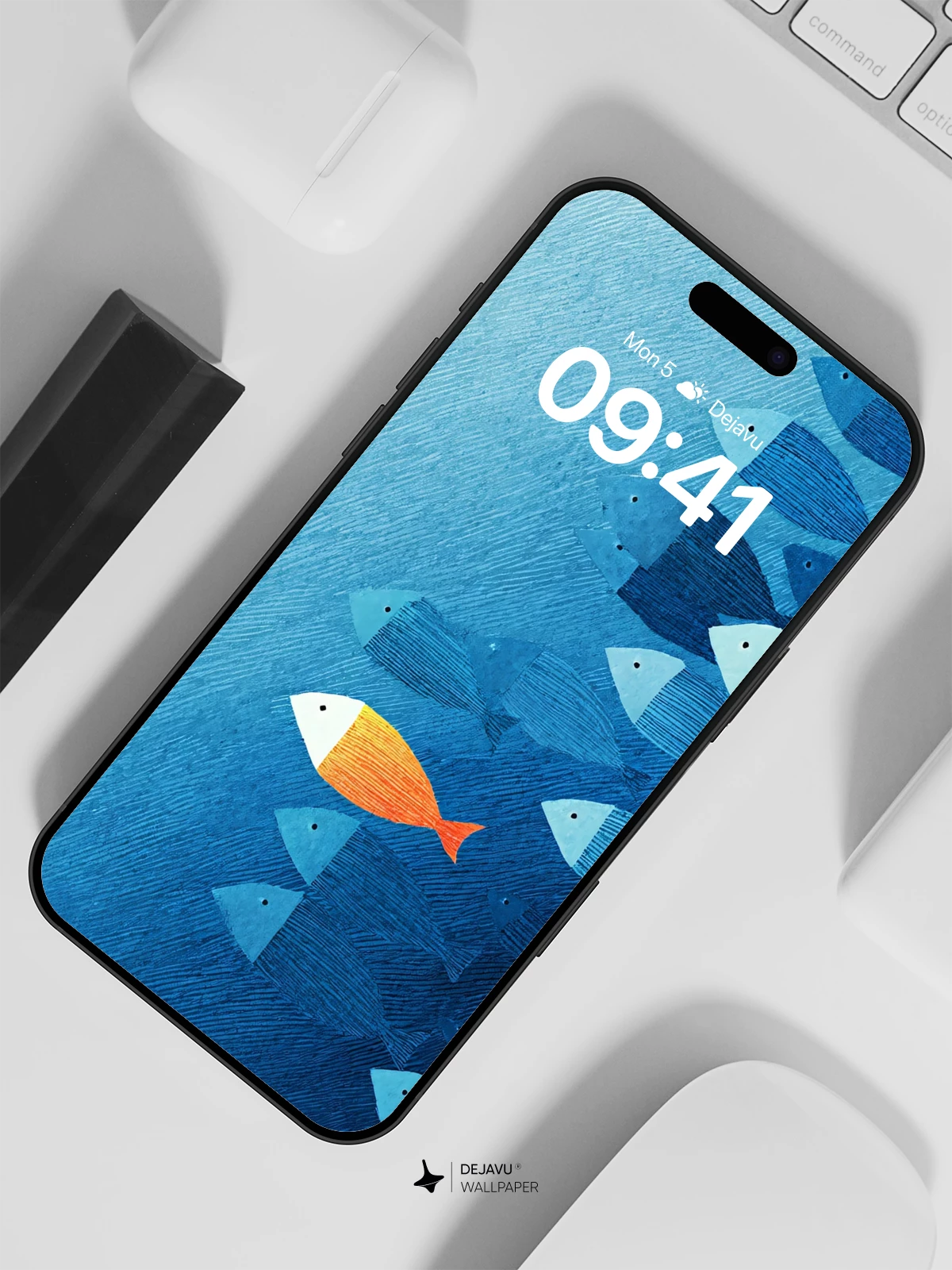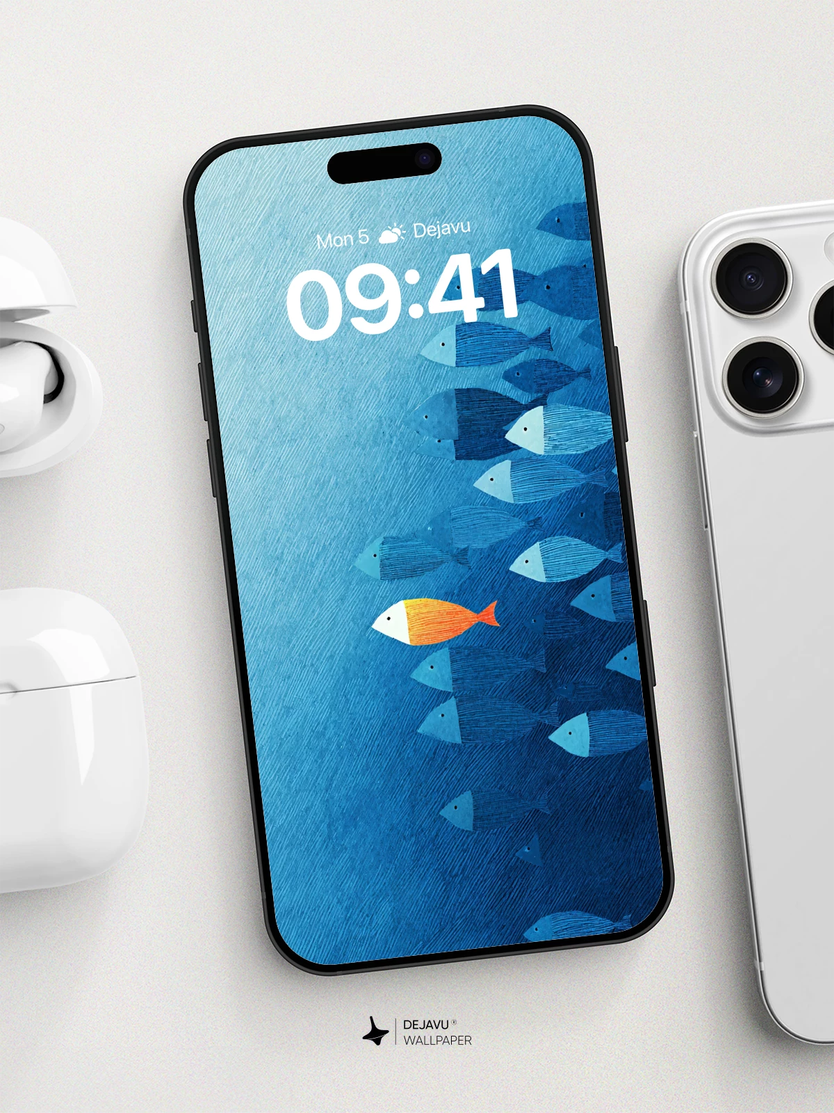 This striking 8K wallpaper captures a symbolic moment in the deep blue sea, where one bright orange fish stands out among a uniform school of blue fish. Inspired by minimalist marine art, the design blends simplicity with emotional depth, evoking themes of individuality and courage. The textured gradient background adds a tactile richness, making it ideal for iPhone, Android, and tablet screens. A modern, thought-provoking piece that transforms your device into a canvas of quiet rebellion and aquatic beauty.