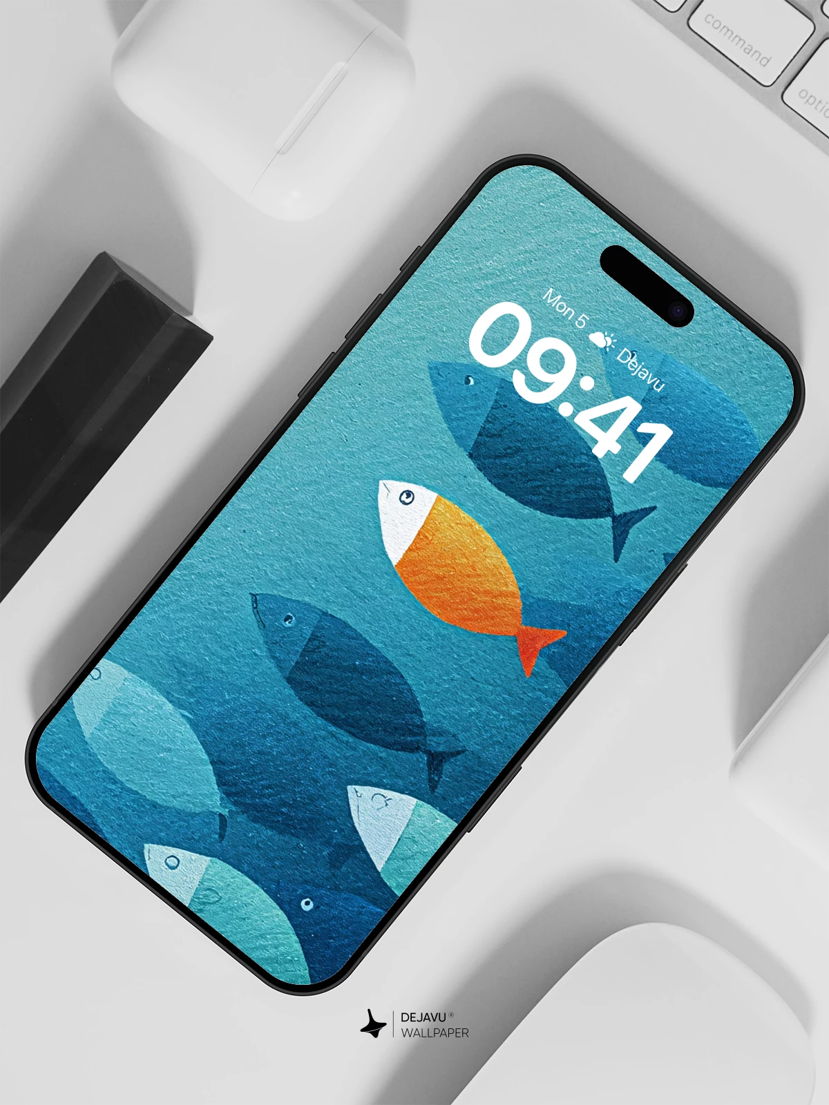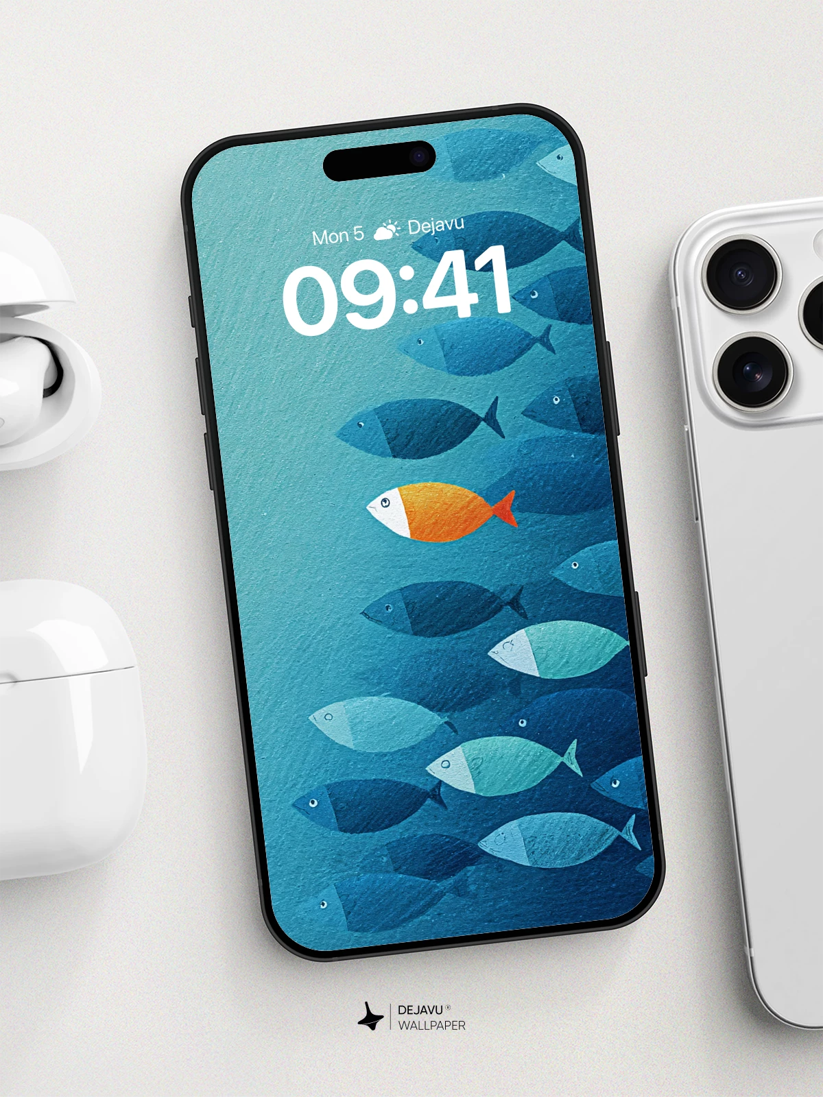 Inspired by symbolic storytelling, this artwork captures the courage of individuality amidst conformity—a single orange fish swimming in the opposite direction of a blue school. The stylized, geometric forms evoke a modern, graphic aesthetic ideal for 8K wallpapers on iPhone, Android, or tablets. With its calming gradient blues and striking central figure, it brings depth and meaning to any device screen.