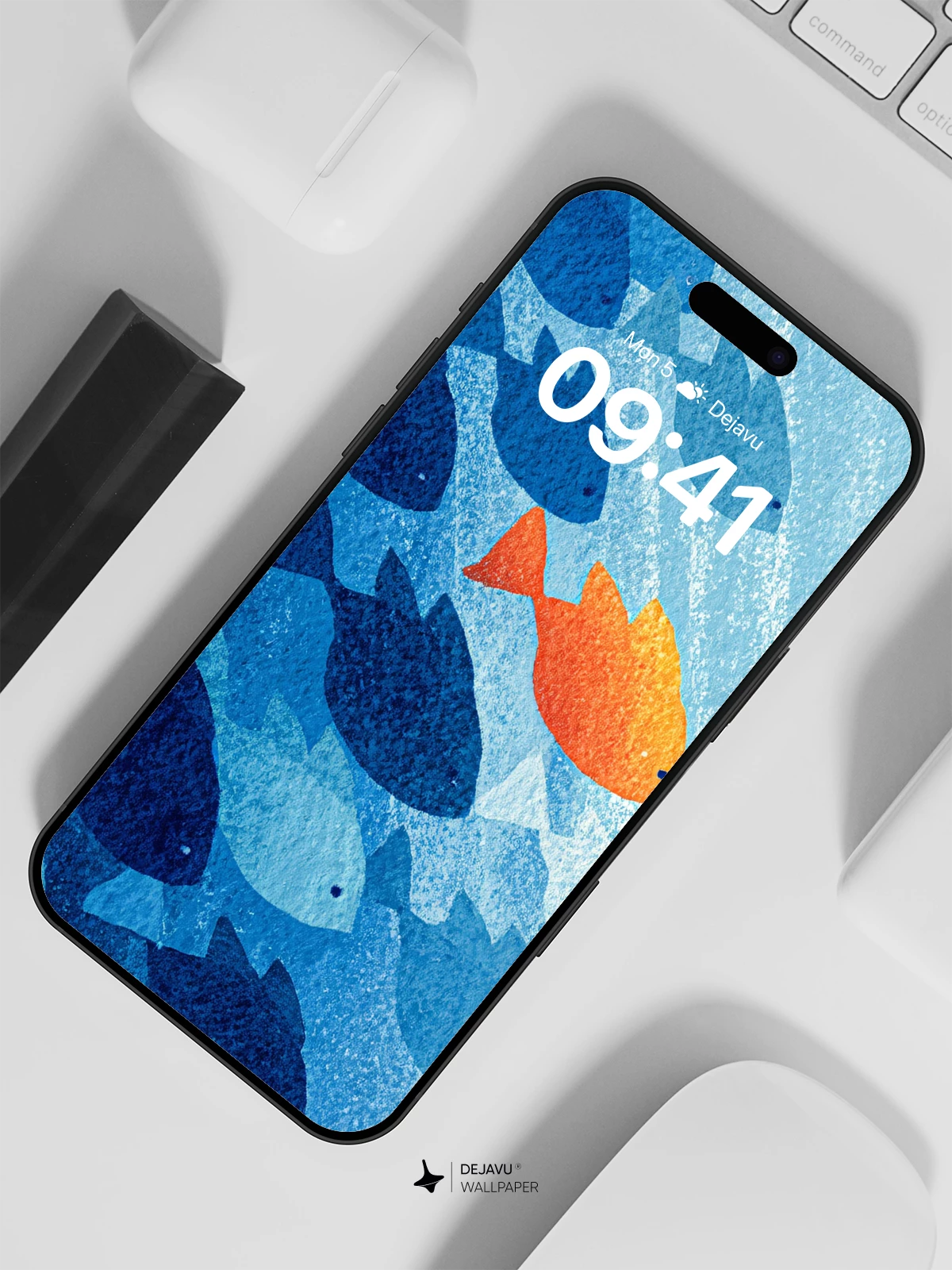 In this striking illustration, a single orange fish breaks from the uniform blue school, symbolizing individuality and courage. The minimalist aquatic design uses bold colors and clean shapes to create a visually compelling scene. Inspired by modern graphic art with a touch of symbolic storytelling, it evokes themes of standing out and embracing uniqueness. Ideal as an 8K wallpaper for iPhone, Android, or tablets, this artwork brings dynamic energy and creative depth to any screen.