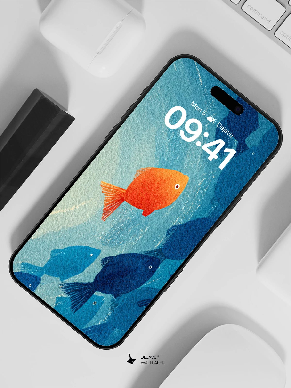 This evocative underwater scene captures a lone orange fish swimming in the opposite direction of a school of dark blue fish, symbolizing individuality and courage. The soft gradient ocean backdrop and textured brushwork lend a painterly depth, reminiscent of modern illustrative art. Ideal as an 8K wallpaper for iPhone, Android, or tablets, it brings a calm yet inspiring aesthetic to your device’s screen, perfect for those who appreciate symbolic storytelling and minimalist elegance.