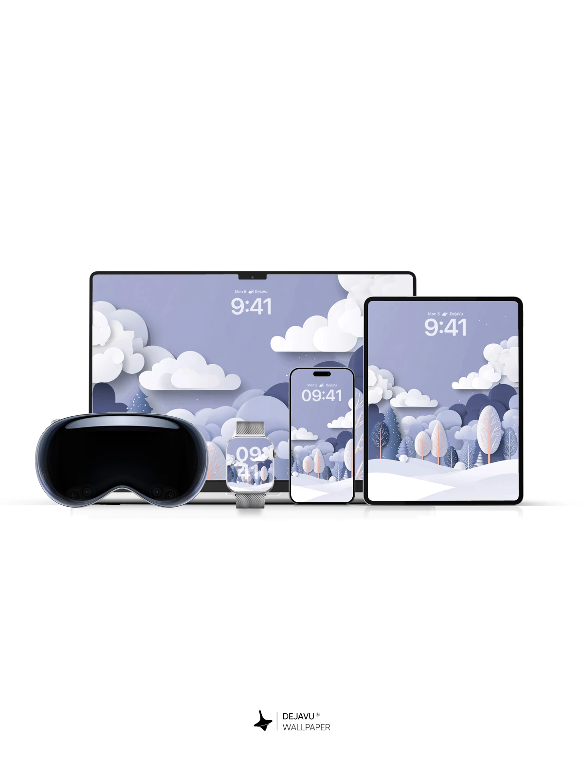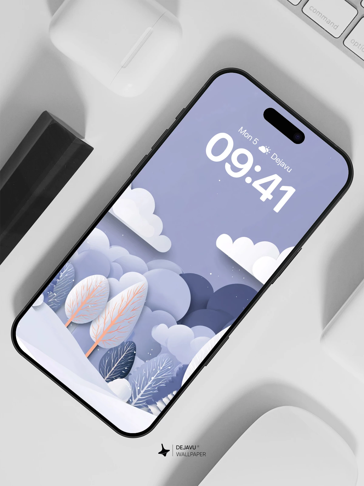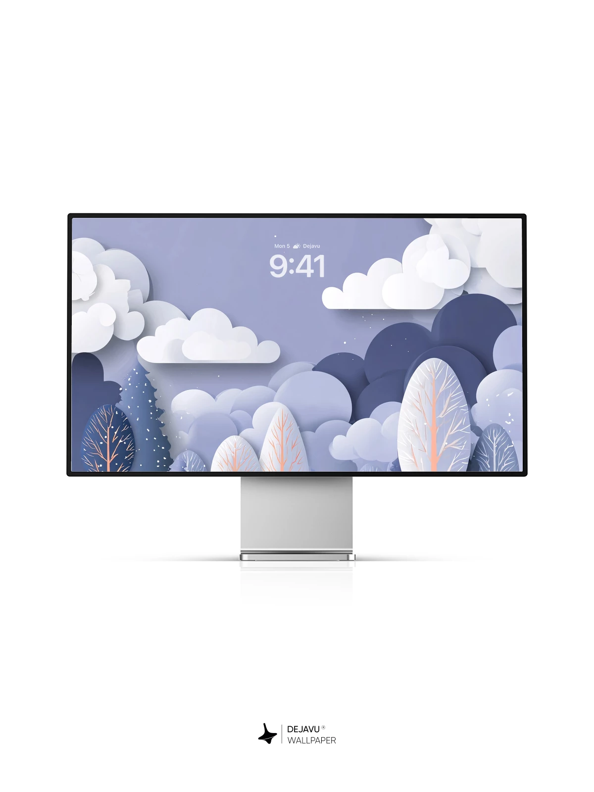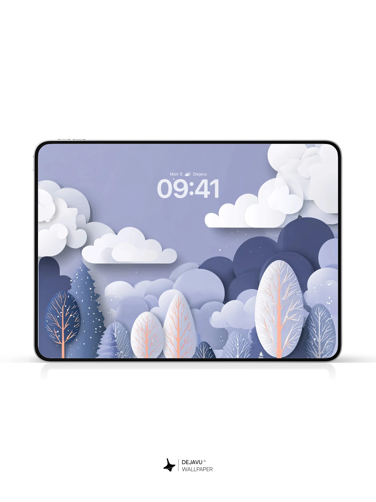 This enchanting winter scene, inspired by the intricate art of paper cutting, features layered trees and fluffy clouds under a calm lavender sky. The minimalist yet detailed design evokes a sense of peaceful solitude, ideal for calming your digital space. With its crisp textures and soothing palette, it’s a beautiful 8K wallpaper perfect for iPhone, Android, and tablets, bringing a touch of artistic serenity to your screen.