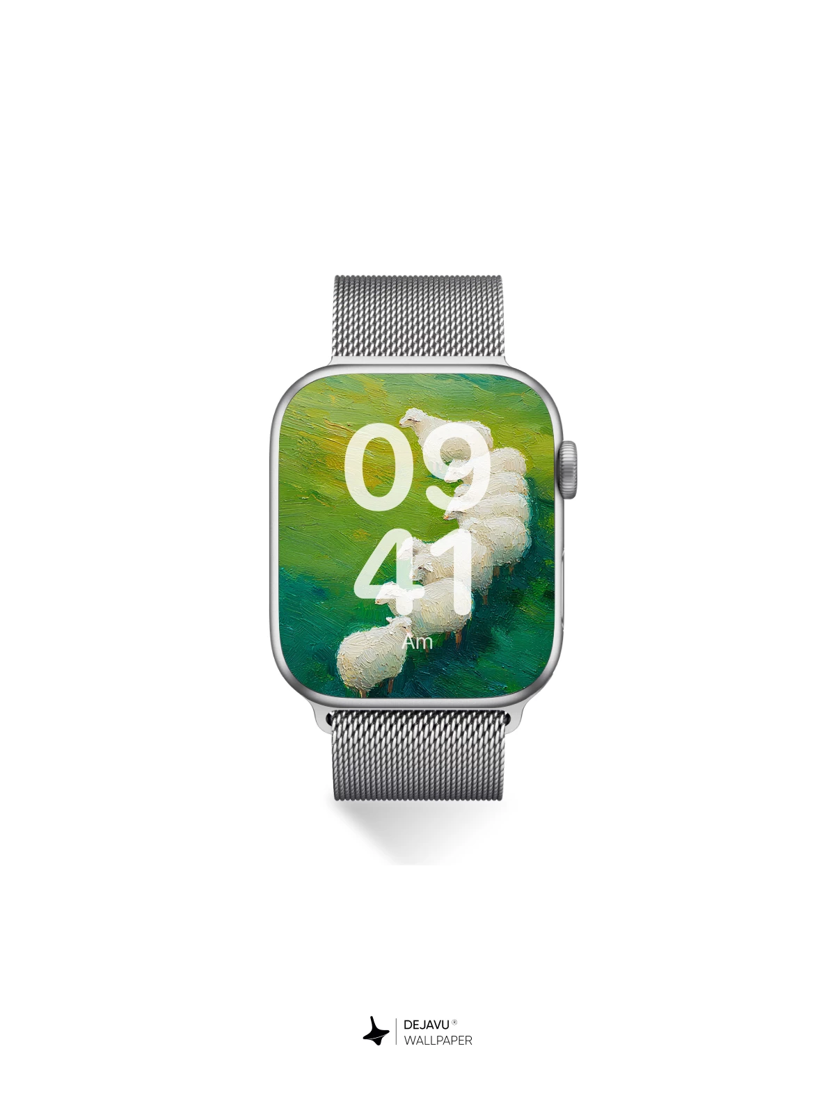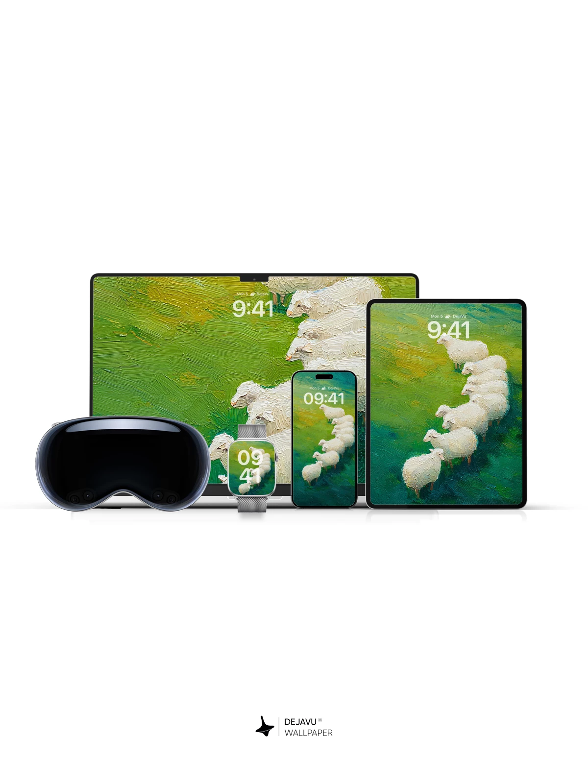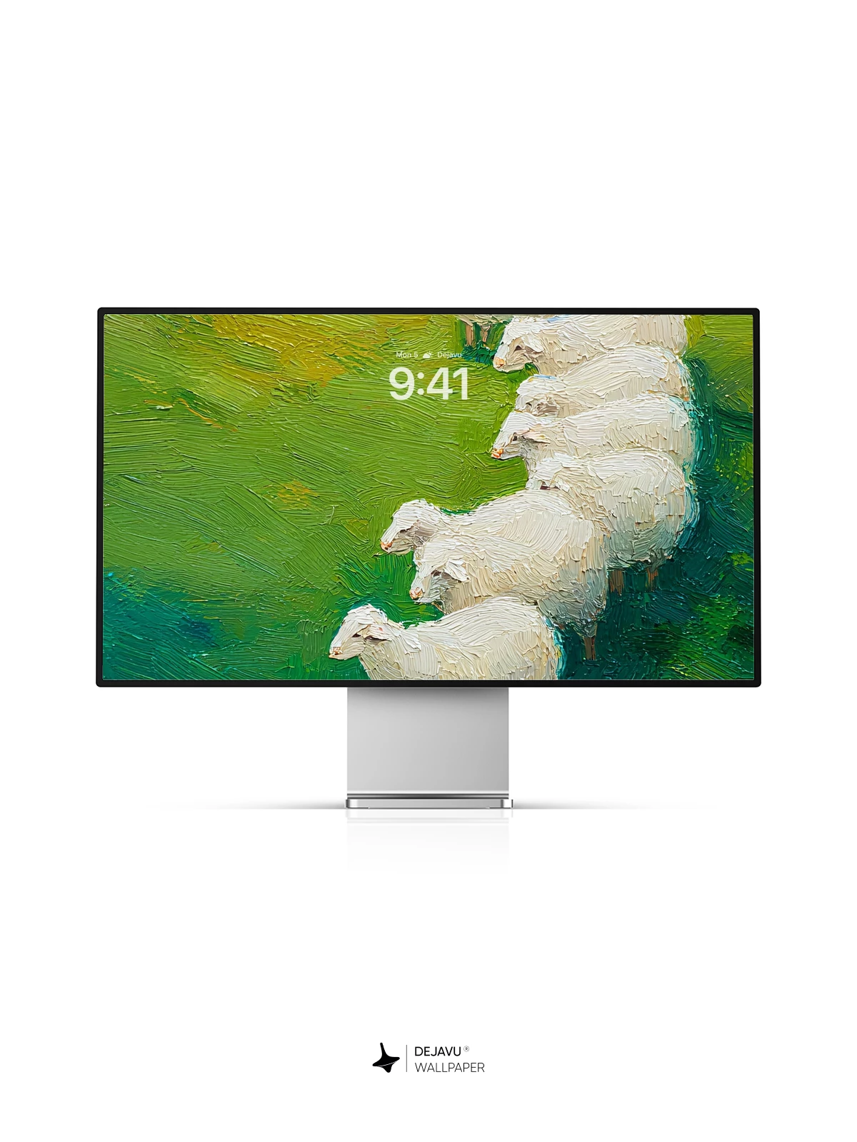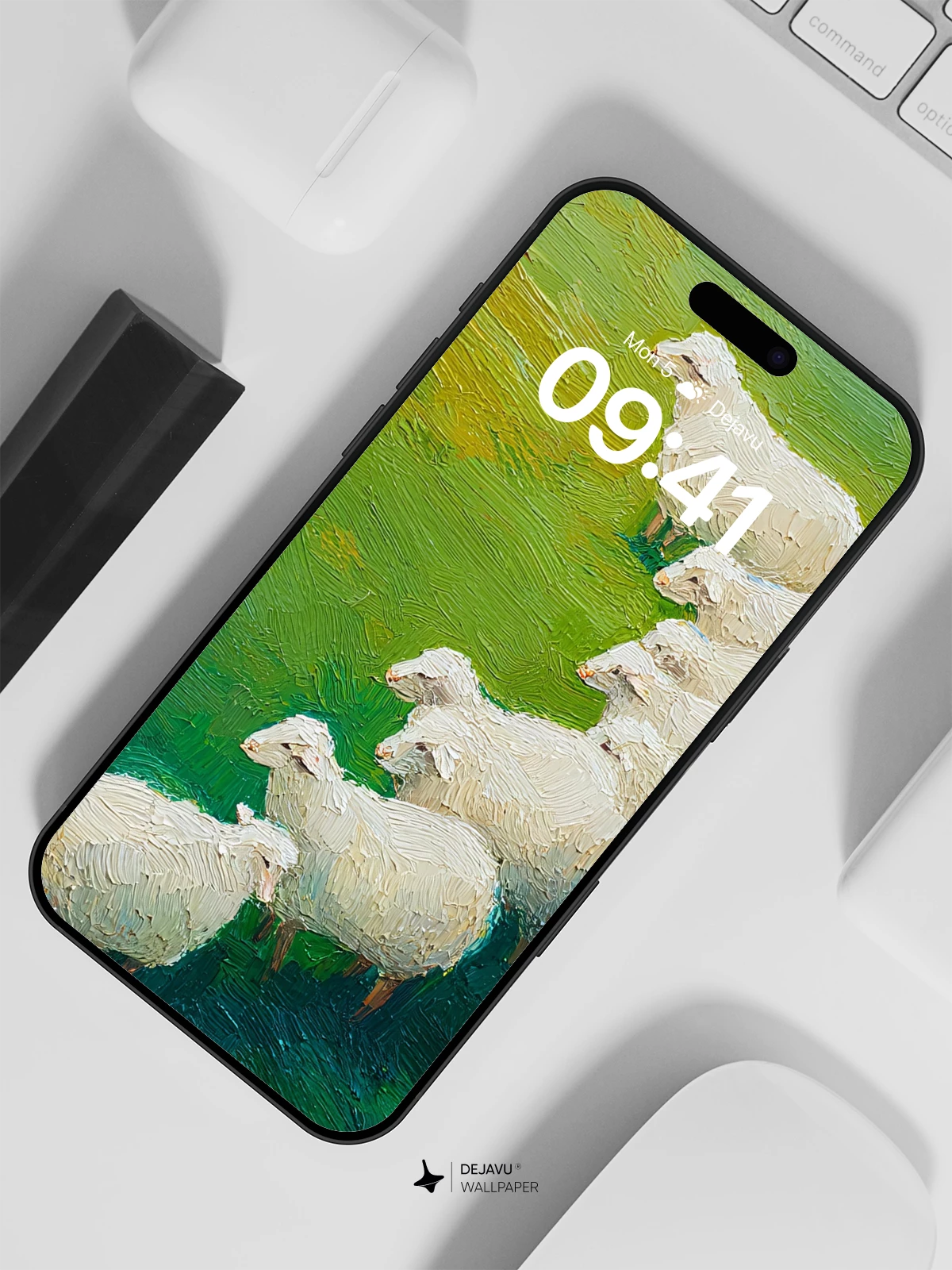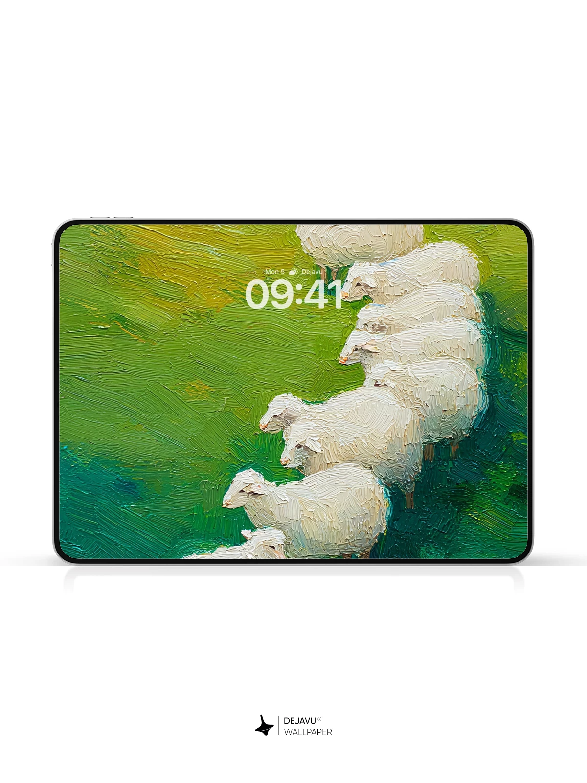 This evocative oil painting captures a tranquil lineup of sheep grazing across a lush, rolling meadow, painted with thick, expressive brushstrokes reminiscent of post-impressionist techniques. The vivid greens and soft whites create a calming, pastoral scene that feels both timeless and deeply peaceful. Ideal as an 8K wallpaper for iPhone, Android, or tablets, this artwork brings a touch of rustic elegance and natural harmony to any mobile device screen.