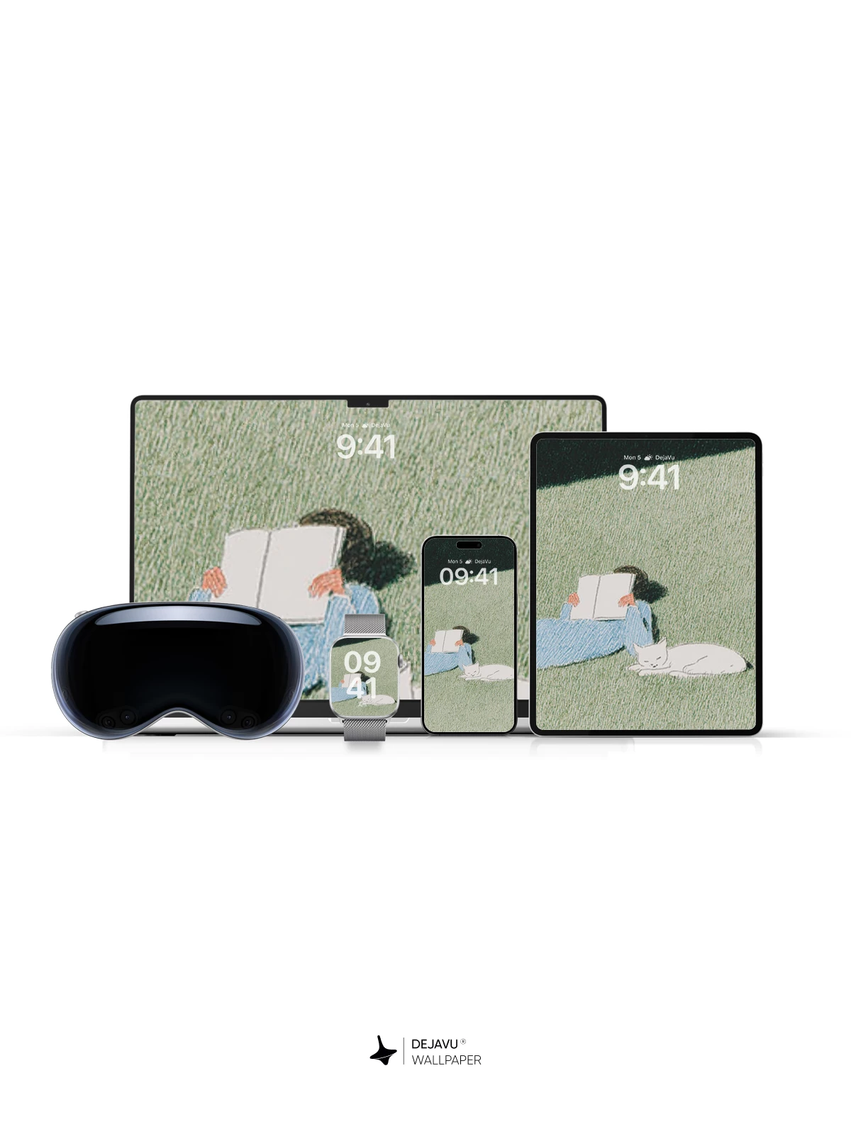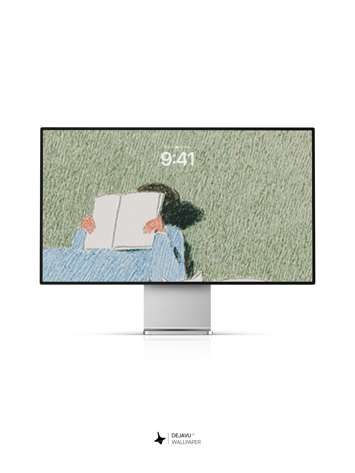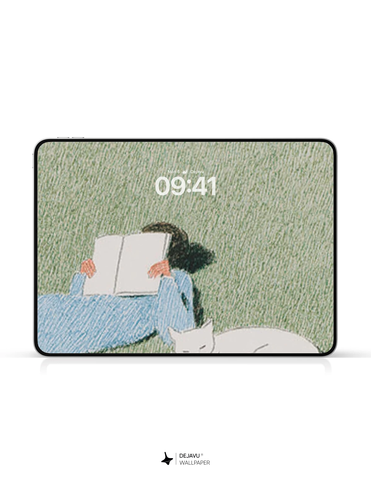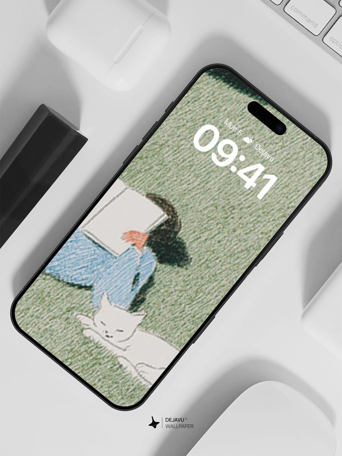 This tranquil scene captures a moment of peaceful solitude, where a figure lies on grass, absorbed in a book, while a white cat curls beside them in gentle repose. Rendered in a delicate, textured illustration style reminiscent of Japanese manga and contemporary minimalist art, the image radiates calm and introspection. The soft greens and subtle shadows create a soothing atmosphere perfect for an 8K wallpaper on iPhone, Android, or tablet. Ideal for those who cherish quiet moments, nature, and companionship, this artwork transforms any device into a portal of serenity.