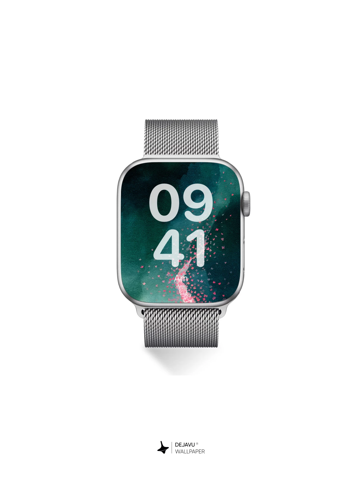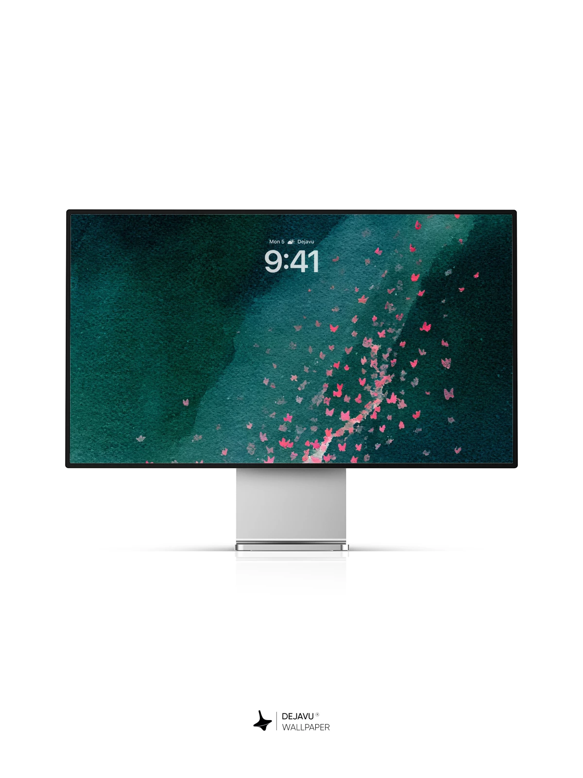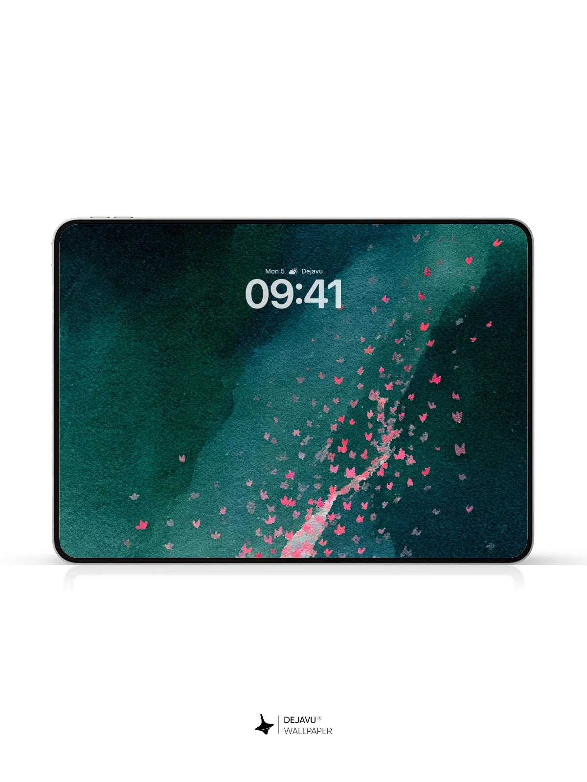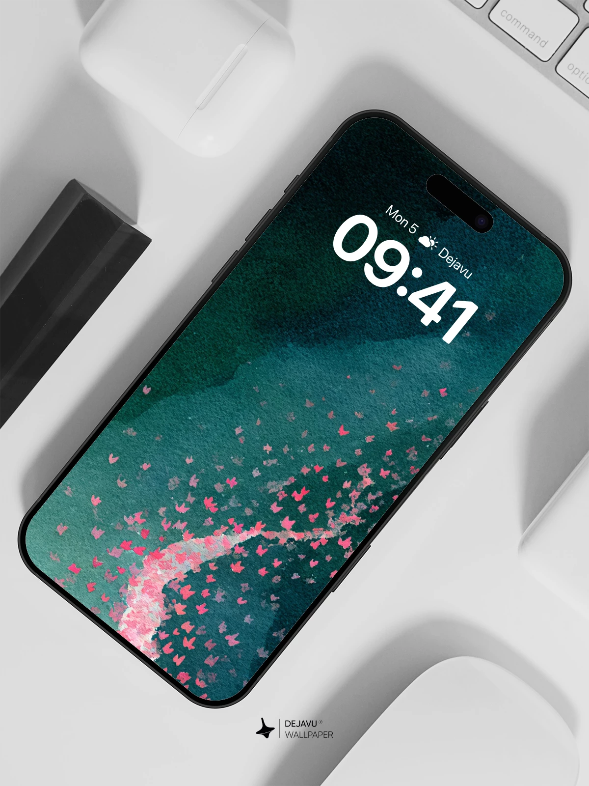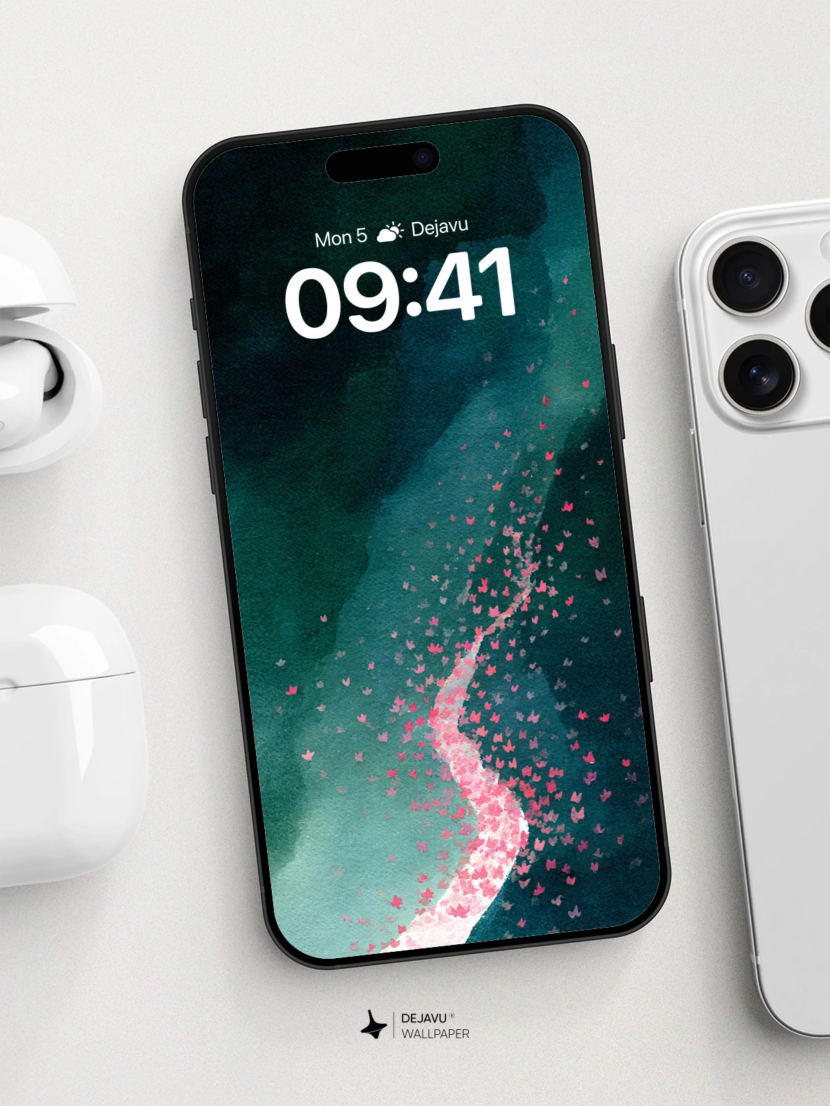 This 8K wallpaper captures a dreamlike scene where a stream of pink butterflies drifts through a moody, dark teal atmosphere. The soft, watercolor texture adds a hand-painted feel, making it a unique and calming background for iPhone, Android, and tablets.