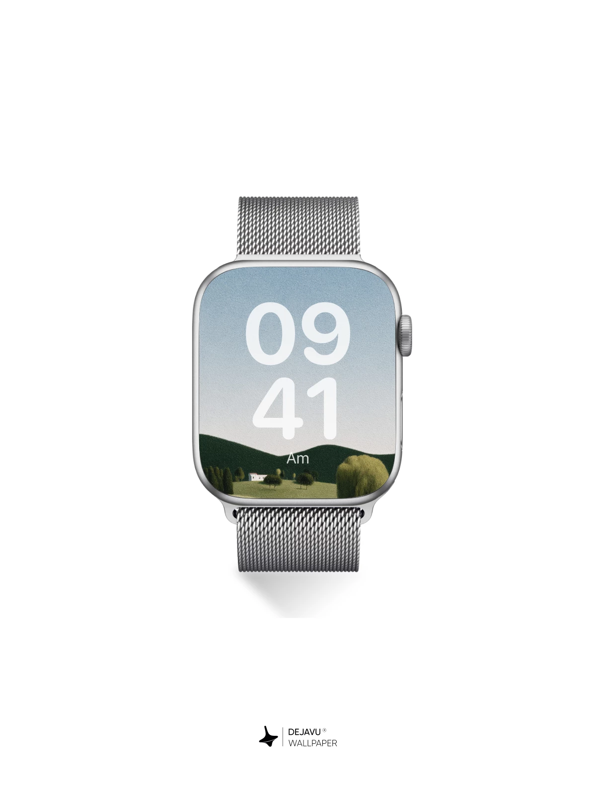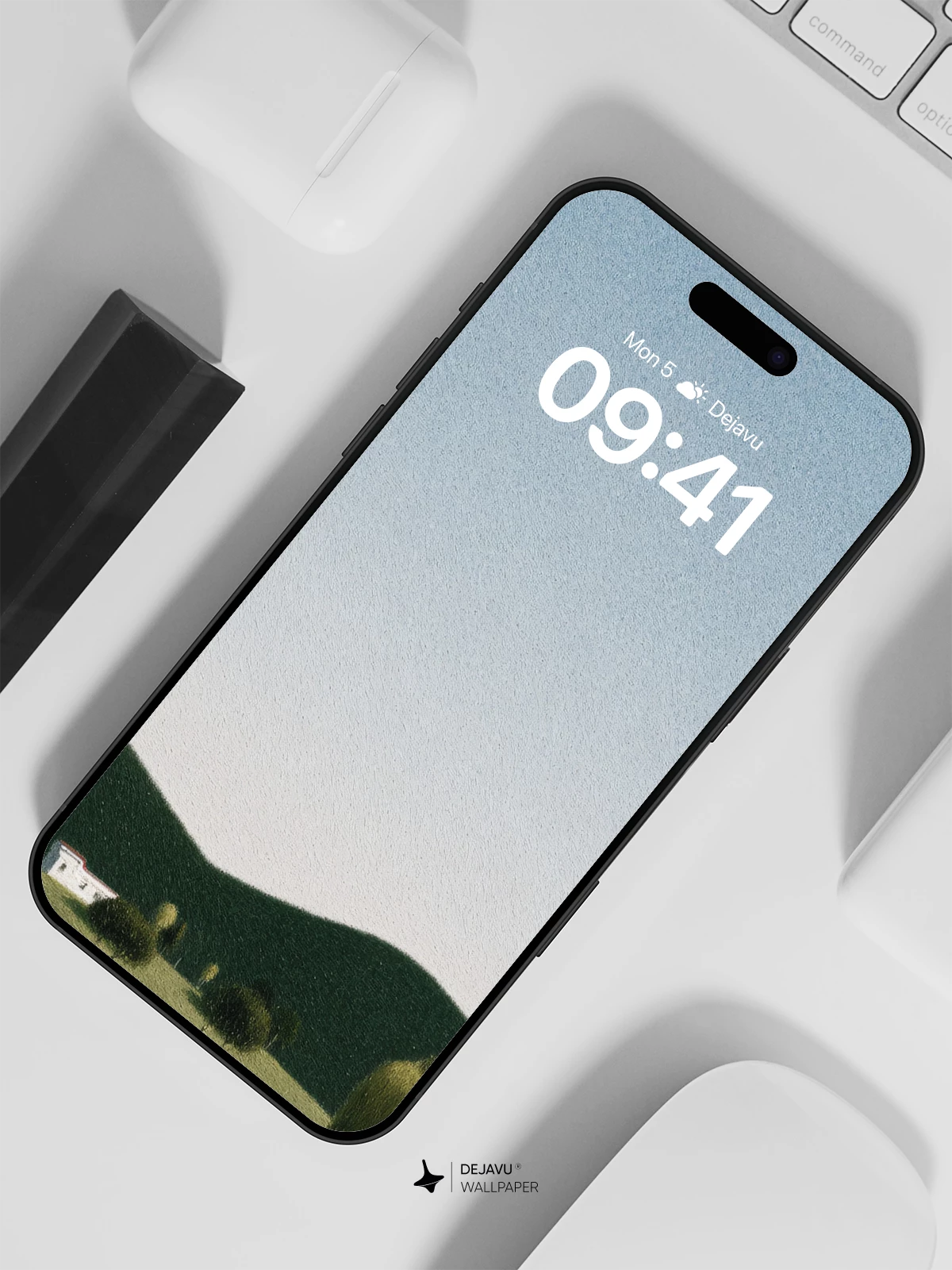 A minimalist landscape featuring gentle green hills and a clear sky. A small white house sits in the distance, adding a touch of life. This 8K wallpaper is perfect for iPhone and Android screens, offering a clean and peaceful background.