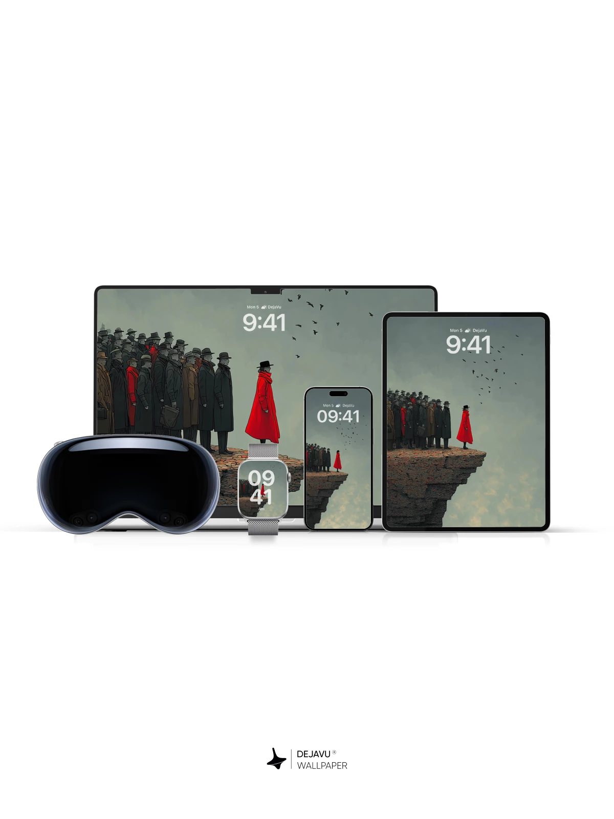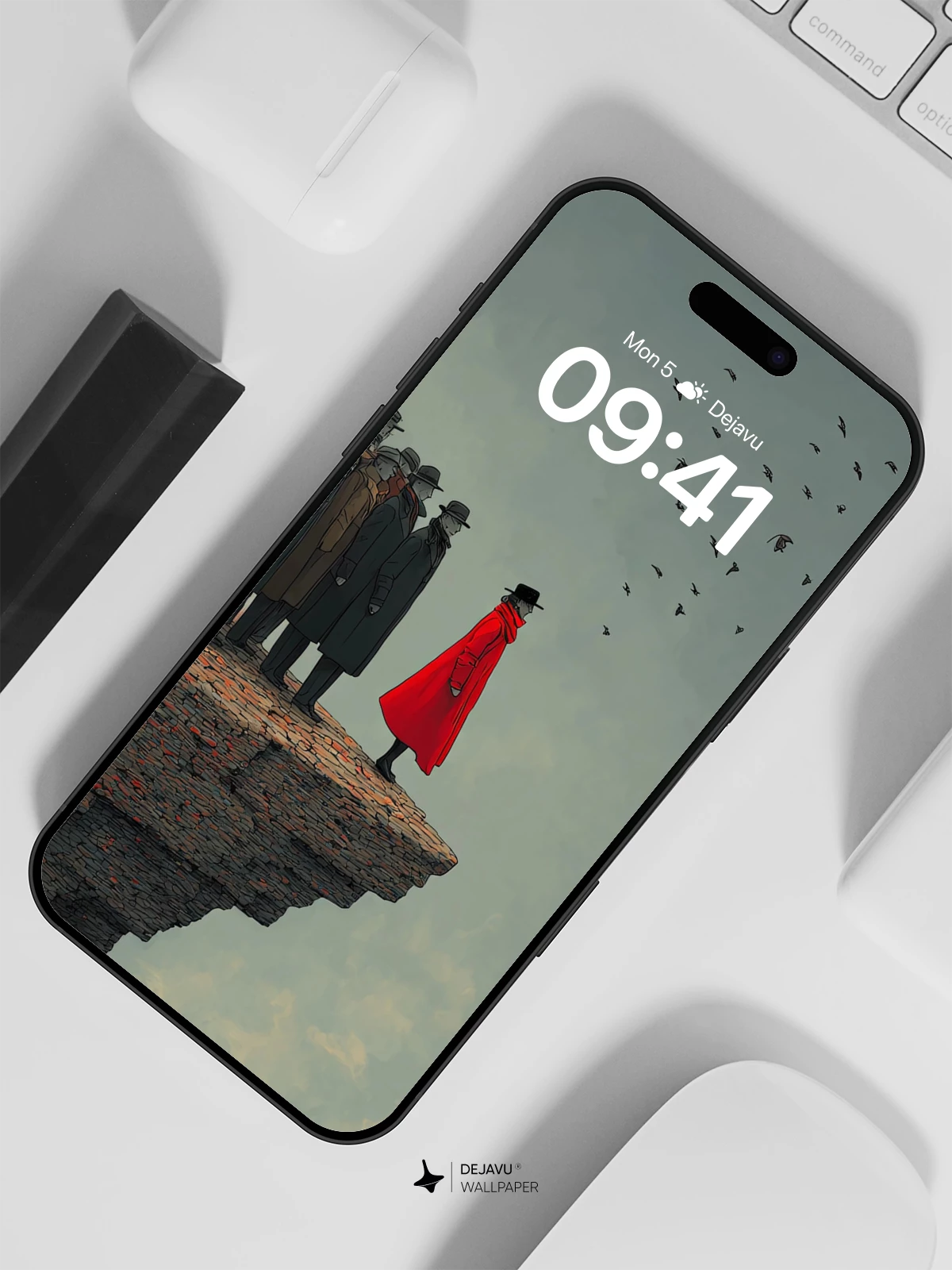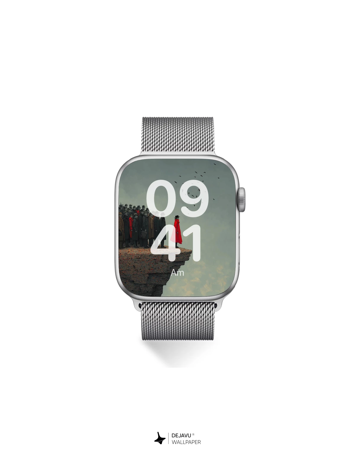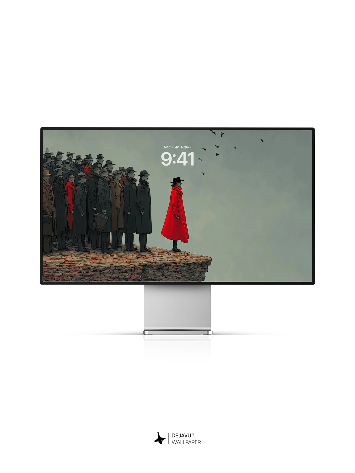This dramatic wallpaper features a lone figure in a vivid red coat, poised at the edge of a rugged cliff, facing a vast, moody sky. A crowd of shadowy figures stands behind, while birds soar overhead, adding a dynamic element to the scene. The high-resolution 8K image captures the texture of the cliff and the intensity of the moment, perfect for adding a touch of surrealism to your iPhone, Android, or tablet screen.