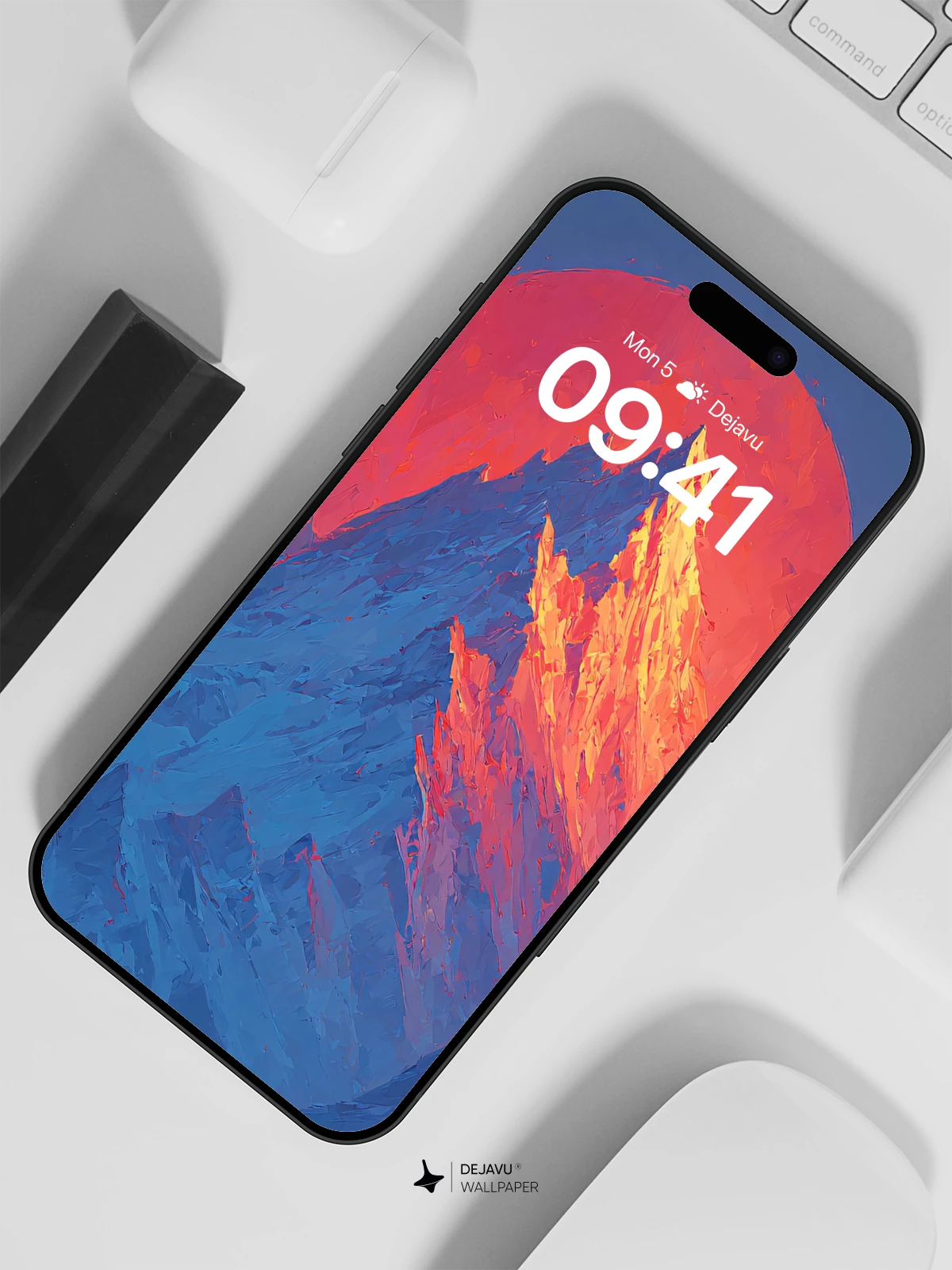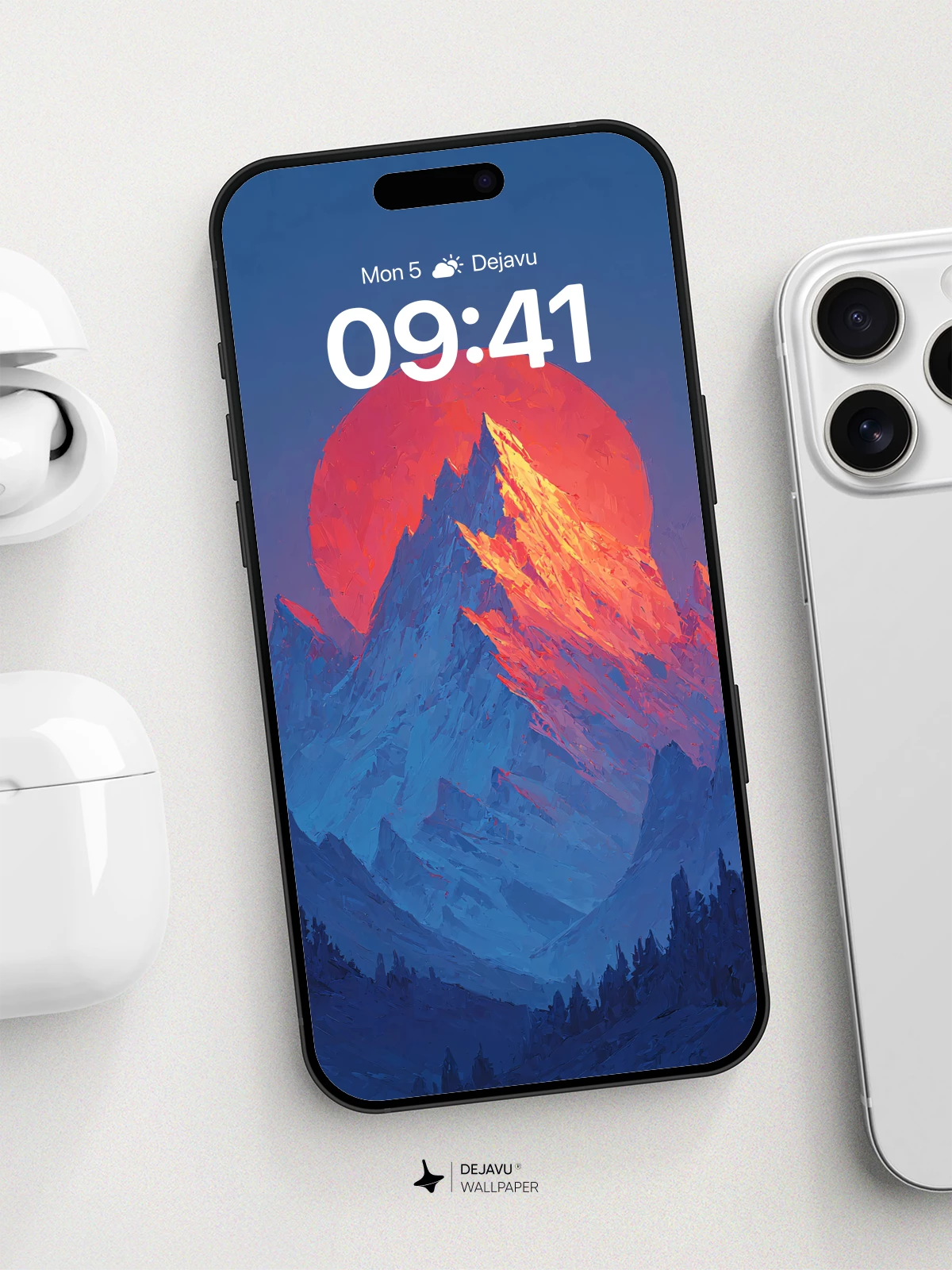 This 8K wallpaper features a sharp, snow-capped mountain peak set against a glowing red moon. The dramatic contrast and clean lines offer a modern, artistic touch. Ideal for enhancing your iPhone, Android, or tablet screen with a bold, natural scene.