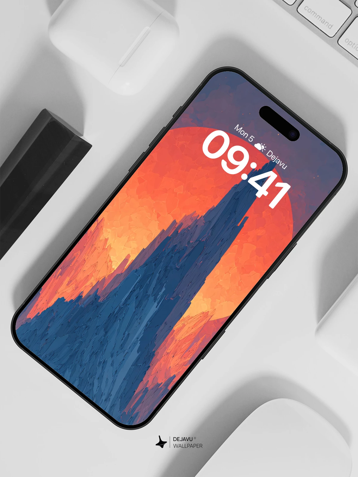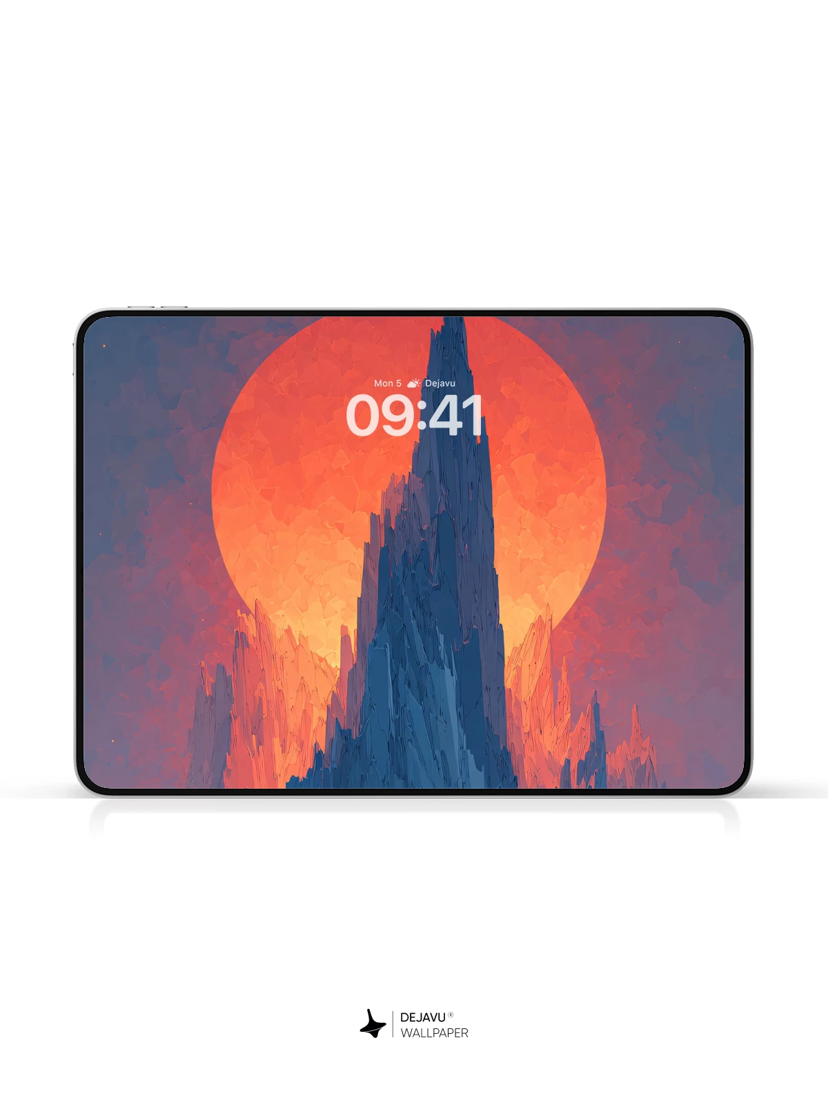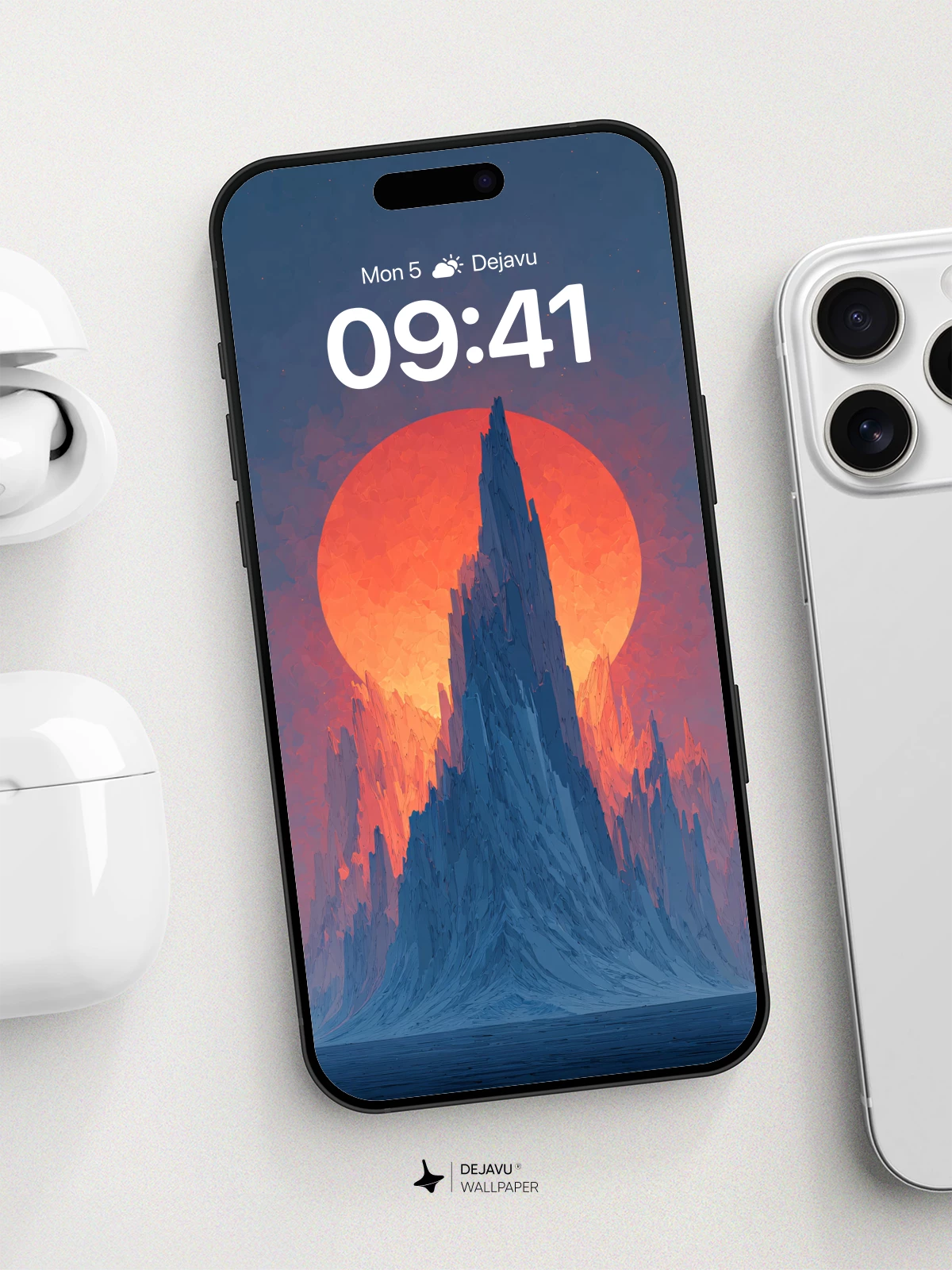This 8K wallpaper features a towering, glacier-like peak silhouetted against a colossal, glowing red sun. The cool blues of the ice contrast sharply with the warm, fiery tones of the sky, creating a visually striking scene. Ideal for fantasy lovers, this high-resolution image is perfect for enhancing the look of your iPhone, Android, or tablet with a sense of epic adventure and serene beauty.