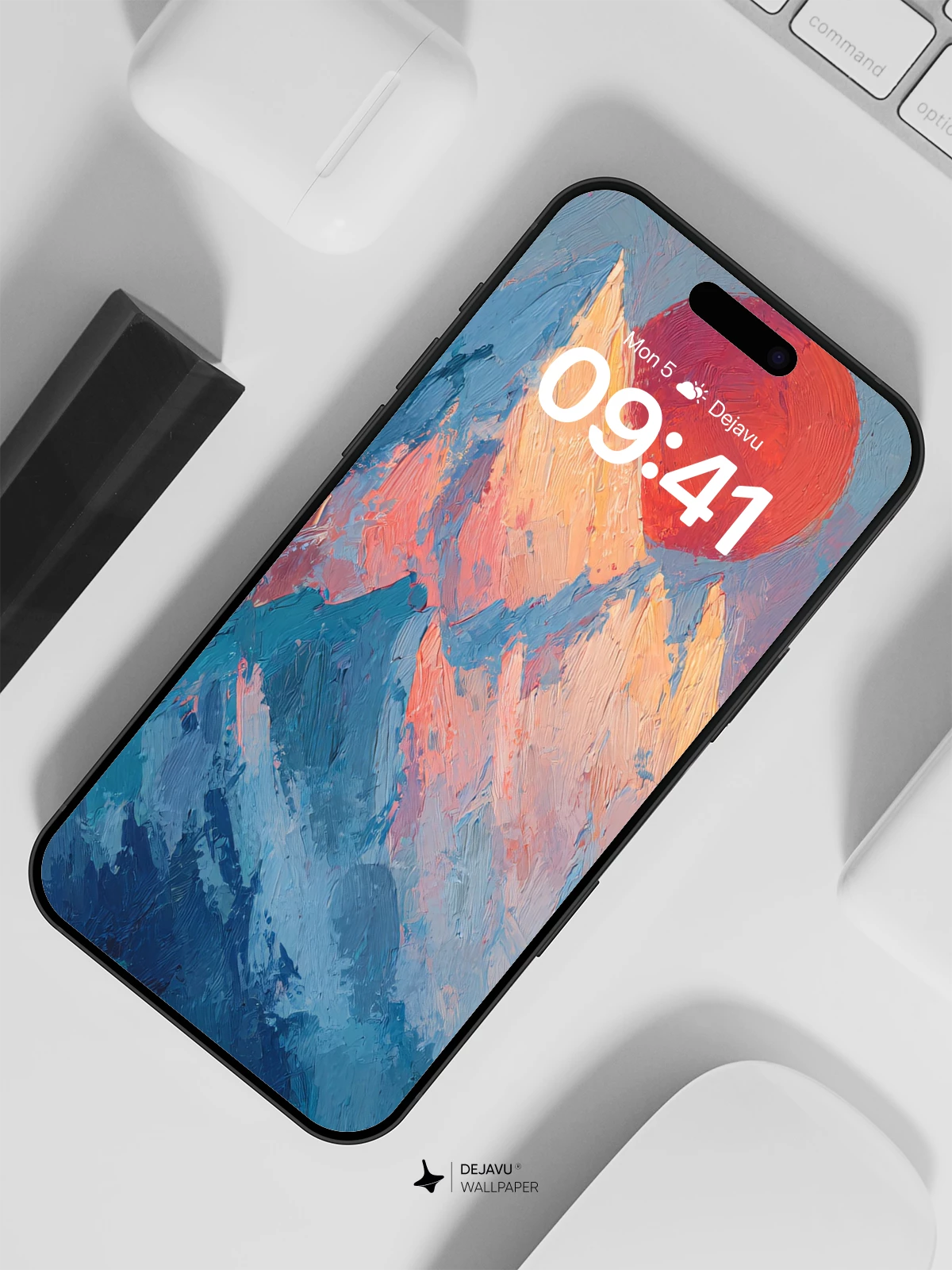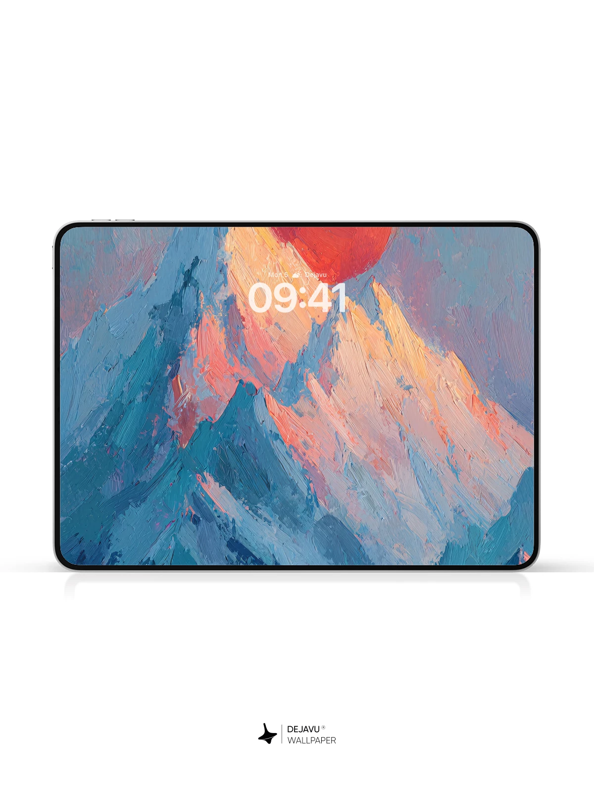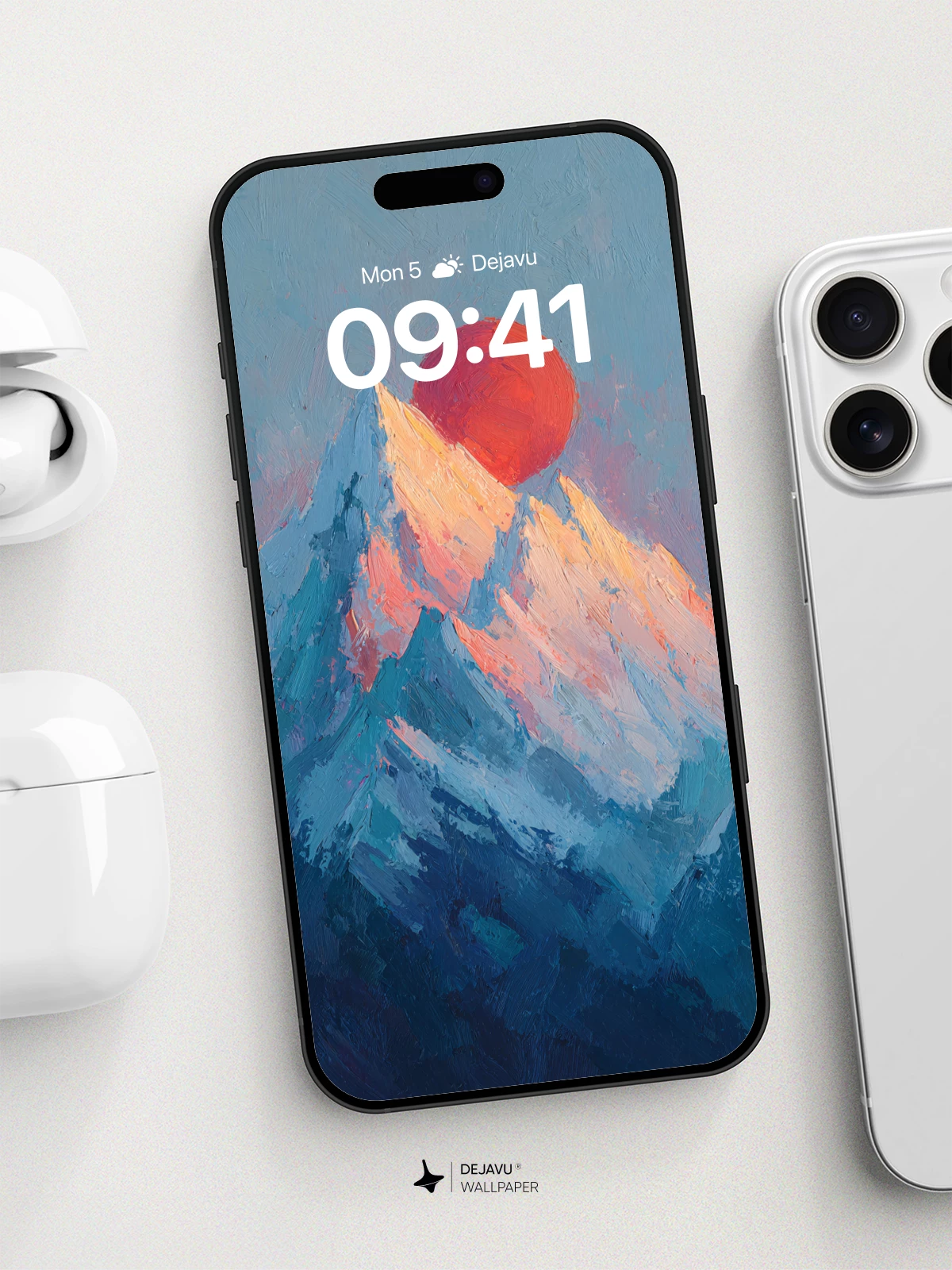 This 8K wallpaper captures the raw beauty of a snow-capped mountain range bathed in the warm glow of a rising red sun. Its textured brushstrokes and cool-to-warm color palette evoke calmness and awe, making it perfect for iPhone, Android, or tablet screens.