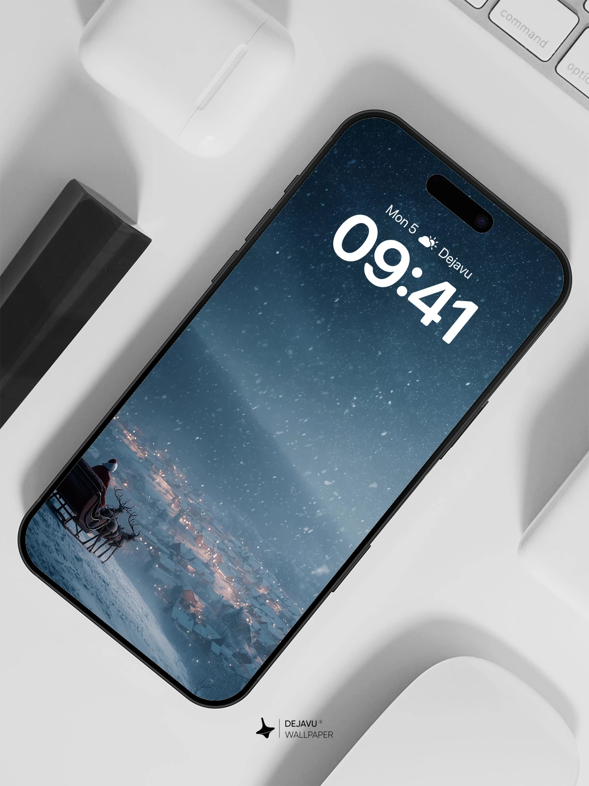 Under a celestial canopy of stars and falling snow, Santa’s sleigh silhouetted against the illuminated rooftops of a cozy town evokes timeless wonder. This enchanting scene blends fantasy and serenity, perfect for festive 8K wallpapers on iPhone, Android, or tablets. The cinematic depth and ethereal lighting make it ideal for immersive mobile backgrounds during the holiday season.