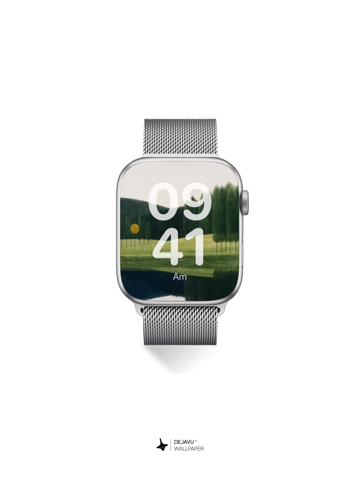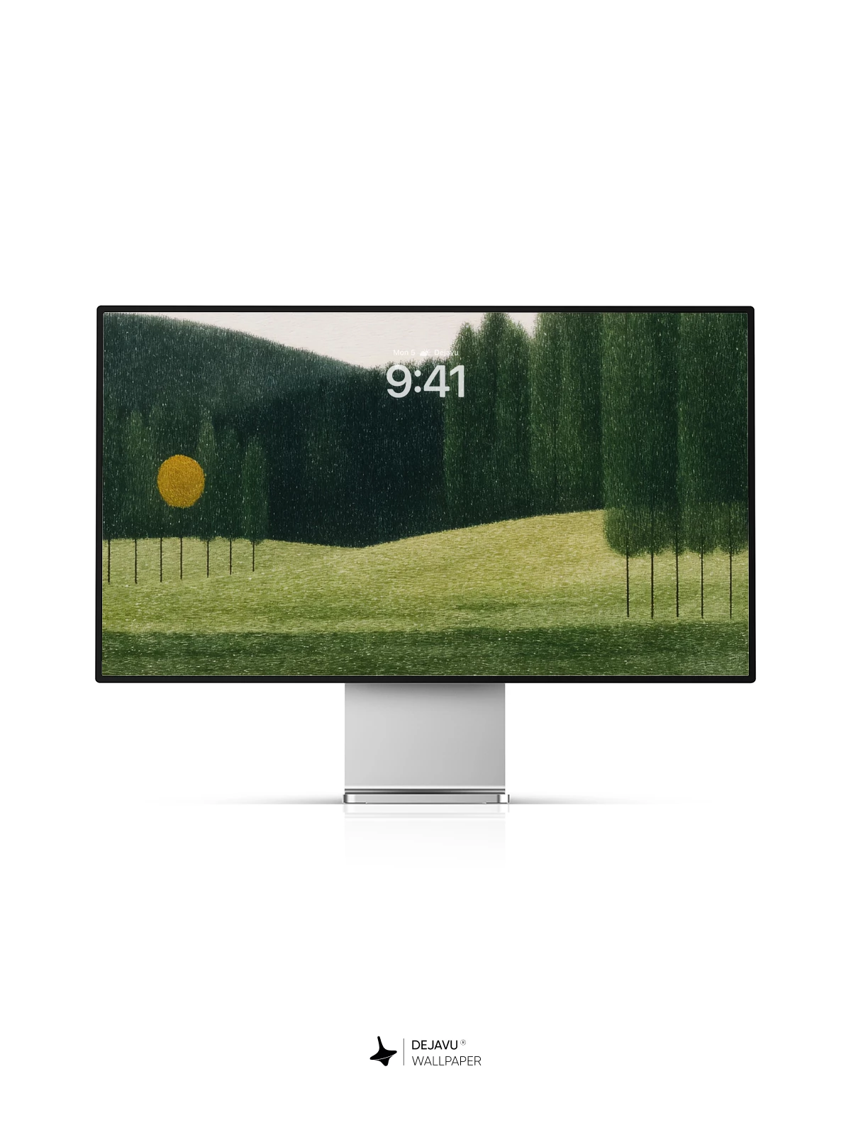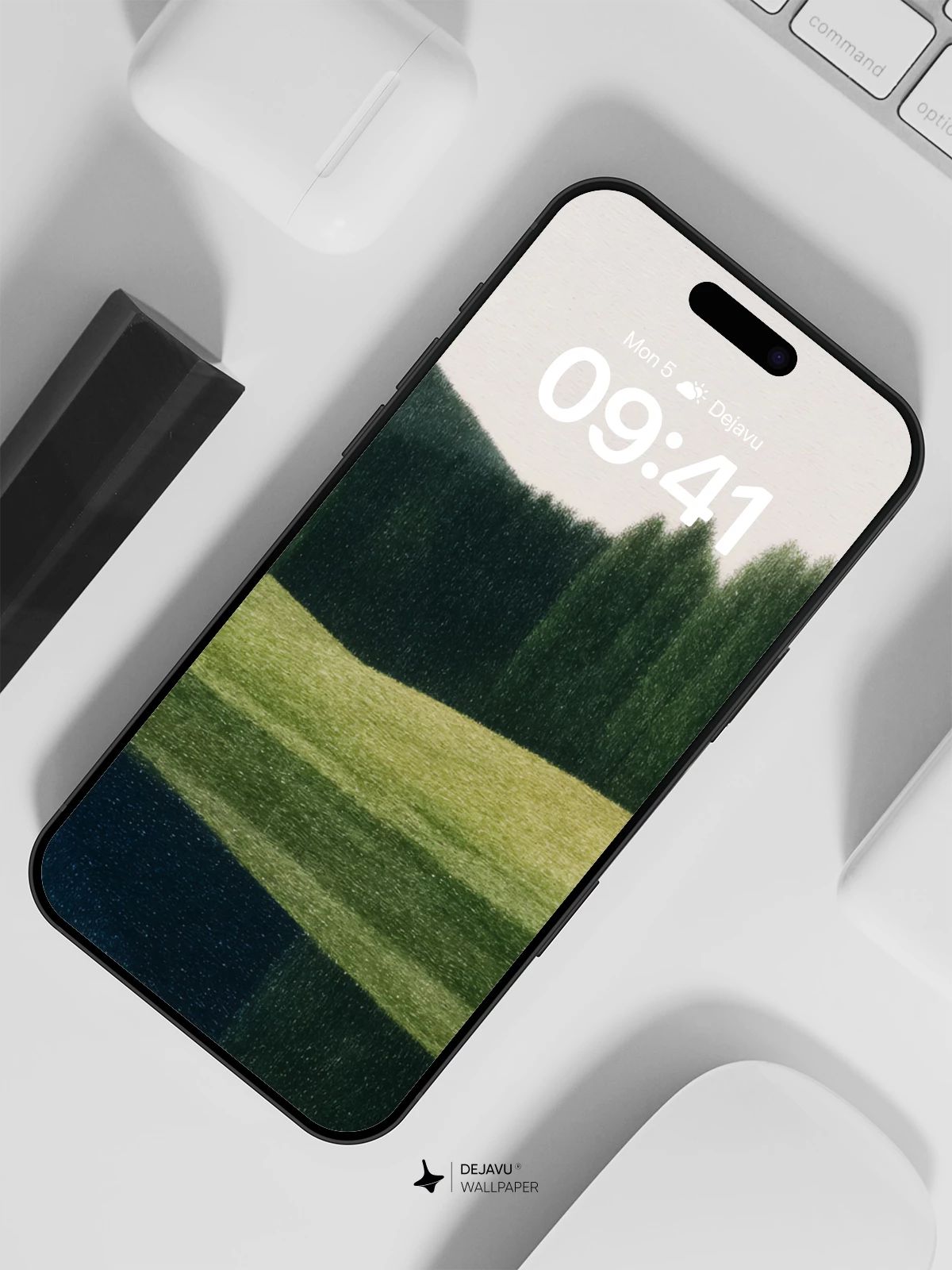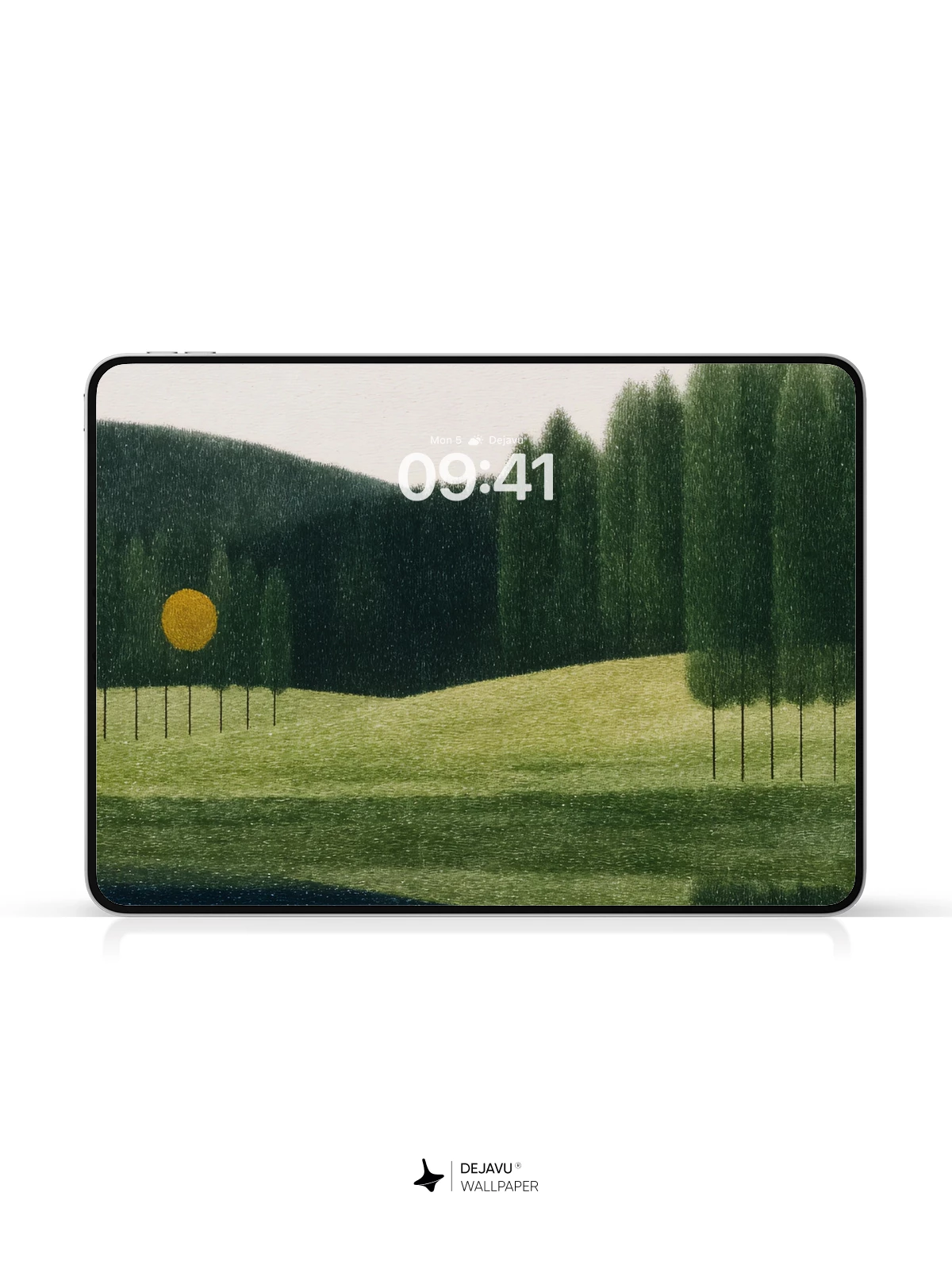 This calming landscape features a serene forest silhouette reflected in still waters, with a soft golden sun peeking through the trees. Inspired by minimalist nature art, it evokes peace and quiet contemplation, ideal for iPhone, Android, or tablet screens. The harmonious blend of greens, grays, and subtle gold creates a soothing visual retreat, making it a perfect high-resolution 8K wallpaper for modern mobile devices.