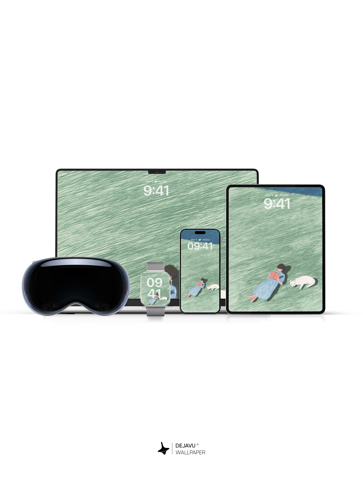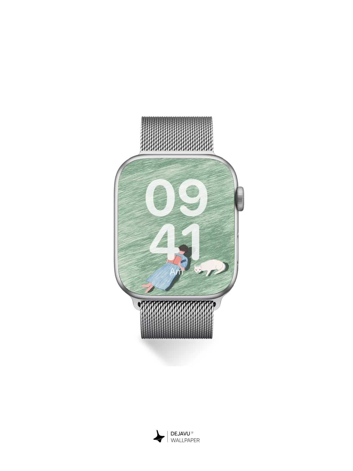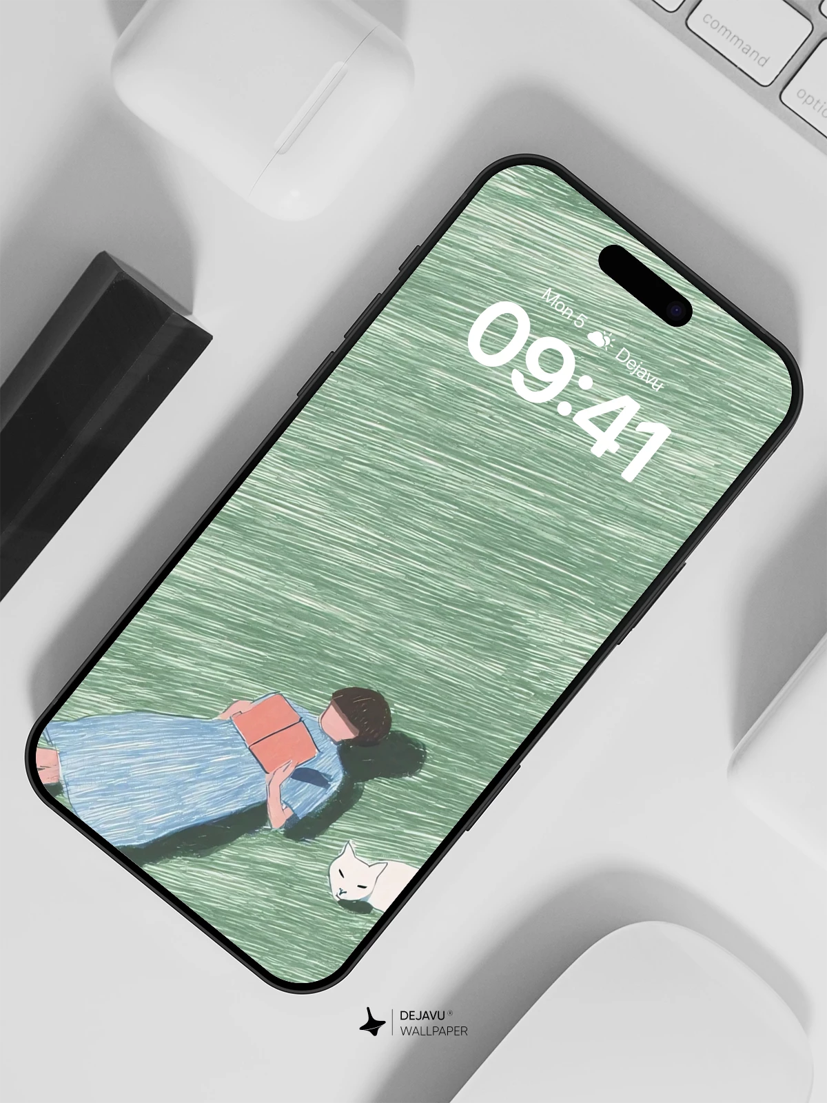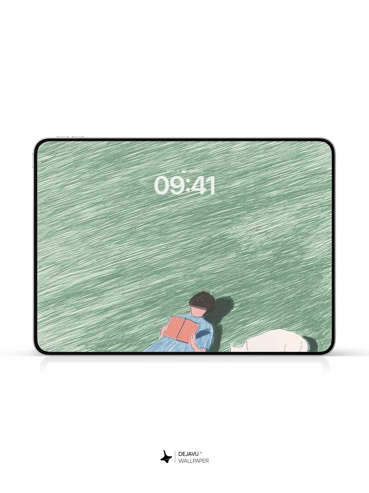This tranquil illustration evokes a quiet escape into nature, where time slows and stillness reigns. A lone figure lies on a grassy expanse, absorbed in a book, while a gentle white cat rests nearby—both bathed in the soft light of a calm day. The textured, painterly style gives depth and emotion to the scene, reminiscent of modern watercolor minimalism. Perfect for 8K phone wallpapers on iPhone or Android, this image brings serenity to your screen with its soothing greens, subtle shadows, and poetic simplicity. Let this moment of solitude and companionship become your daily visual retreat.