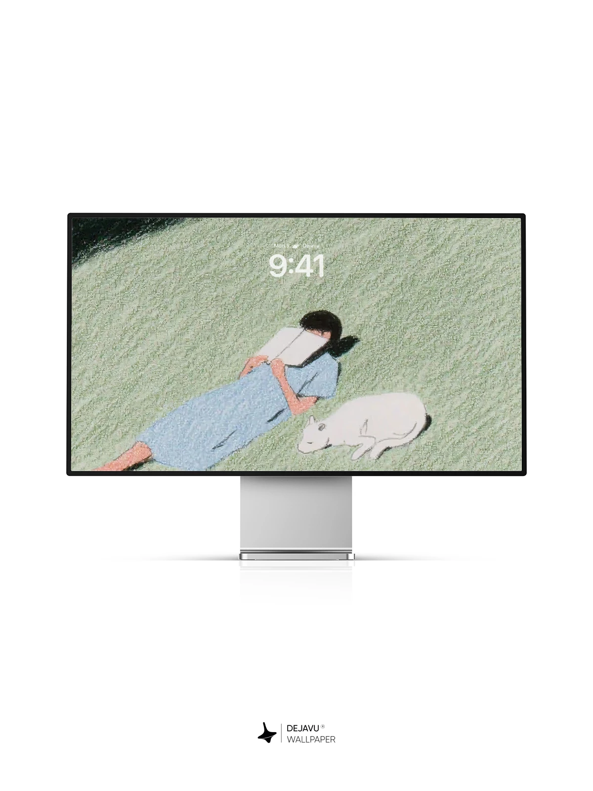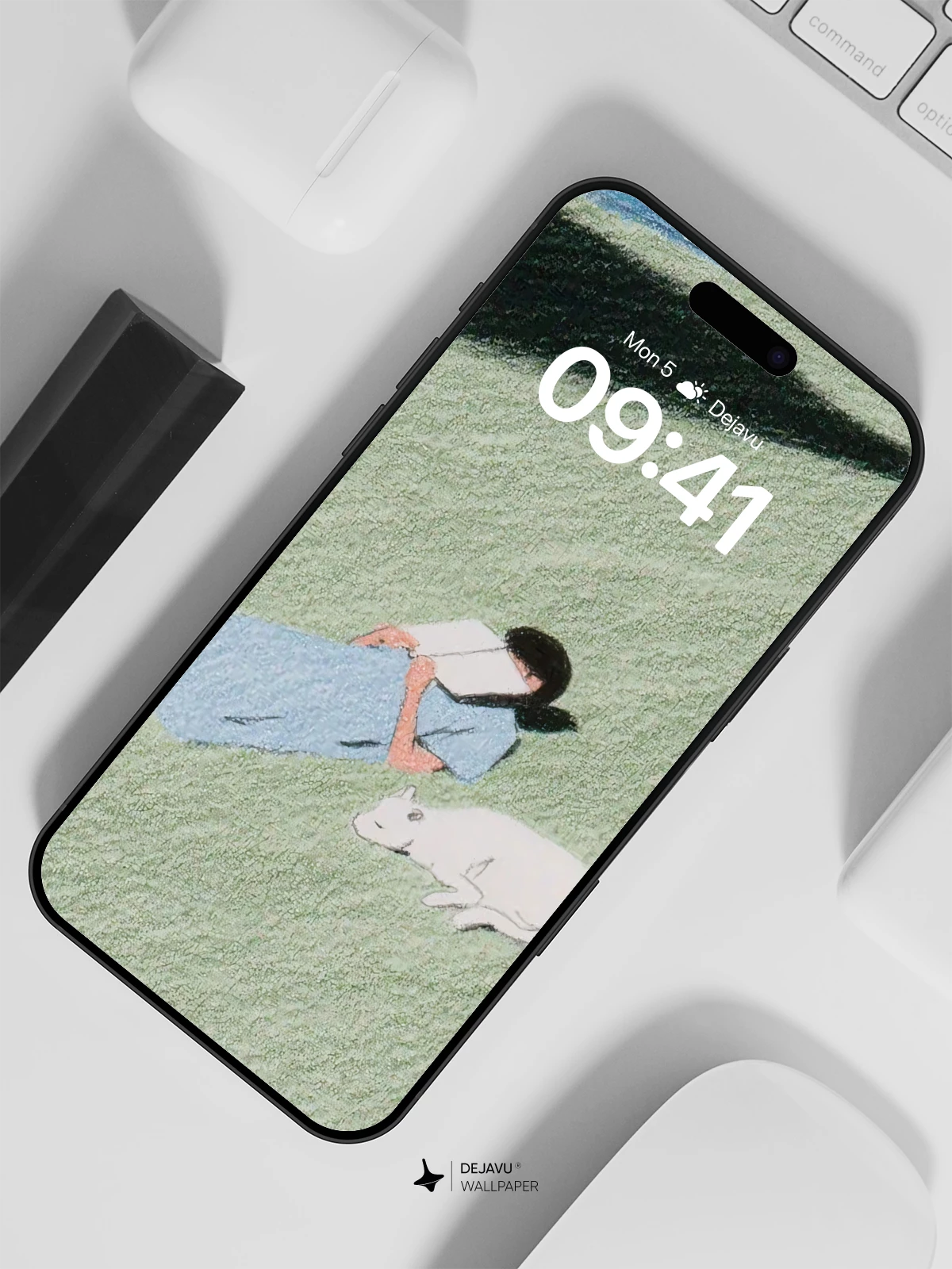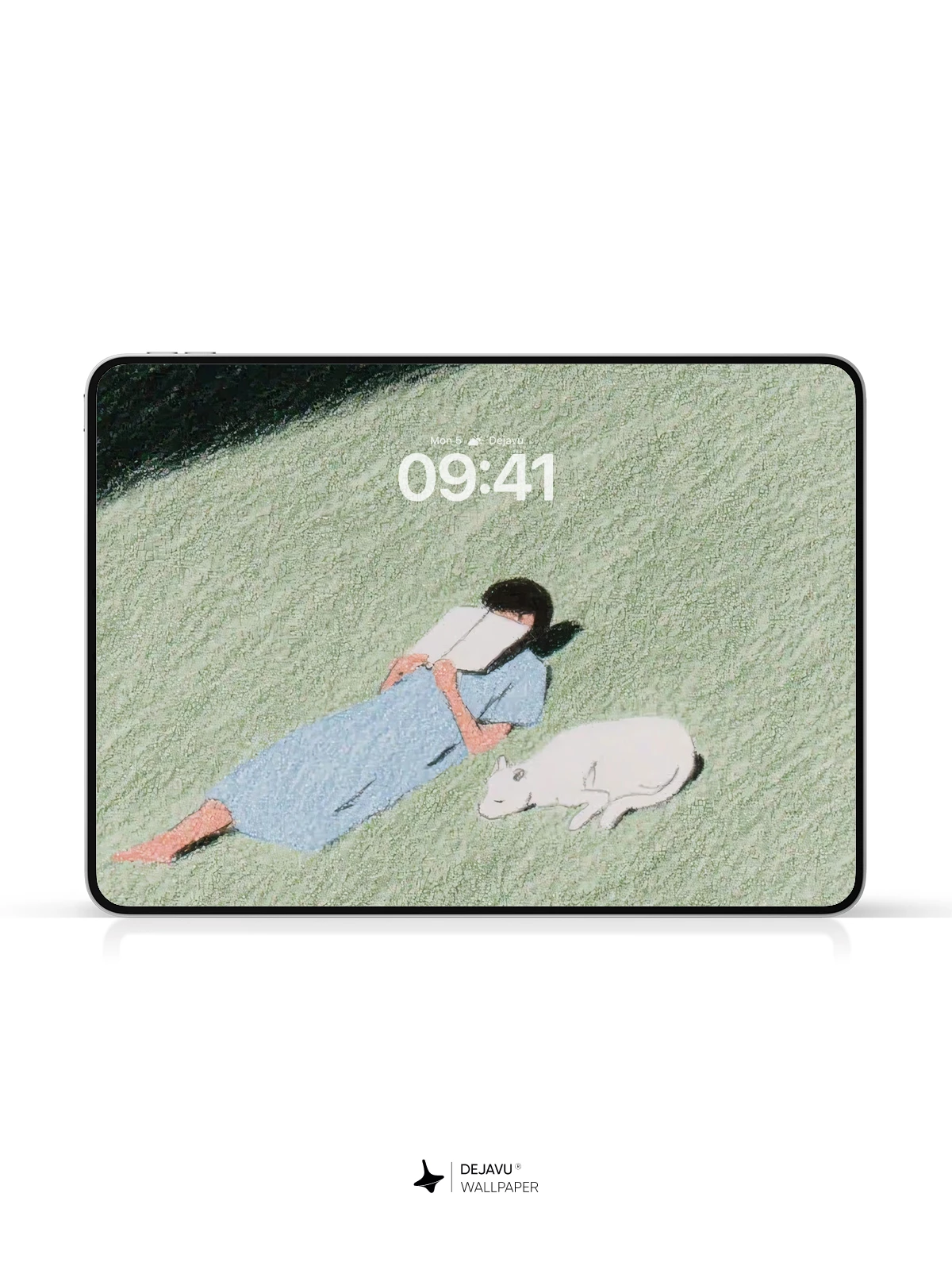 This tranquil illustration captures a quiet afternoon on a grassy slope, where a woman in a blue dress lies reading while a white cat rests nearby. The soft textures and gentle shadows evoke a sense of stillness and harmony with nature. Inspired by the serene minimalism of Japanese animation, this 8K wallpaper is perfect for iPhone, Android, or tablet screens seeking elegance and emotional warmth.