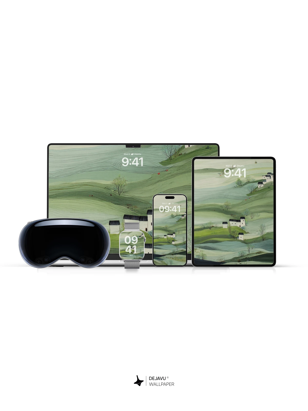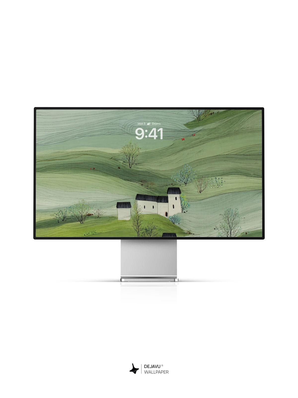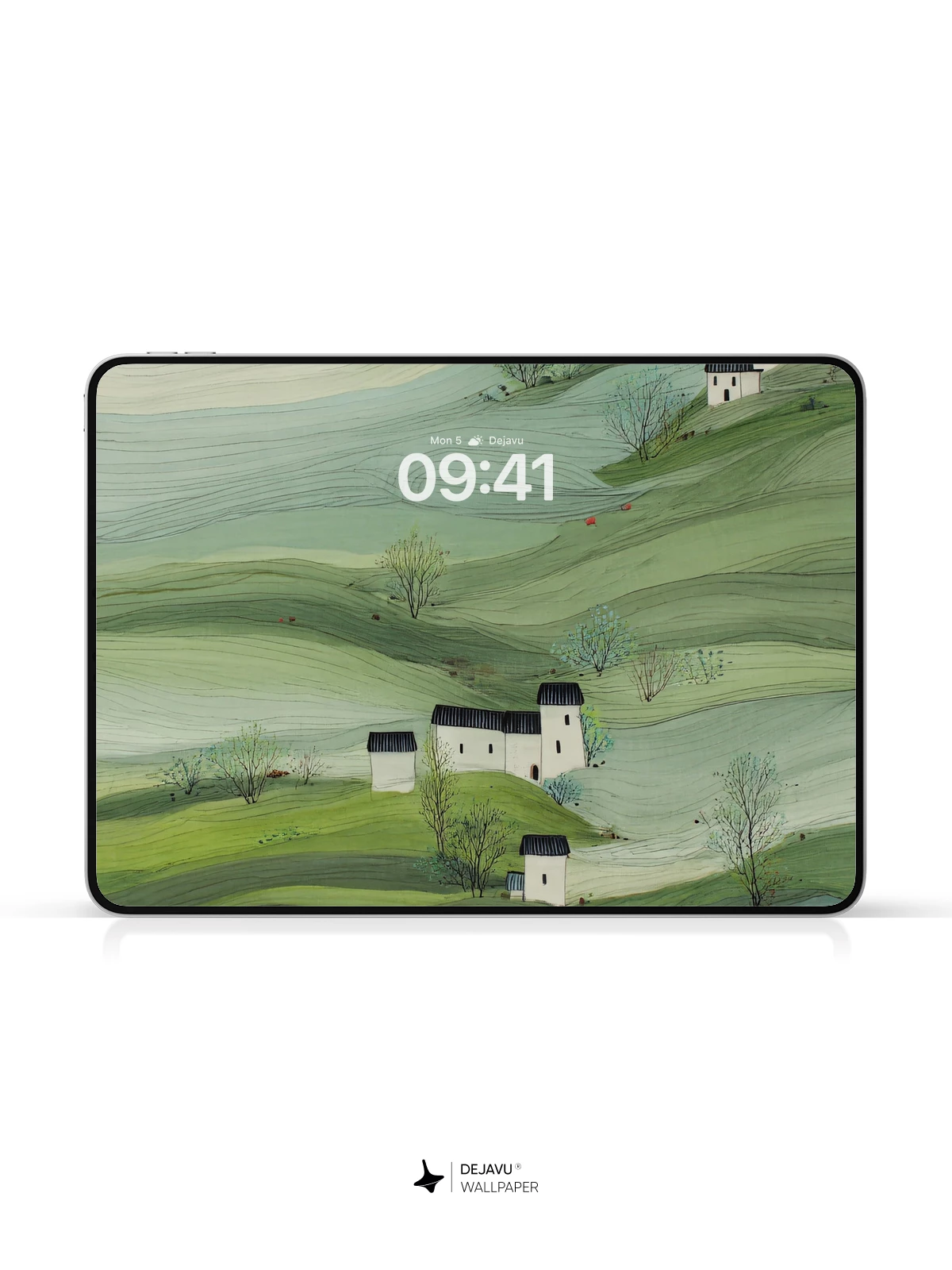 This 8K wallpaper features gentle, flowing green hills with subtle texture lines and scattered trees, creating a tranquil rural scene. The minimalist white houses with dark roofs add a touch of simplicity. Ideal for iPhone, Android, and tablets, it offers a peaceful escape into nature’s calm, enhancing your device with soothing aesthetics.