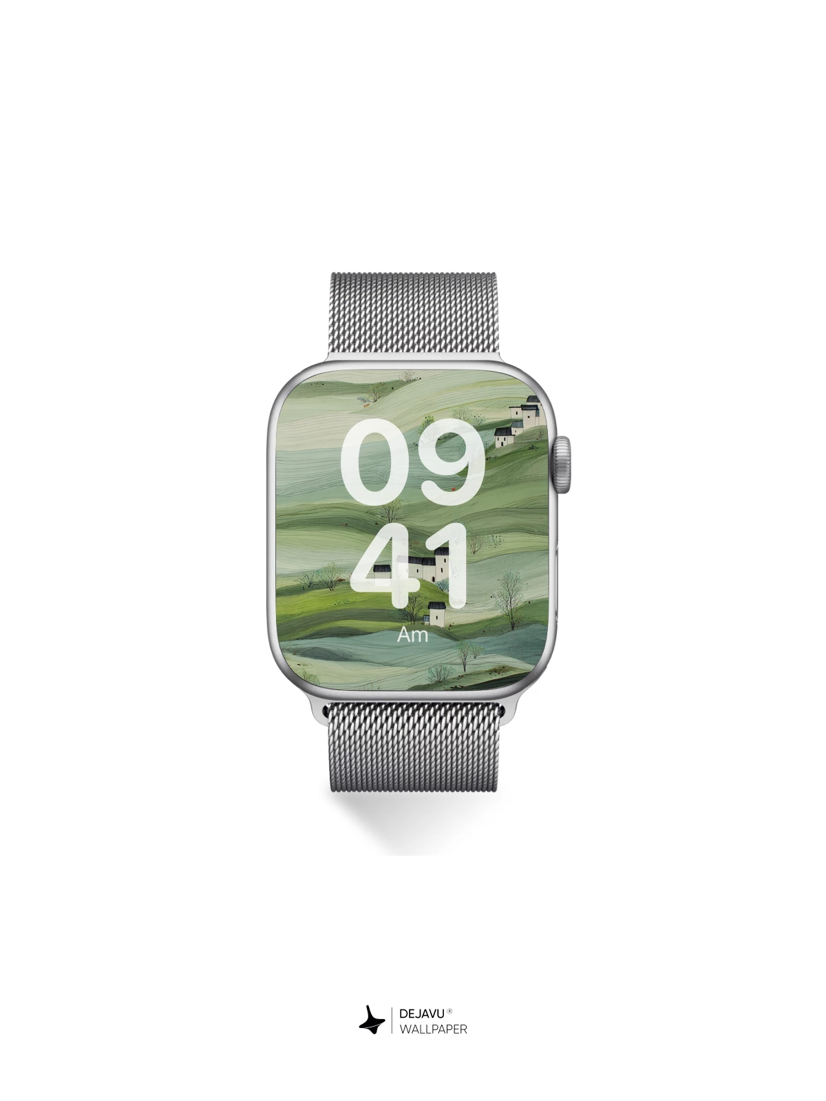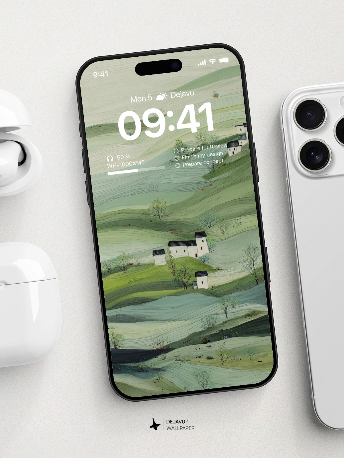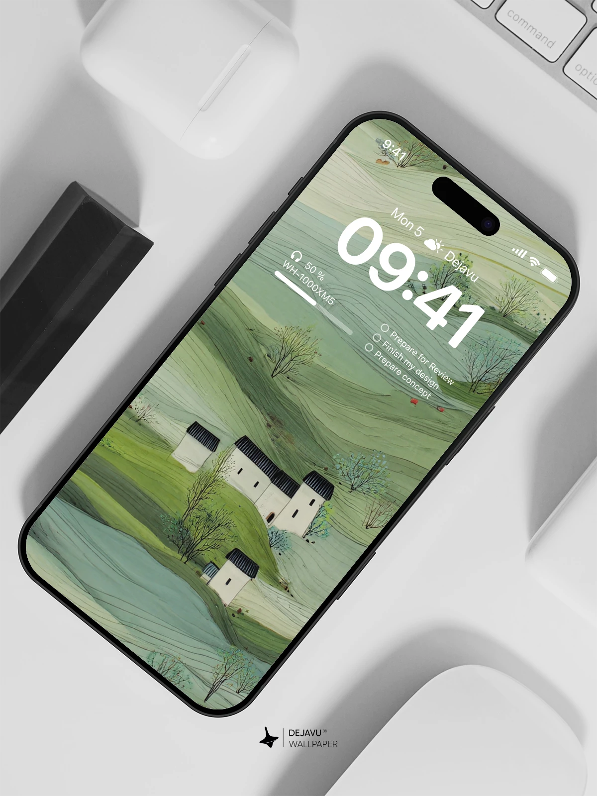 This 8K wallpaper features gentle, flowing green hills with subtle texture lines and scattered trees, creating a tranquil rural scene. The minimalist white houses with dark roofs add a touch of simplicity. Ideal for iPhone, Android, and tablets, it offers a peaceful escape into nature’s calm, enhancing your device with soothing aesthetics.