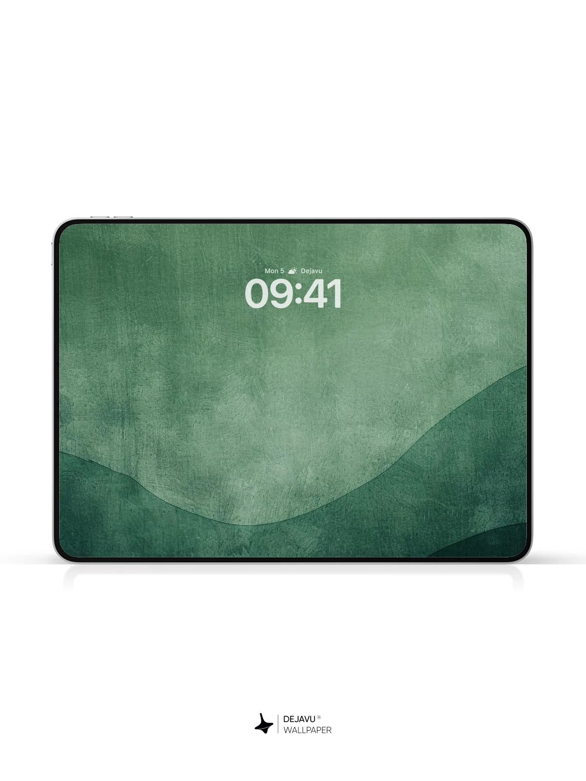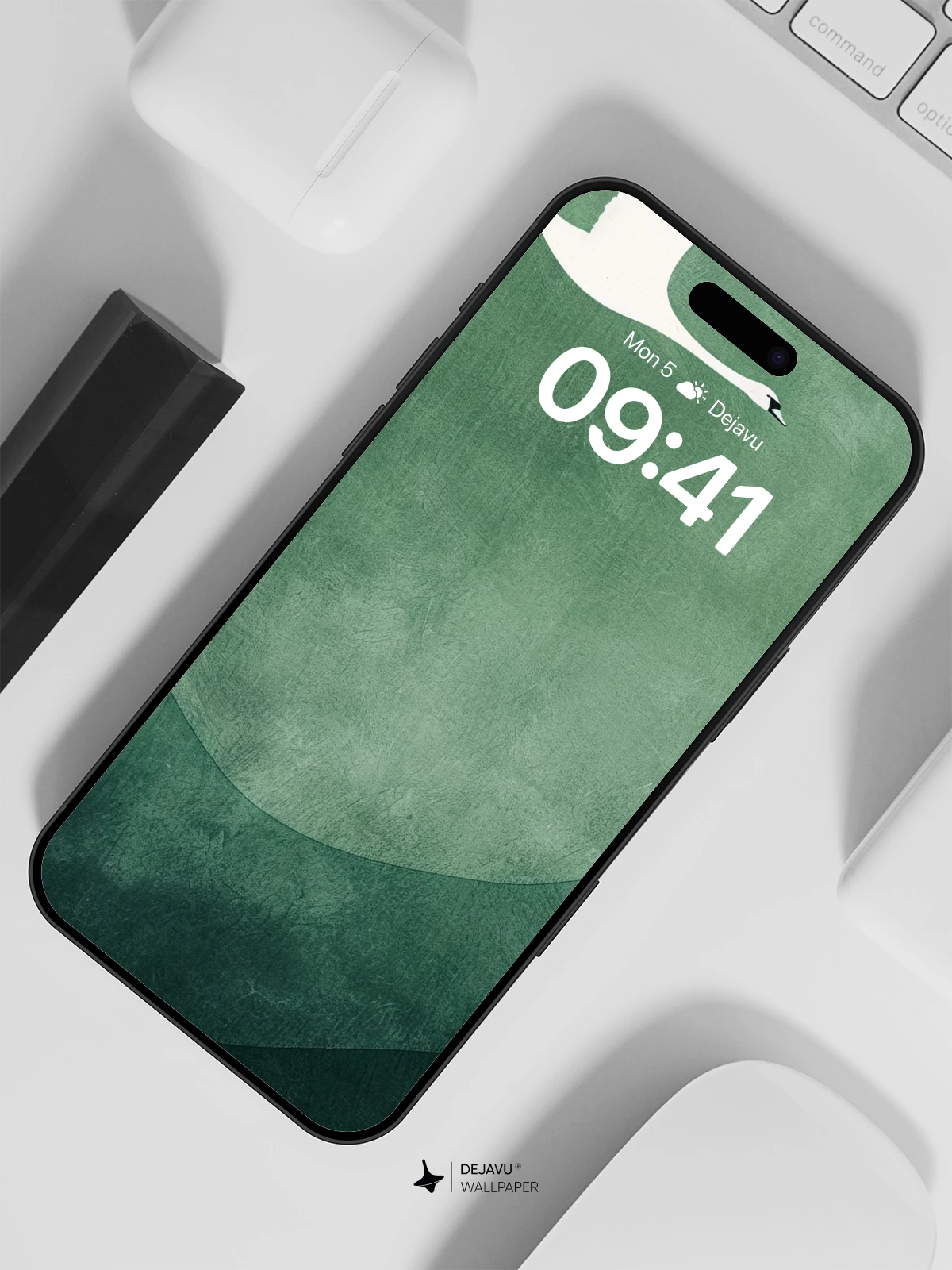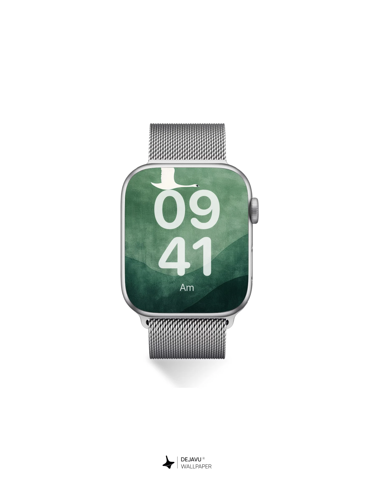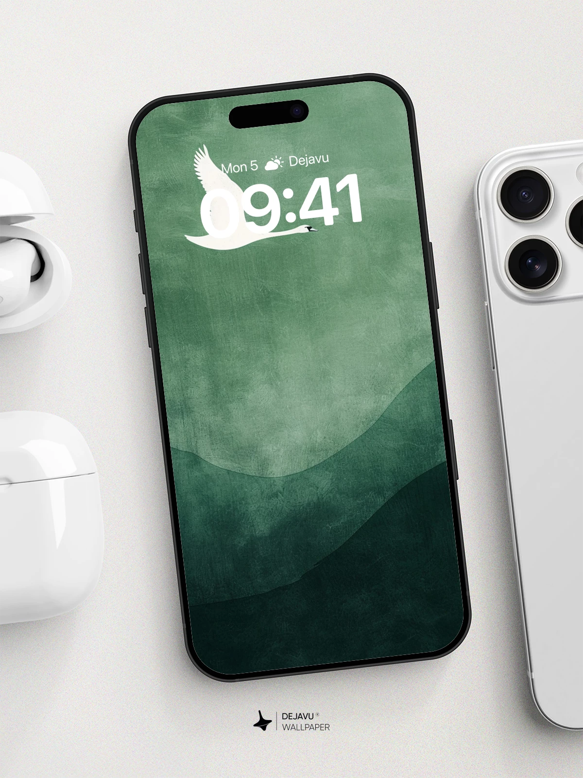 A single white swan flies across a textured green backdrop with rolling hills. The simple composition and muted palette create a peaceful, refined feel for your phone or tablet.