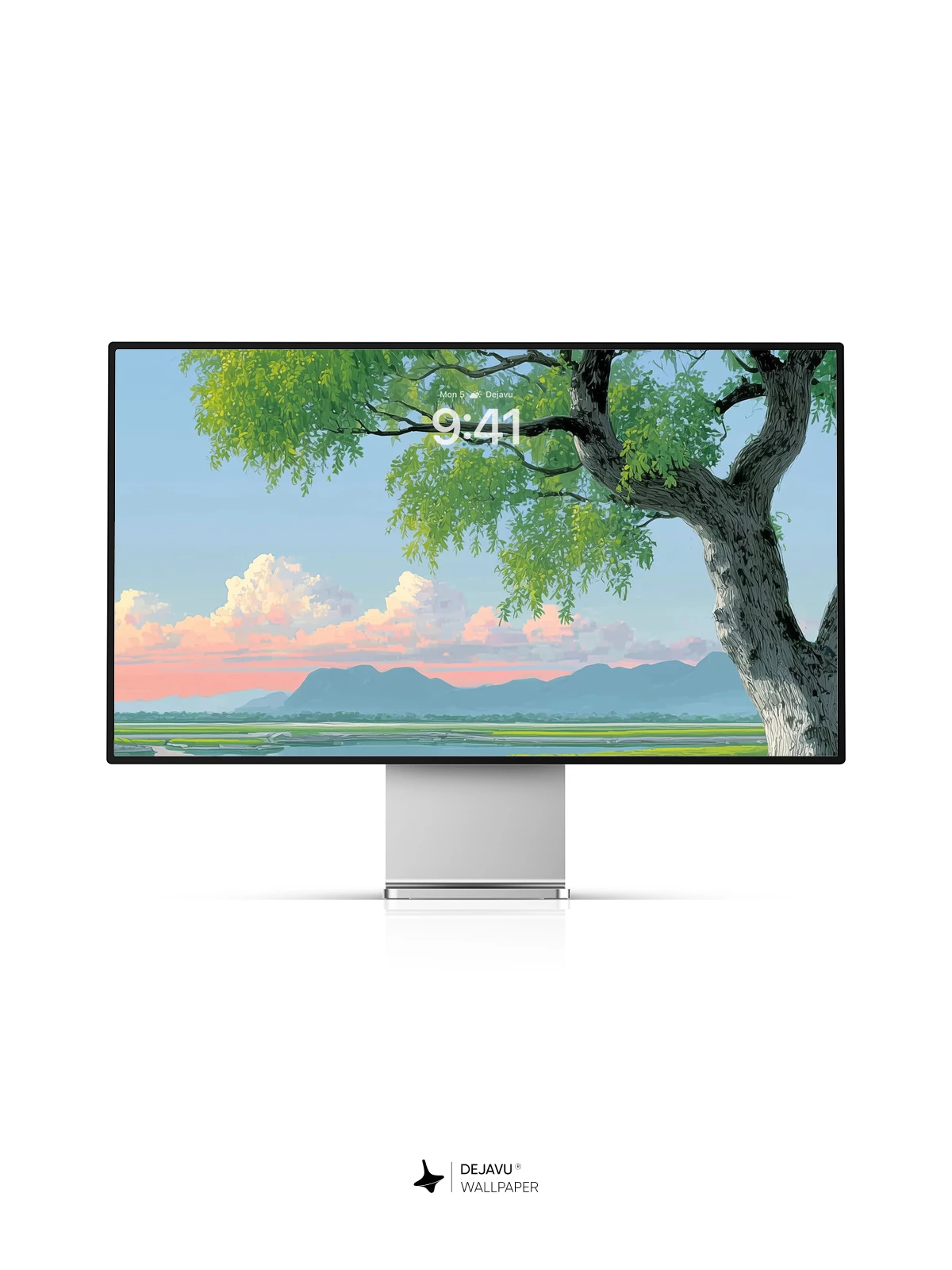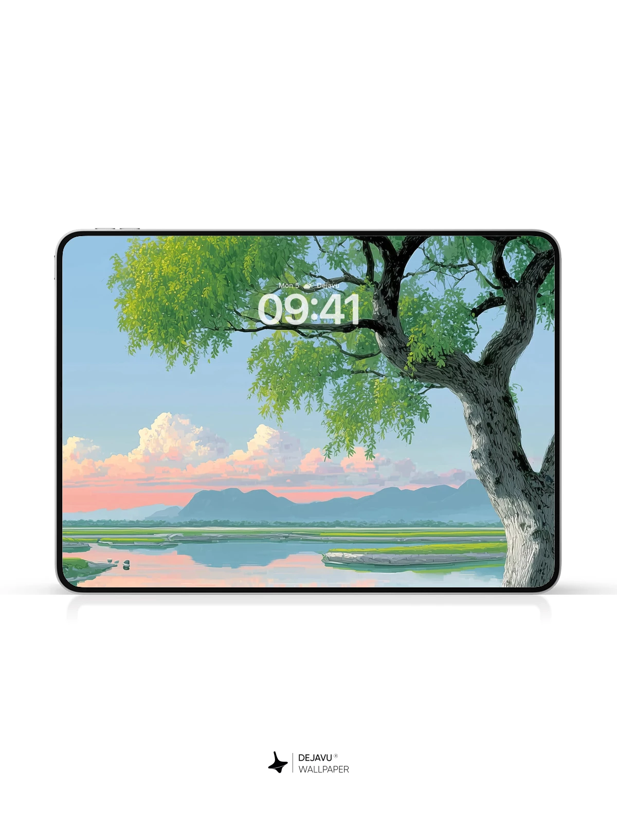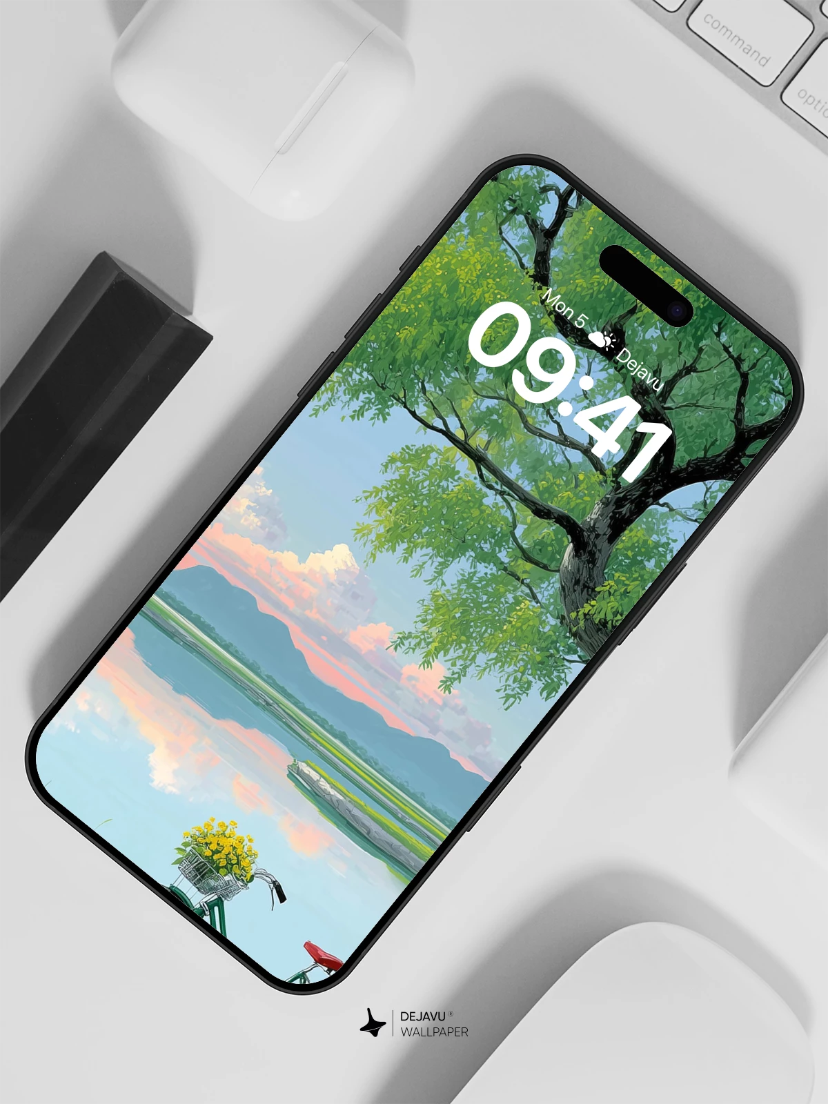 This stunning 8K wallpaper evokes a moment of quiet joy—a vintage green bicycle adorned with wildflowers leans gently against a sprawling tree beside a mirror-like lake reflecting the soft hues of twilight. Inspired by the pastoral elegance of impressionist landscapes, the scene blends serene natural beauty with a touch of whimsy, making it ideal for iPhone, Android, or tablet screens. The lush greens, golden blooms, and distant mountains create a dreamy escape that brings peace to any device.
