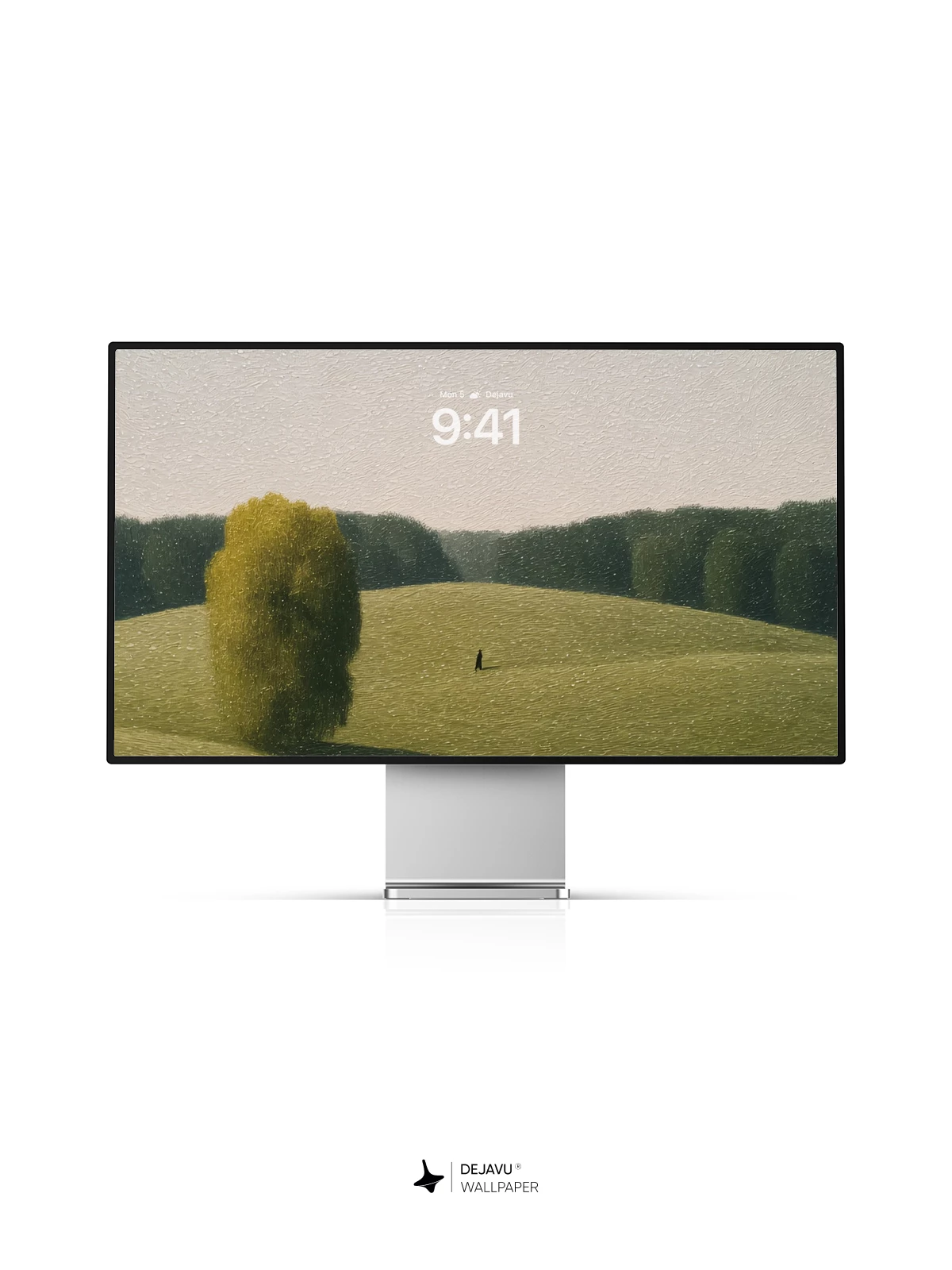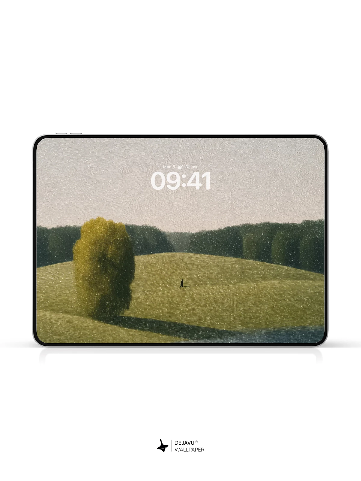This serene landscape evokes a quiet sense of solitude and timeless beauty, with rolling green hills, a solitary golden tree, and a distant figure walking toward the horizon. The soft, diffused lighting and gentle shadows create a dreamlike atmosphere, reminiscent of modern impressionist minimalism. Designed for clarity and emotional depth, this 8K wallpaper is ideal for iPhone, Android, and tablets, offering a peaceful backdrop that enhances any device’s screen with natural elegance.