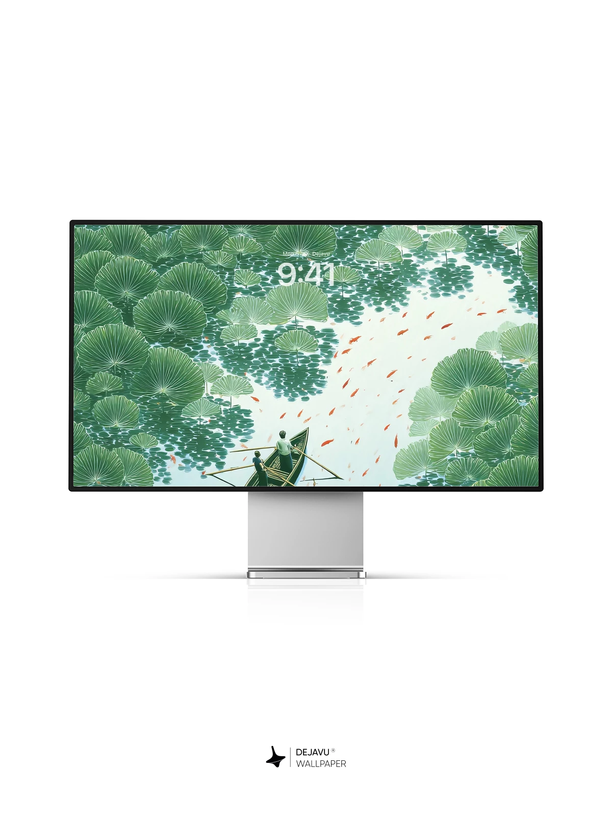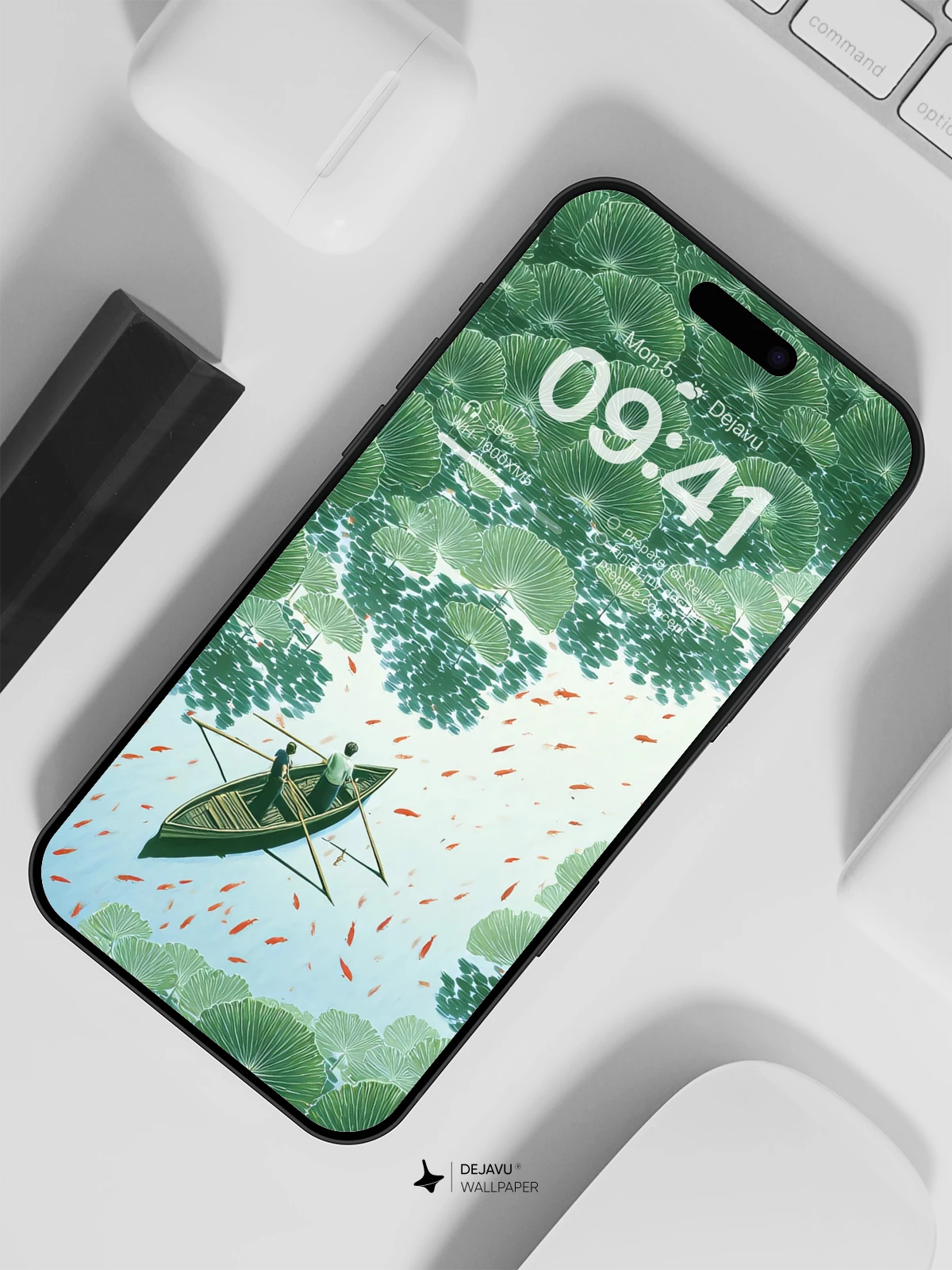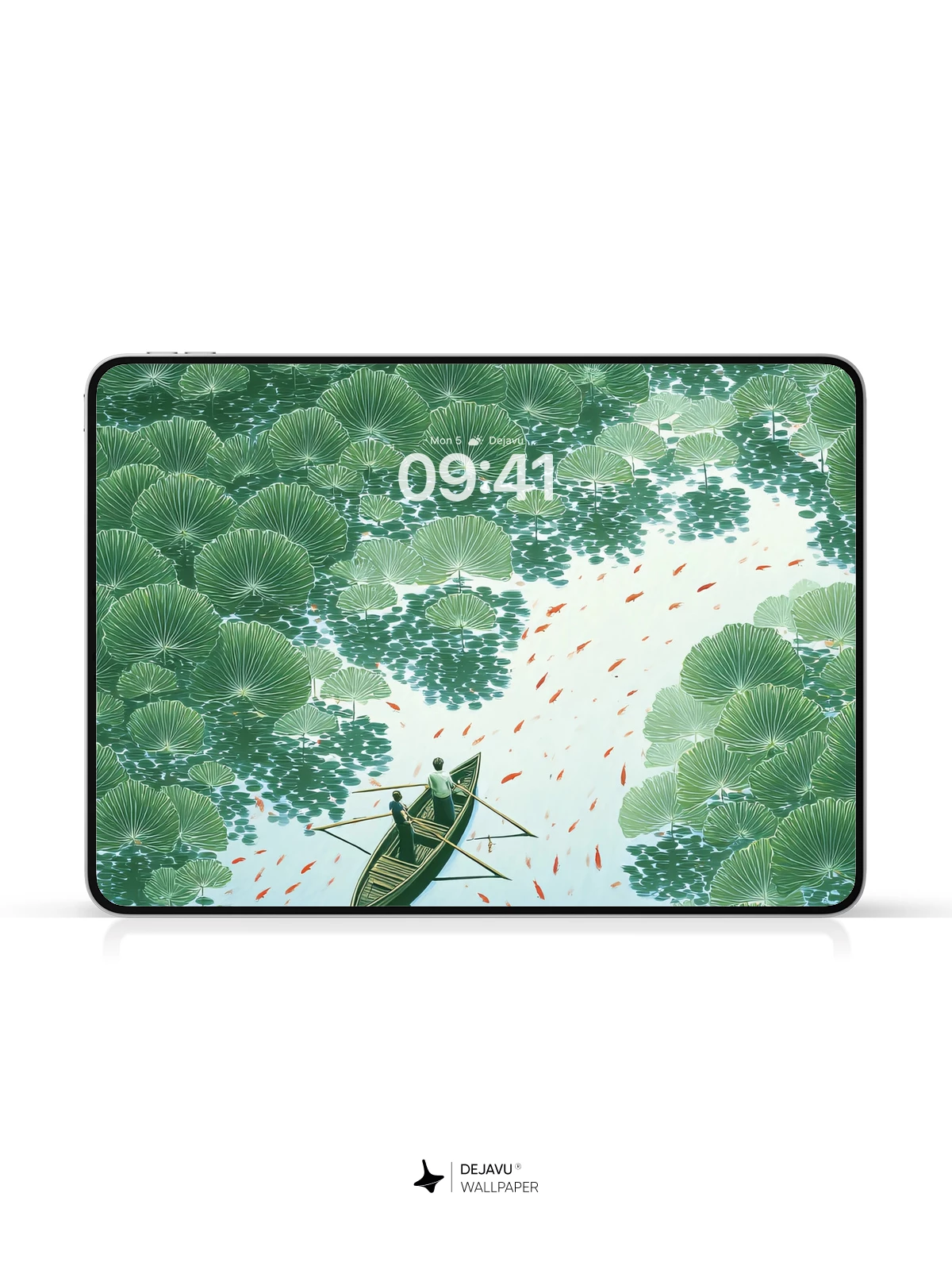 This stunning 8K wallpaper captures a peaceful journey across a vast lotus pond, where a small wooden boat drifts through emerald lily pads under a soft, dappled light. Inspired by the serene compositions of traditional Japanese woodblock prints, the scene evokes quiet contemplation and harmony with nature. Vibrant red fish swim beneath the surface, adding life to the still waters. Ideal for iPhone, Android, and tablets, this high-resolution artwork transforms your device into a window to a meditative world.