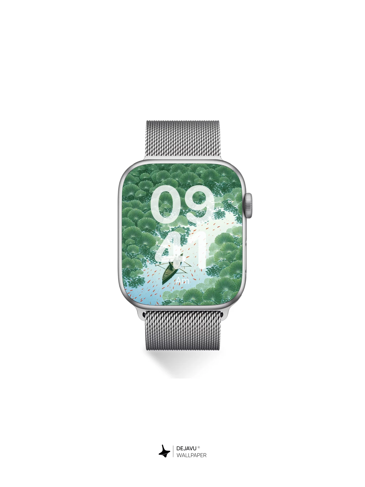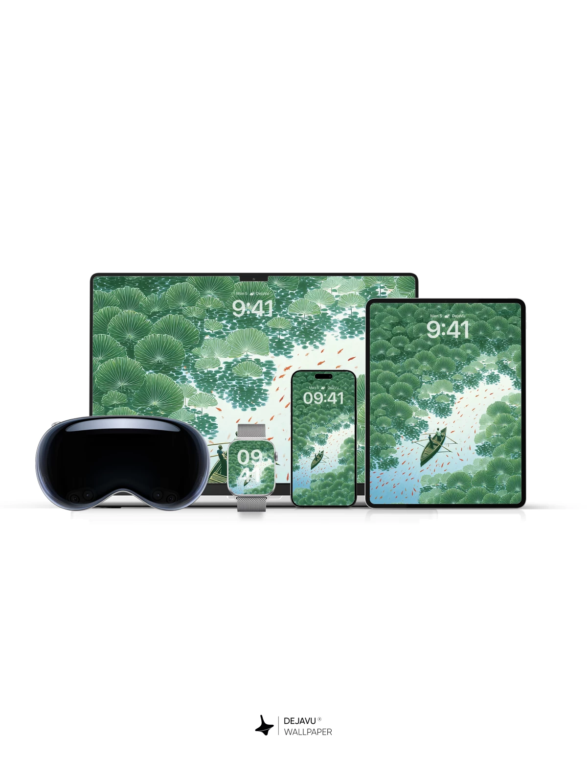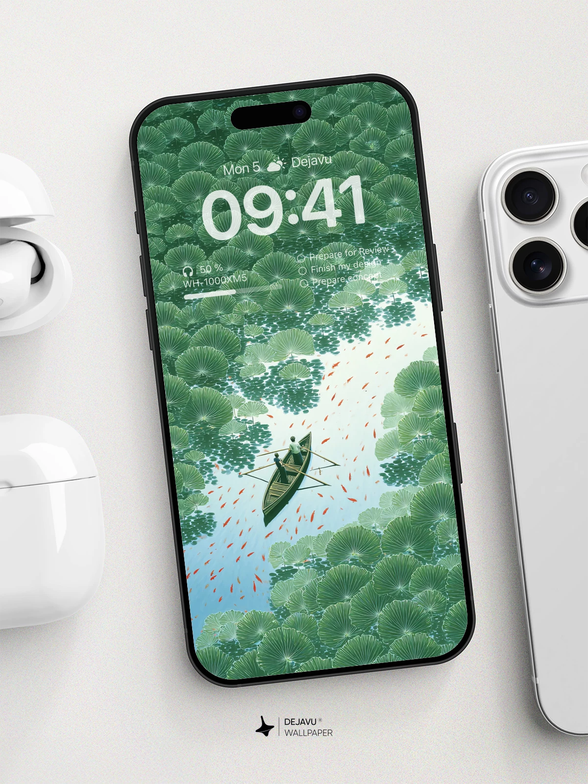This stunning 8K wallpaper captures a peaceful journey across a vast lotus pond, where a small wooden boat drifts through emerald lily pads under a soft, dappled light. Inspired by the serene compositions of traditional Japanese woodblock prints, the scene evokes quiet contemplation and harmony with nature. Vibrant red fish swim beneath the surface, adding life to the still waters. Ideal for iPhone, Android, and tablets, this high-resolution artwork transforms your device into a window to a meditative world.