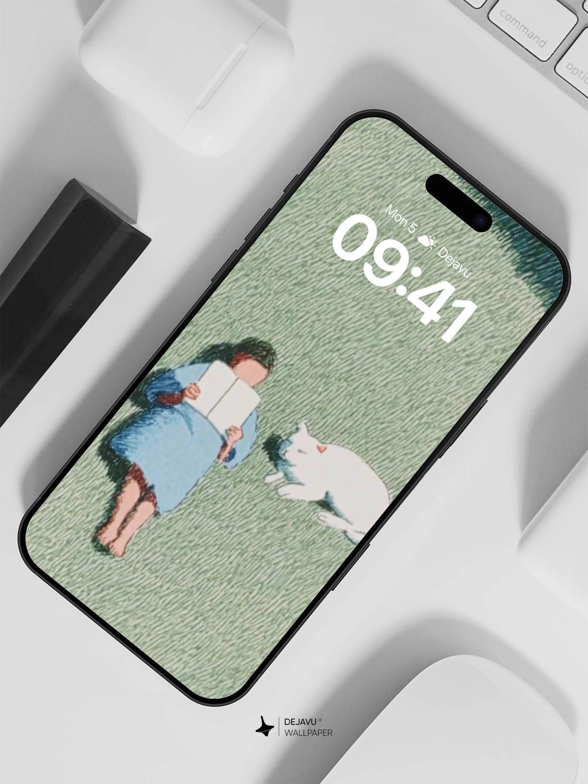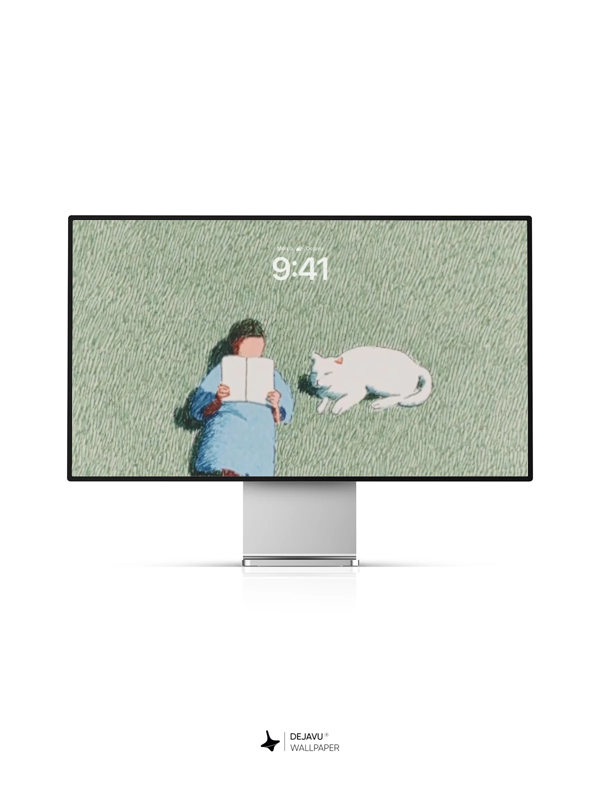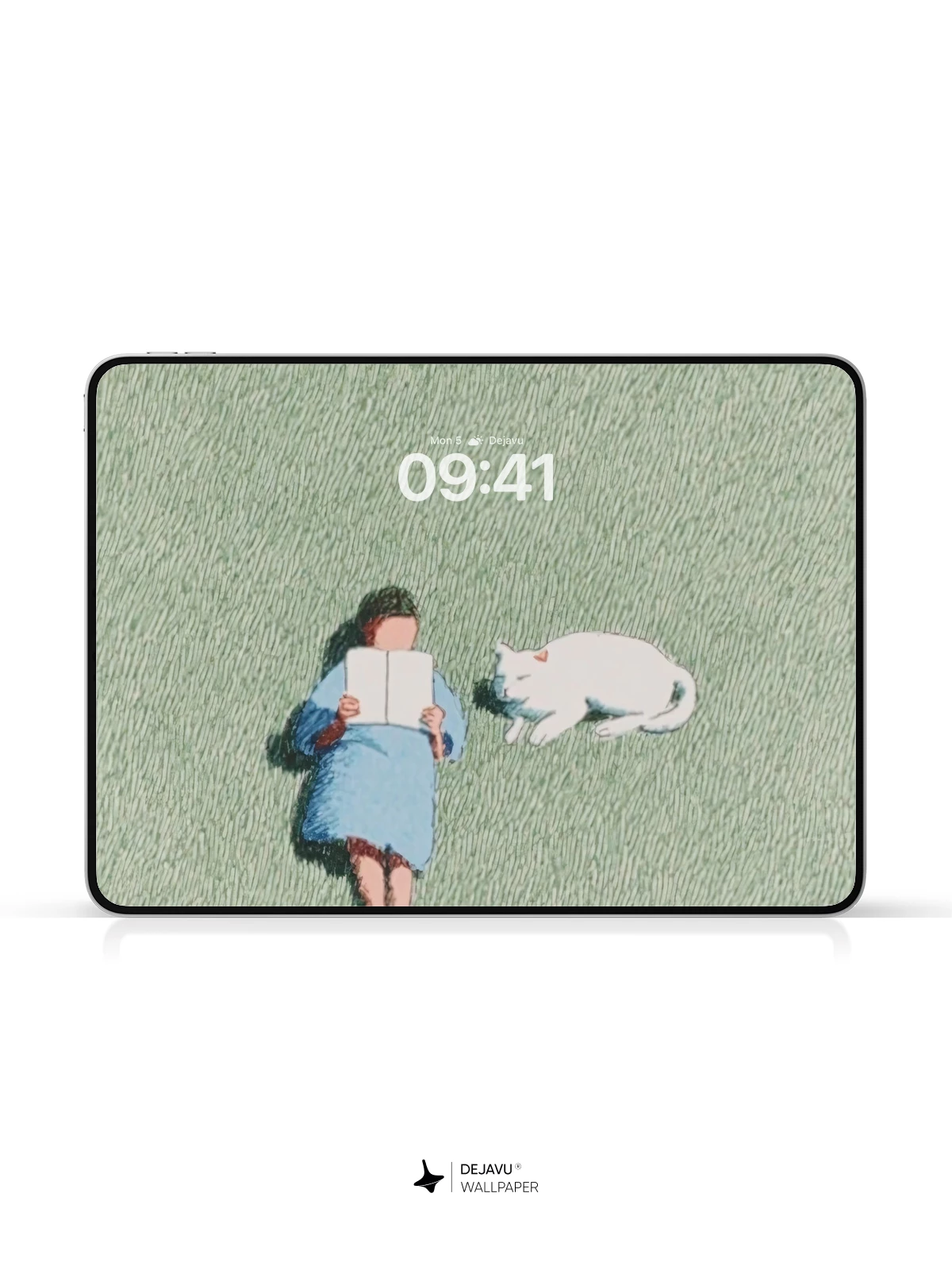 This tranquil illustration captures a quiet moment of solitude and companionship, with a figure lying on grass beneath a shadowed sky, absorbed in a book while a white cat rests nearby. The soft, tactile texture and gentle color palette evoke a dreamlike calm, reminiscent of delicate watercolor meets textile art. Ideal as a soothing 8K wallpaper for iPhone, Android, or tablets, this image brings a sense of peace and mindfulness to your digital space.