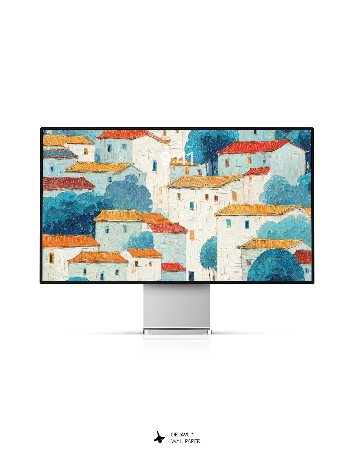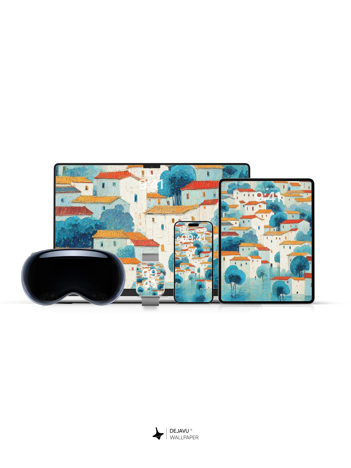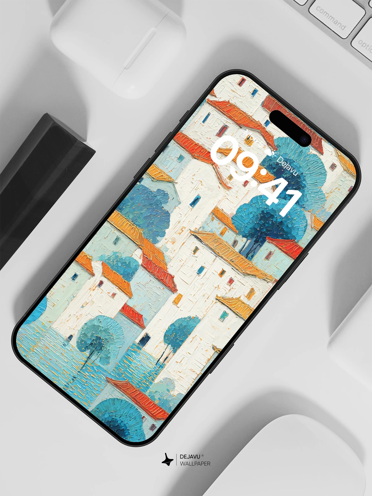 This enchanting 8K wallpaper captures a whimsical hillside village nestled among vibrant blue trees, with white houses and terracotta roofs mirrored in rippling waters below. Evoking the delicate brushwork of impressionist art, the scene radiates calm and timeless beauty. Ideal for iPhone, Android, or tablet screens, it transforms your device into a portal of serenity—where every glance feels like a quiet retreat into nature’s harmony.
