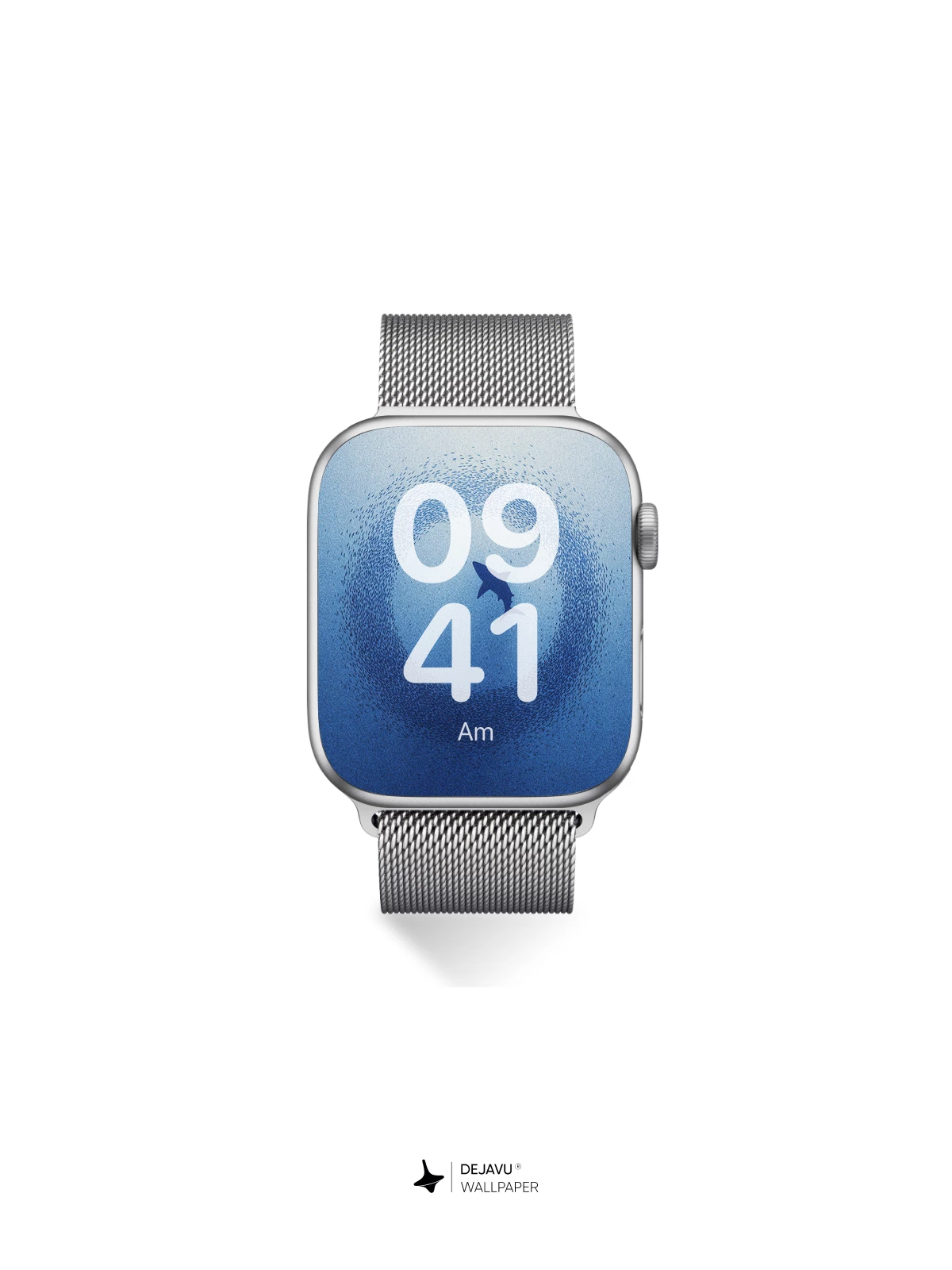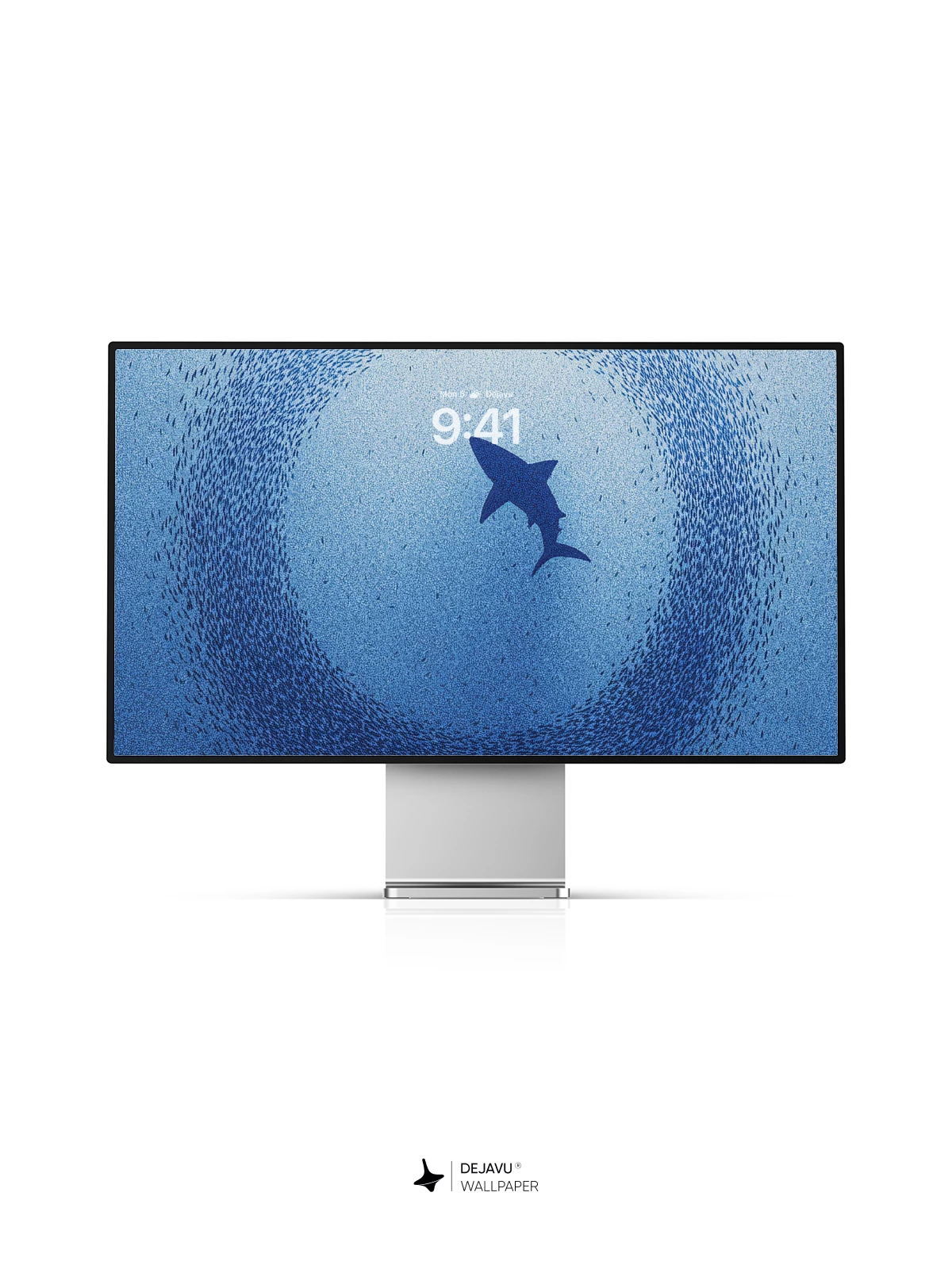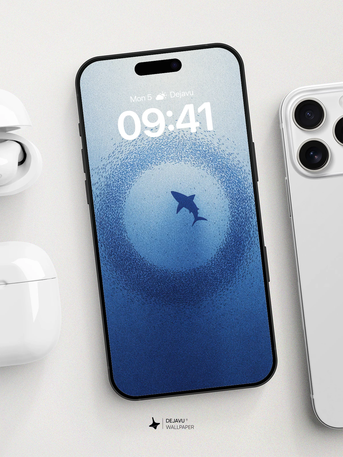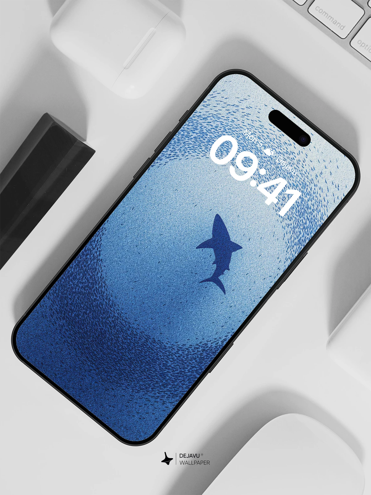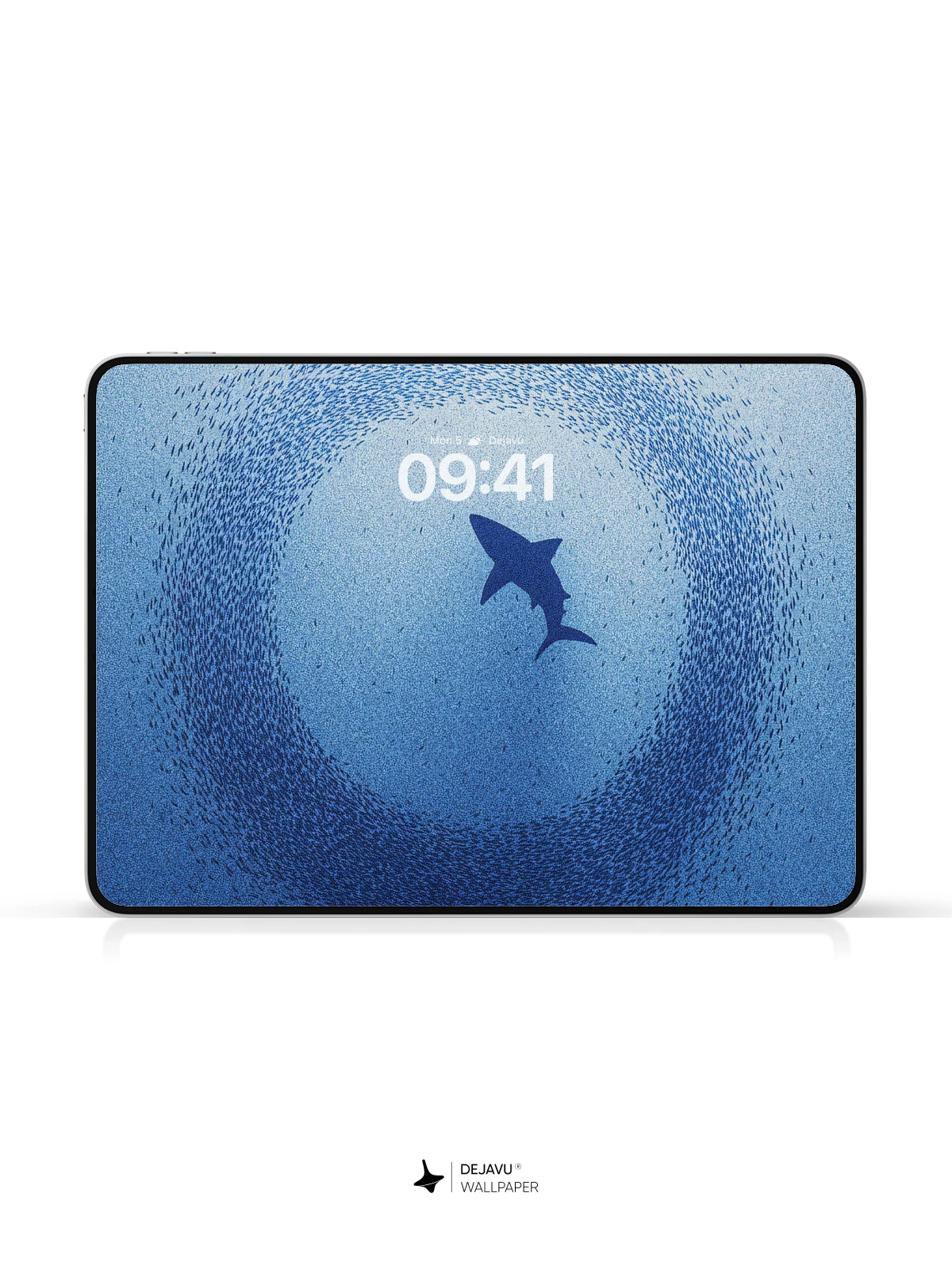 This wallpaper captures a predator moving through a tight school of fish. The circular formation frames the shark, drawing the eye inward. The cool blue palette and high resolution make it a clean, dramatic choice for mobile screens and tablets.
