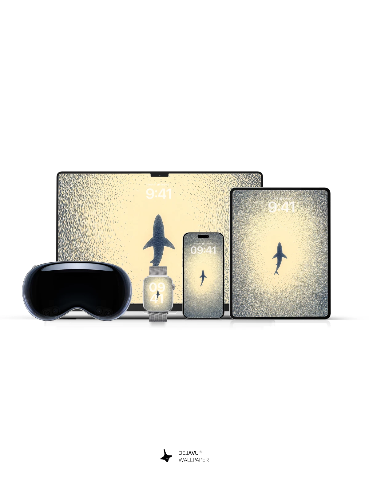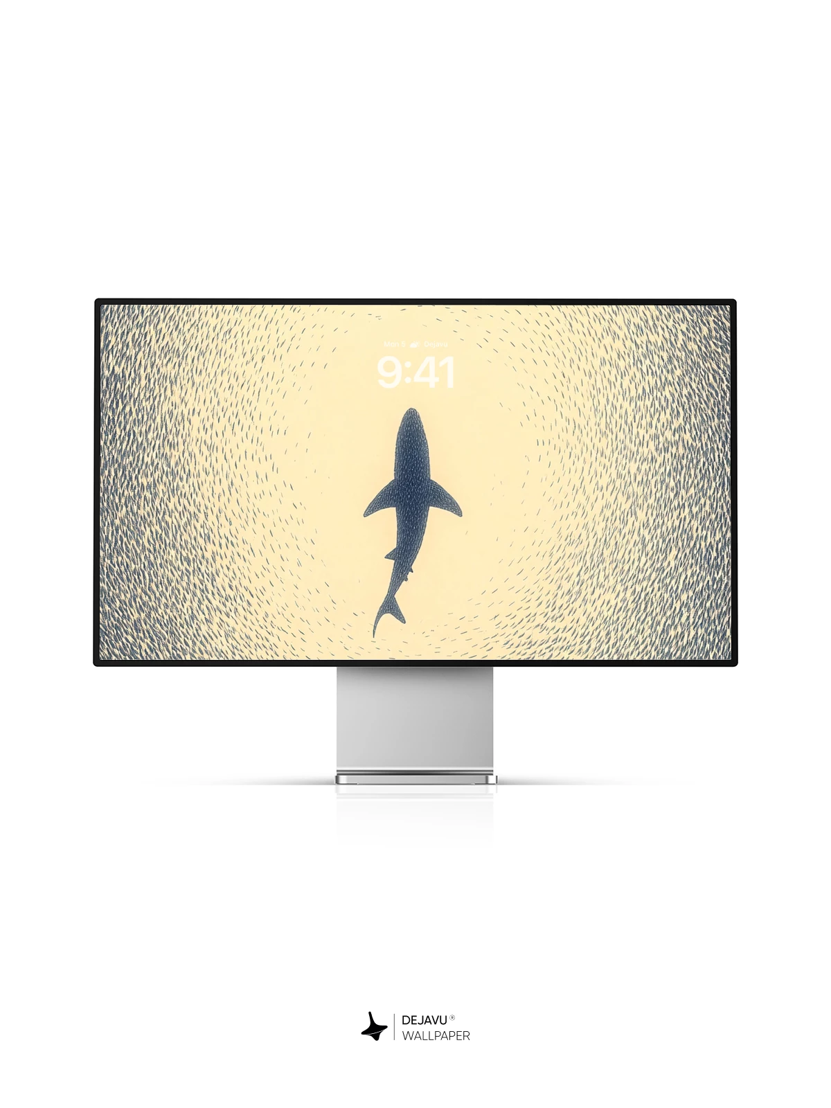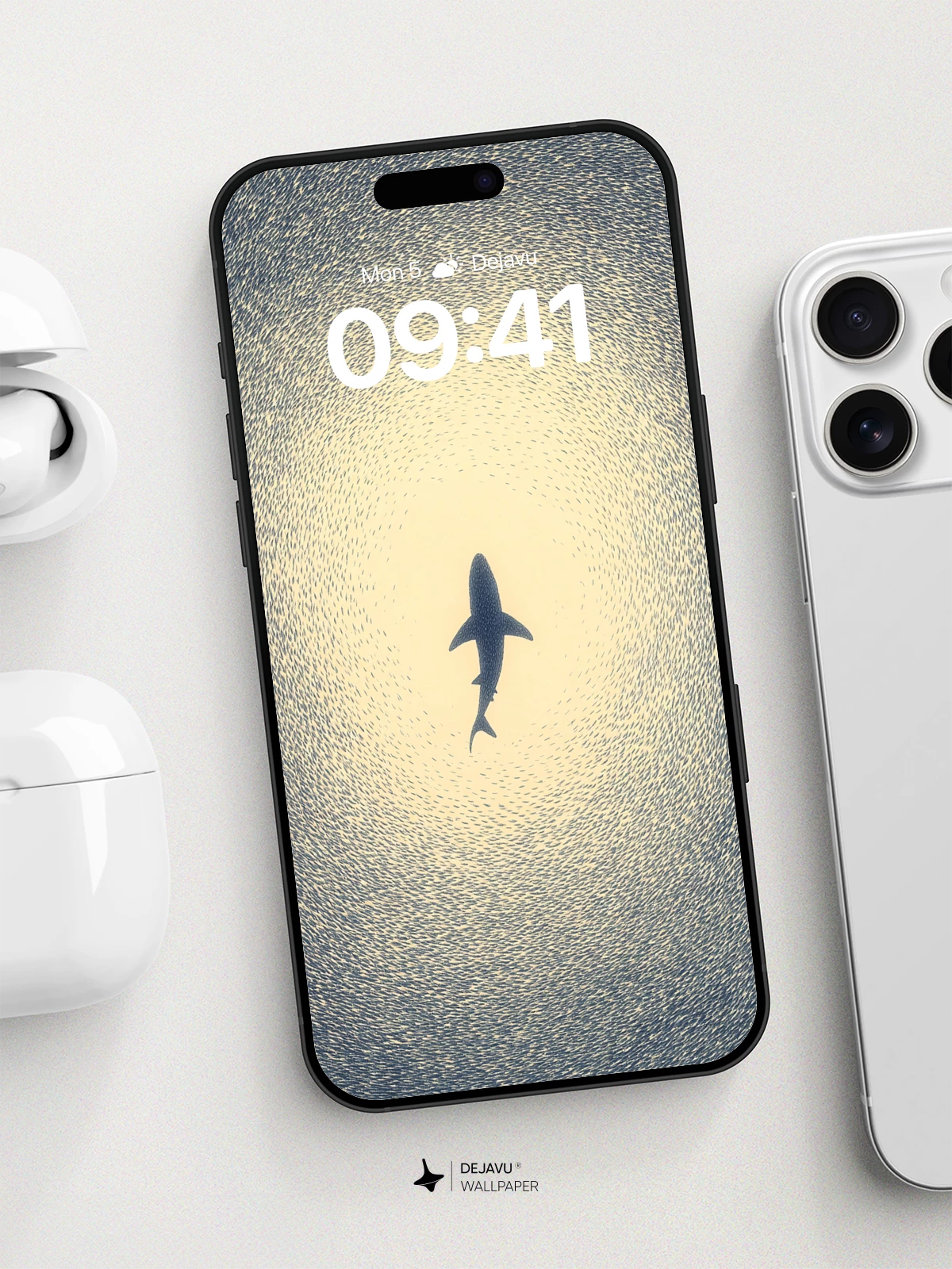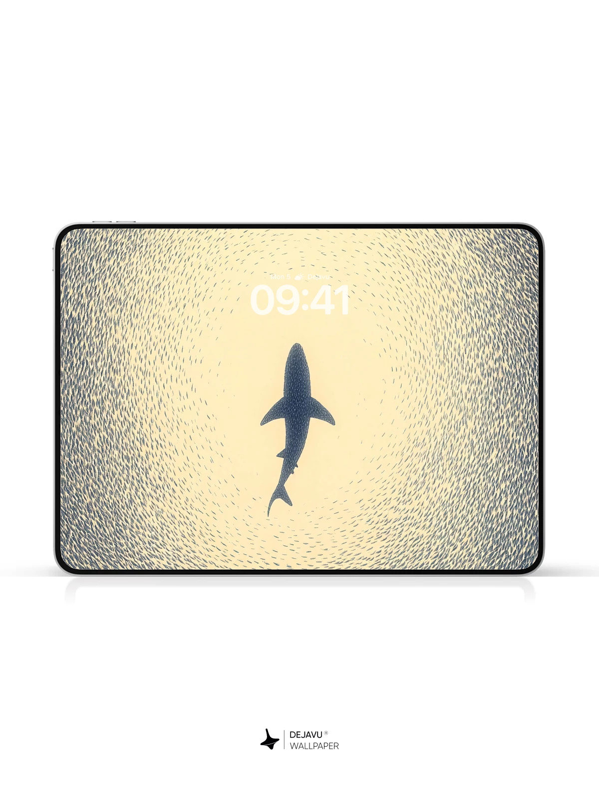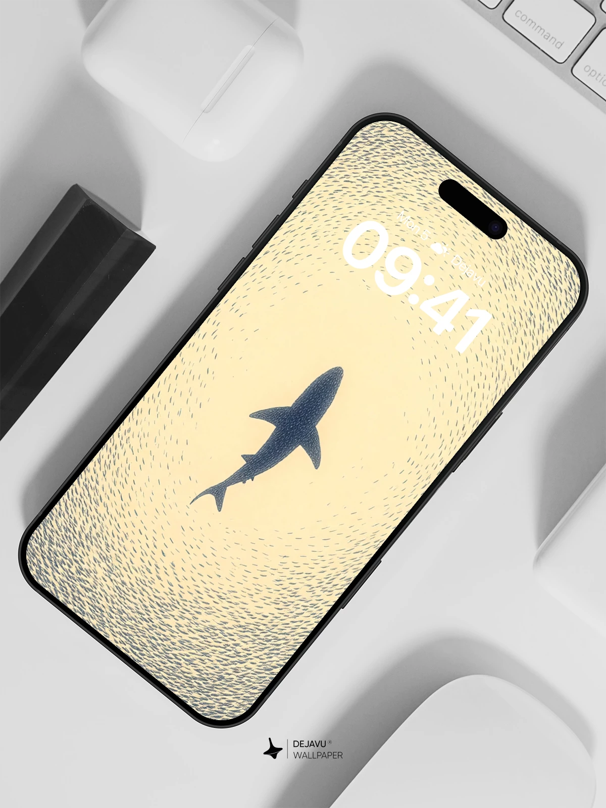 This high-resolution 8K wallpaper features a solitary shark navigating through a swirling mass of fish, offering a stunning contrast and depth. Ideal for enhancing the visual appeal of your iPhone, Android, or tablet with its natural elegance and dynamic composition.