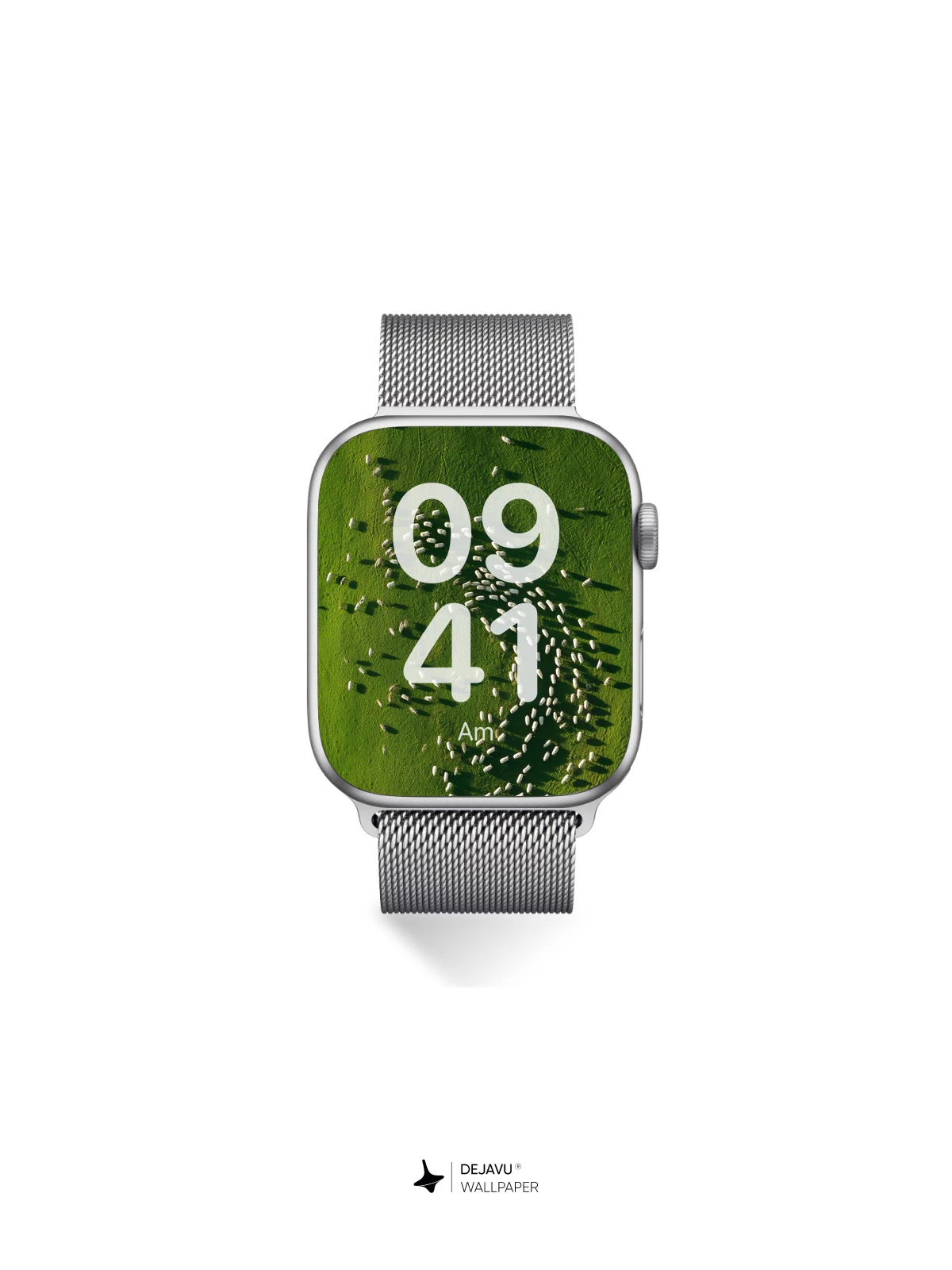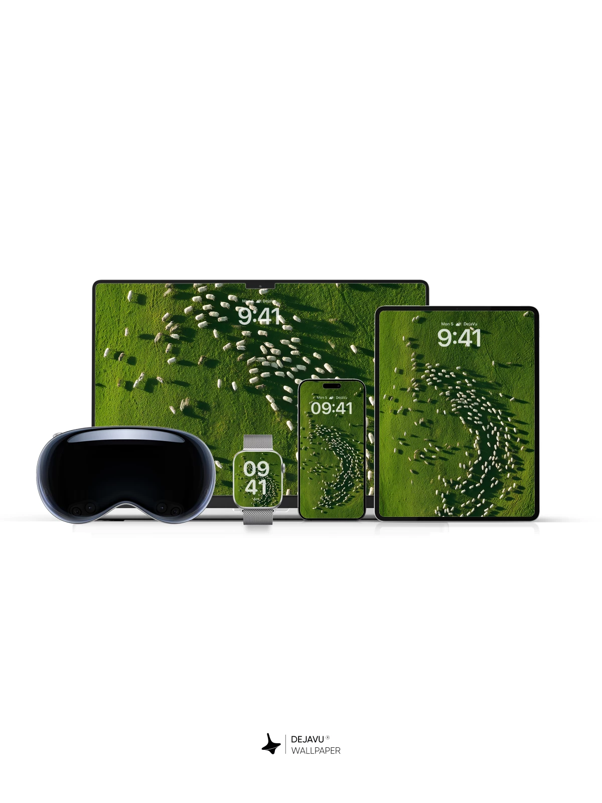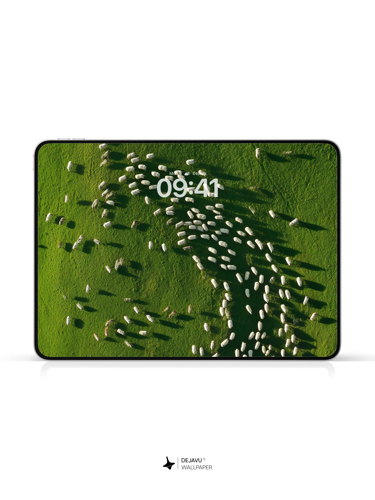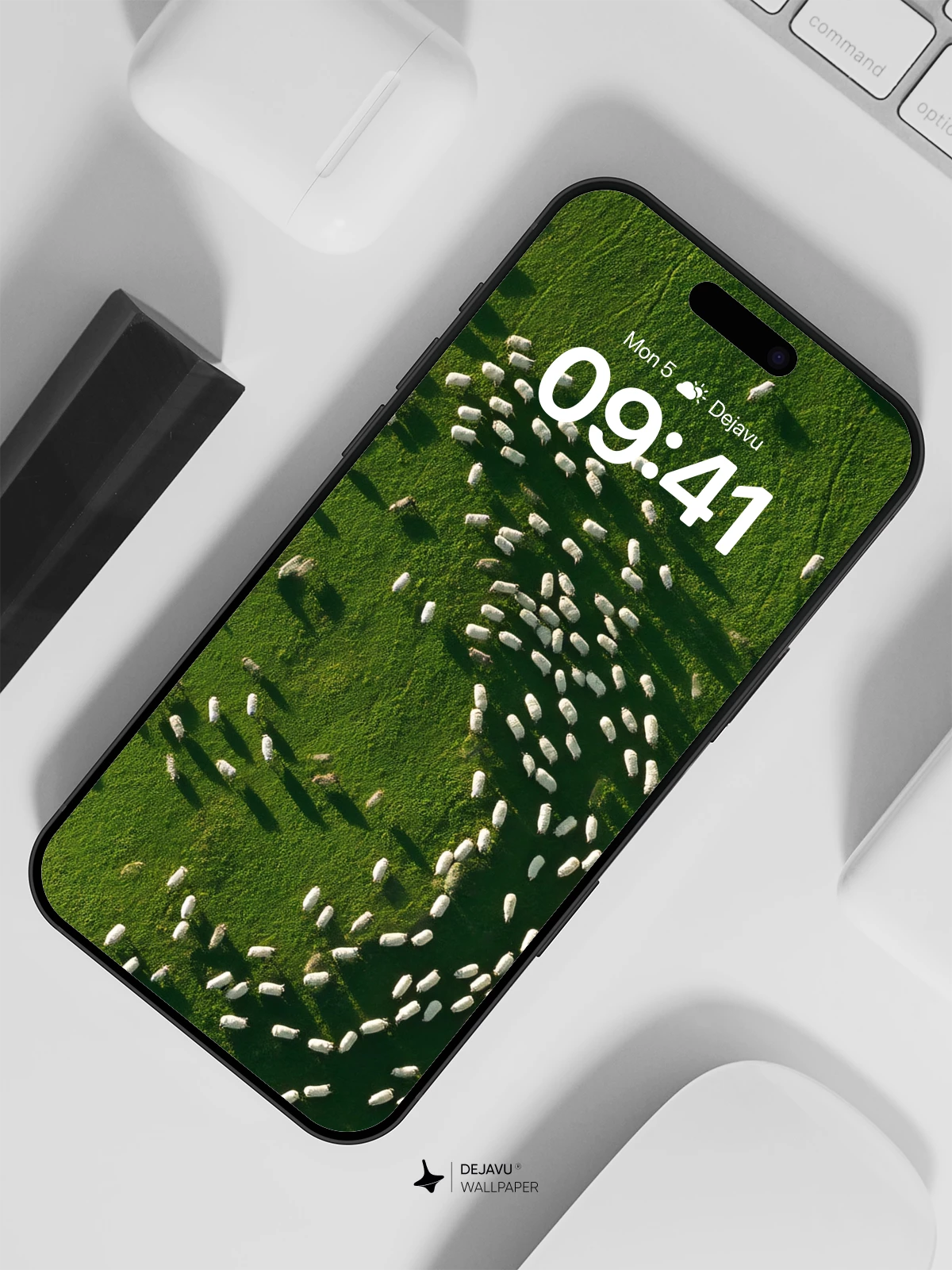 This breathtaking aerial photograph reveals a flock of sheep gracefully arranged in a flowing spiral across a vibrant green pasture. The natural symmetry and soft contrast between the white wool and emerald grass evoke a sense of harmony and tranquility. Ideal as an 8K wallpaper for iPhone, Android, or tablets, it brings the serenity of rural landscapes to your device with cinematic detail and peaceful charm.