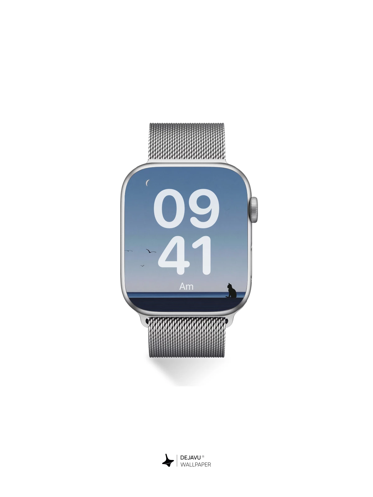 This tranquil 8K wallpaper captures a moment of quiet contemplation: a silhouetted cat sits on an empty beach beneath a soft twilight sky, where a delicate crescent moon hangs above and birds glide in formation. The minimalist composition evokes solitude and timeless beauty, blending natural serenity with poetic symbolism. Ideal for iPhone, Android, or any mobile device seeking a calm, high-resolution background that inspires stillness and wonder.