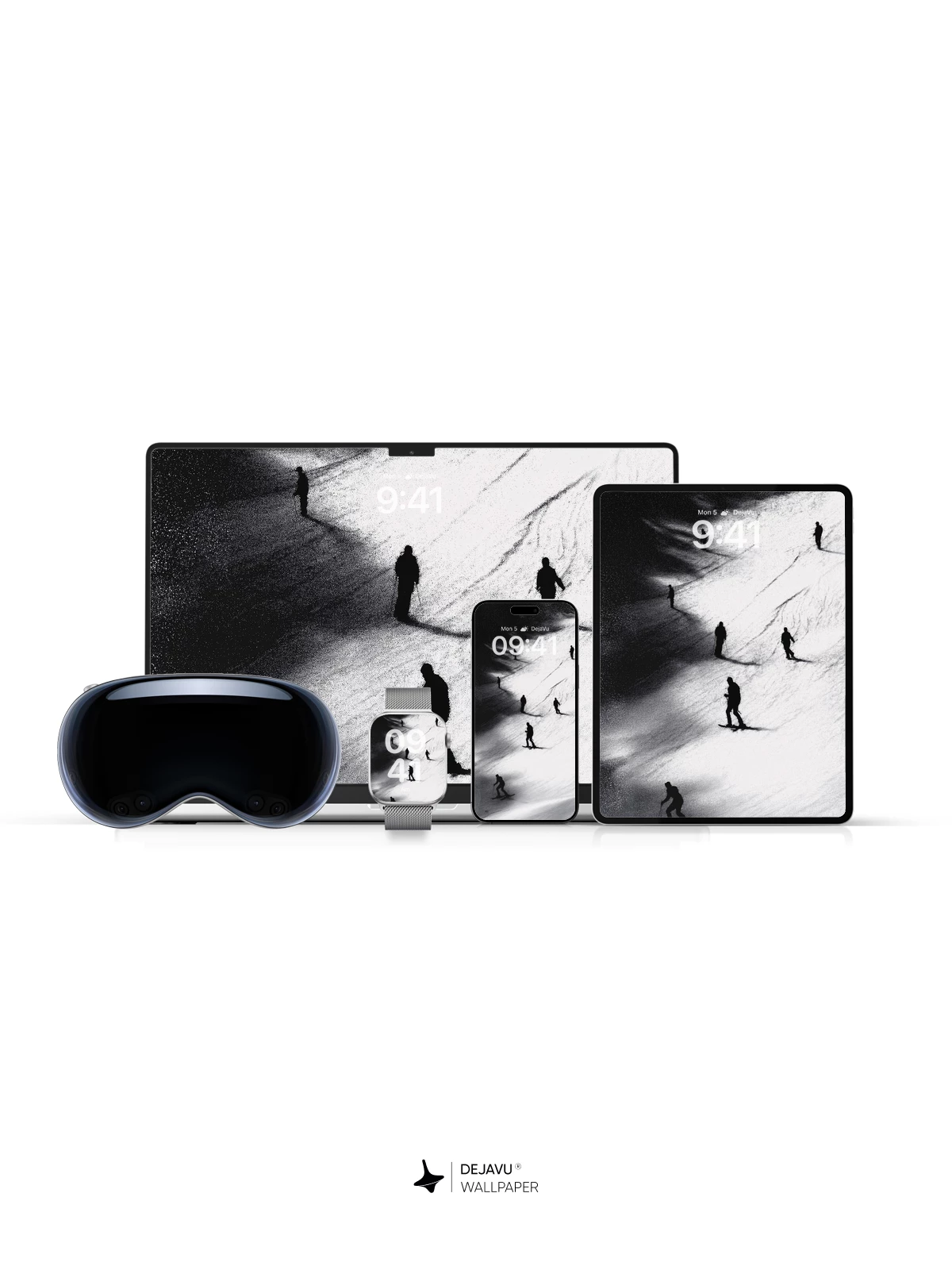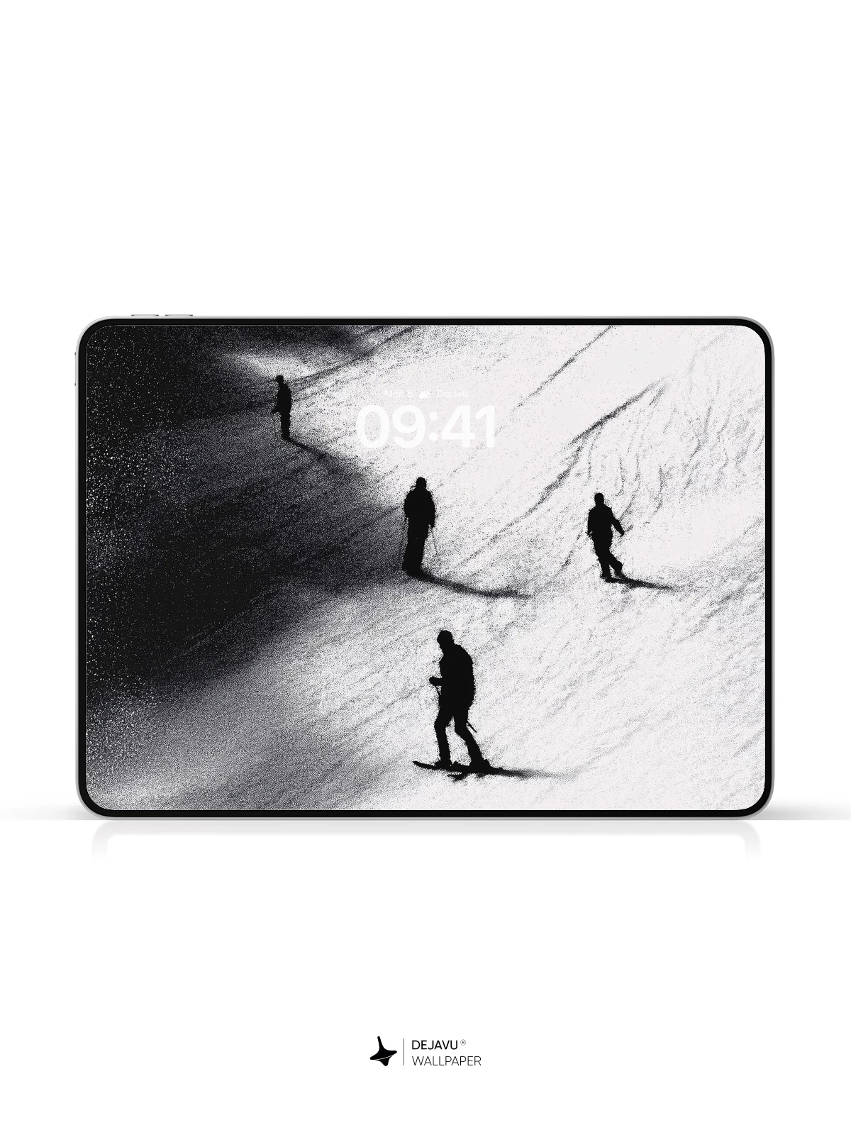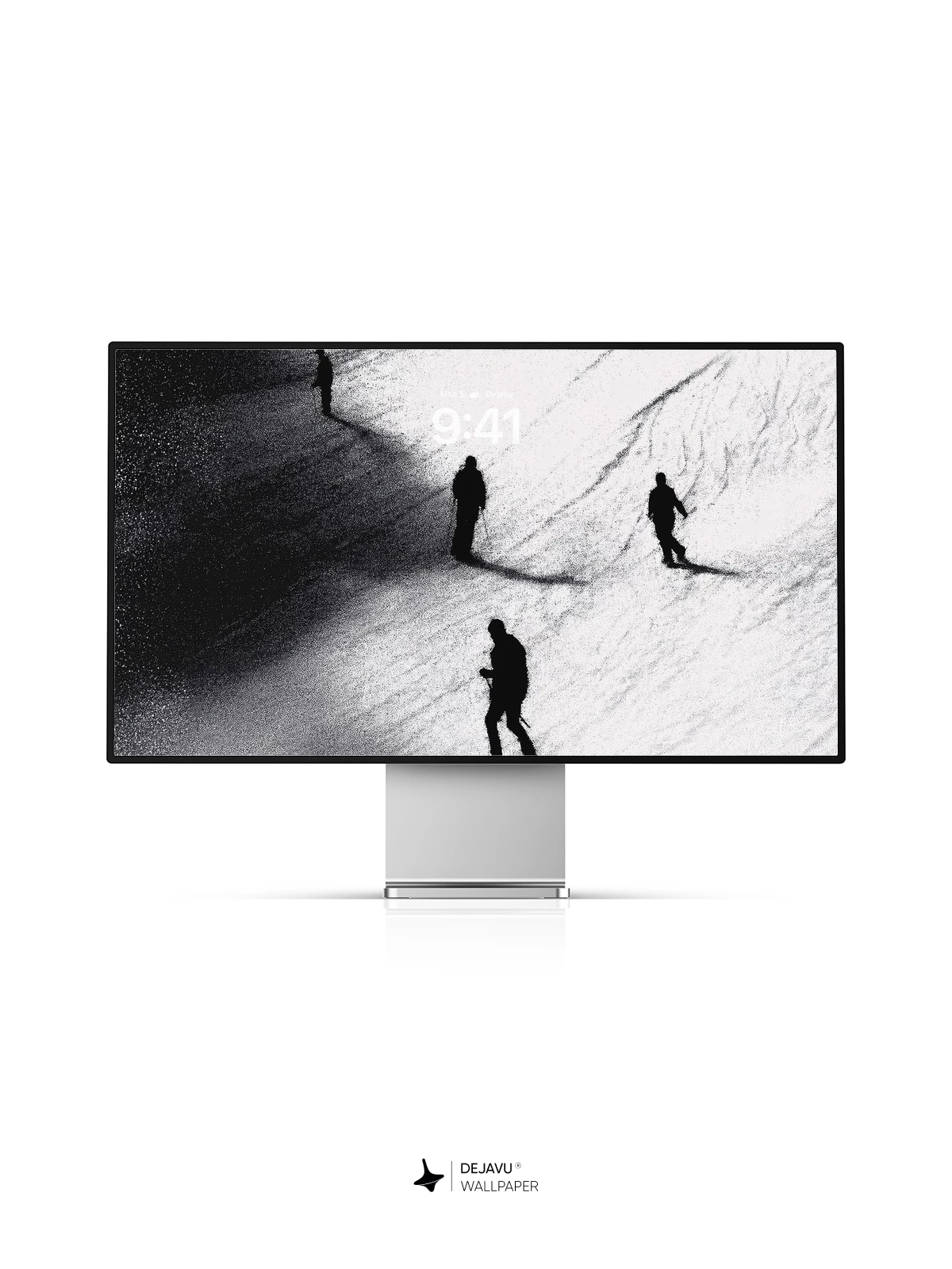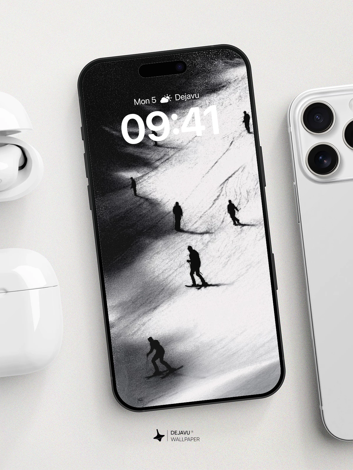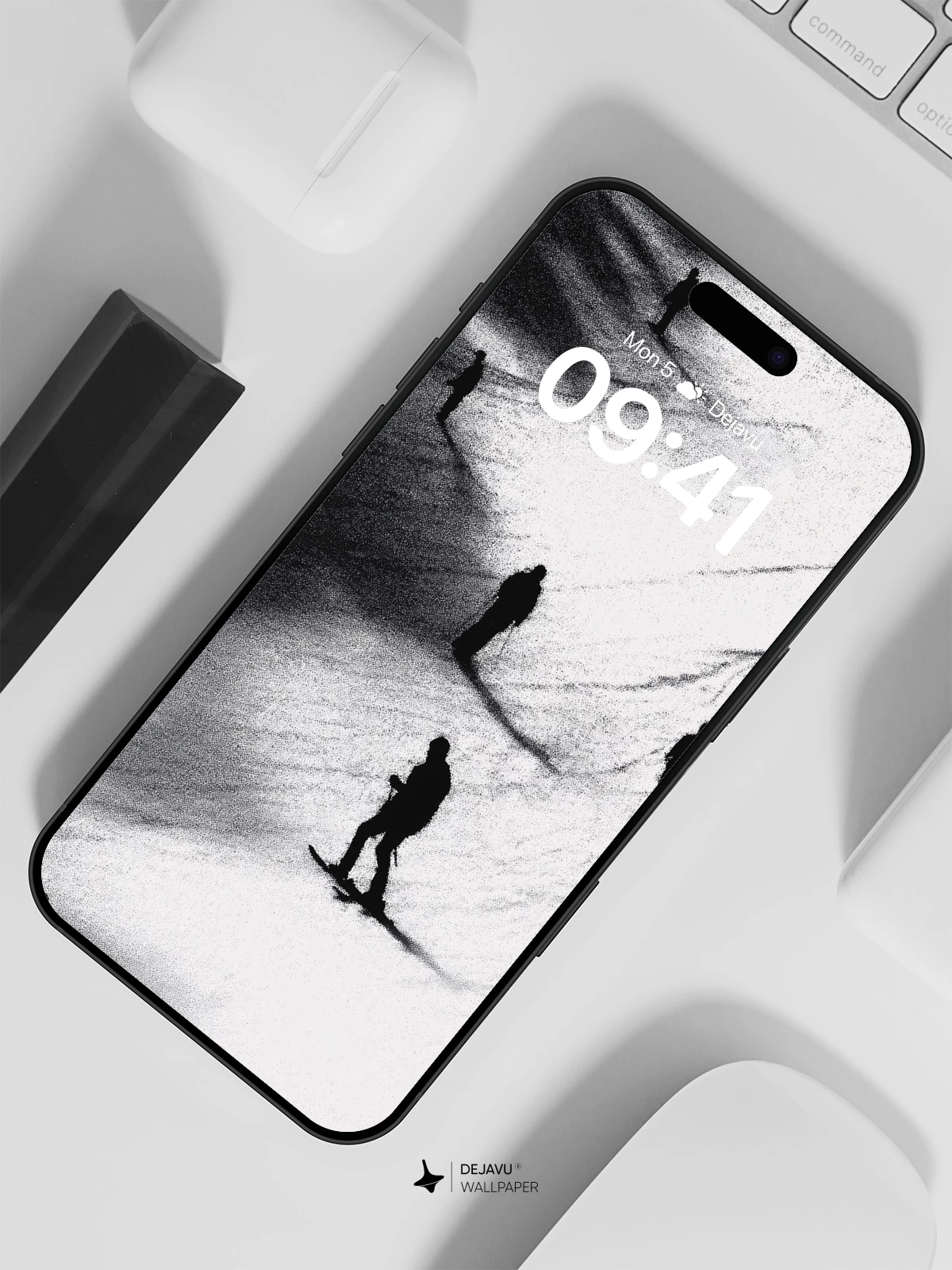 This striking 8K wallpaper captures the quiet drama of skiers descending a snow-covered mountain, their dark silhouettes stark against the luminous white snow. The interplay of light and shadow creates a timeless, almost poetic atmosphere, evoking solitude and motion in harmony. Ideal for iPhone, Android, and tablets, this minimalist design brings a sense of calm and elegance to any device screen.