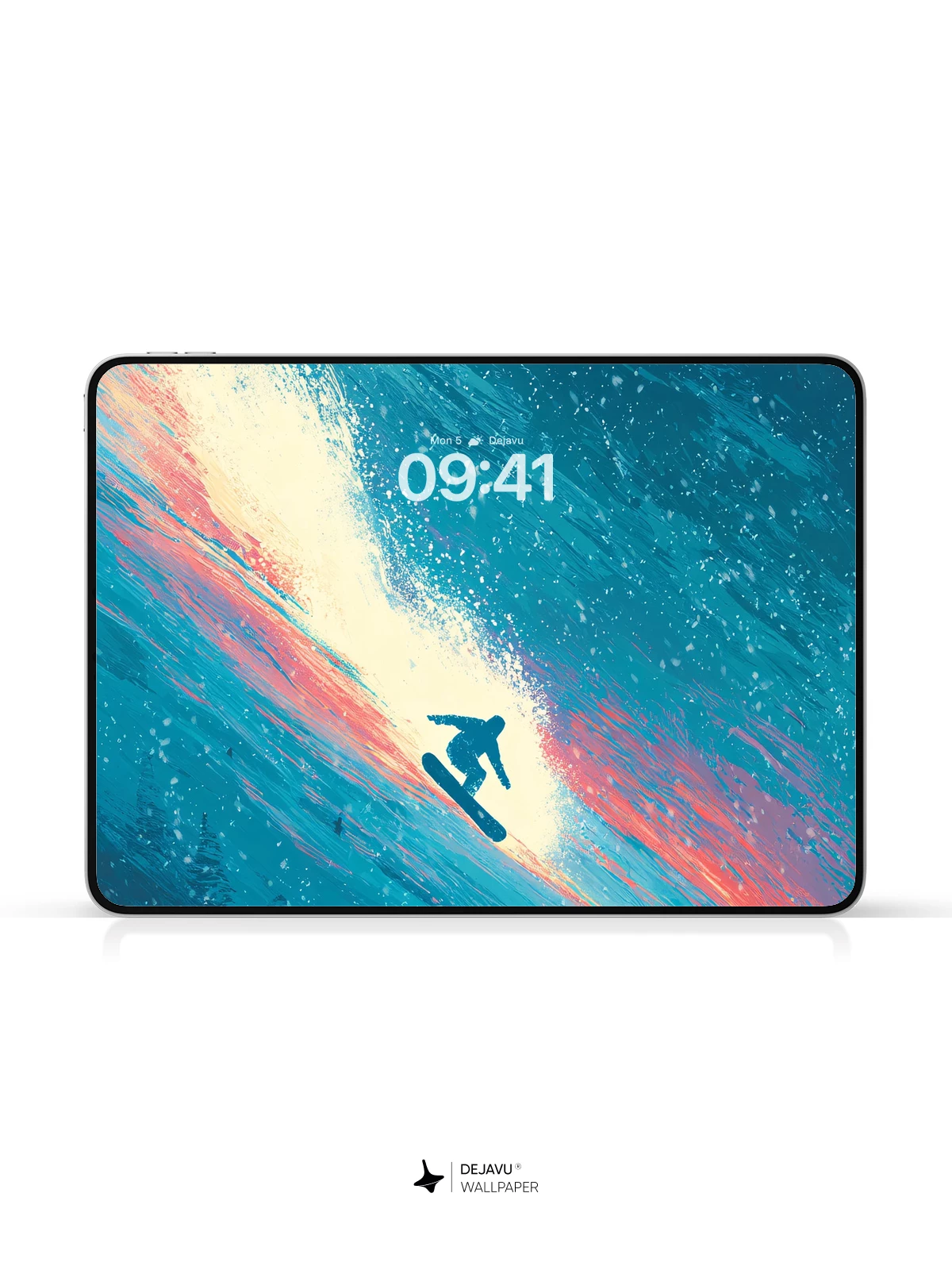 This stunning 8K wallpaper captures a snowboarder in mid-descent against a dramatic alpine backdrop, where fiery orange and pink streaks blend into deep teal skies. The motion of the snow spray creates a radiant trail, evoking speed and freedom. Inspired by the bold contrasts and emotional depth of modern digital art, this design delivers a sense of adventure and serenity. Ideal for iPhone, Android, and tablets, it transforms any device into a canvas of winter wonder.