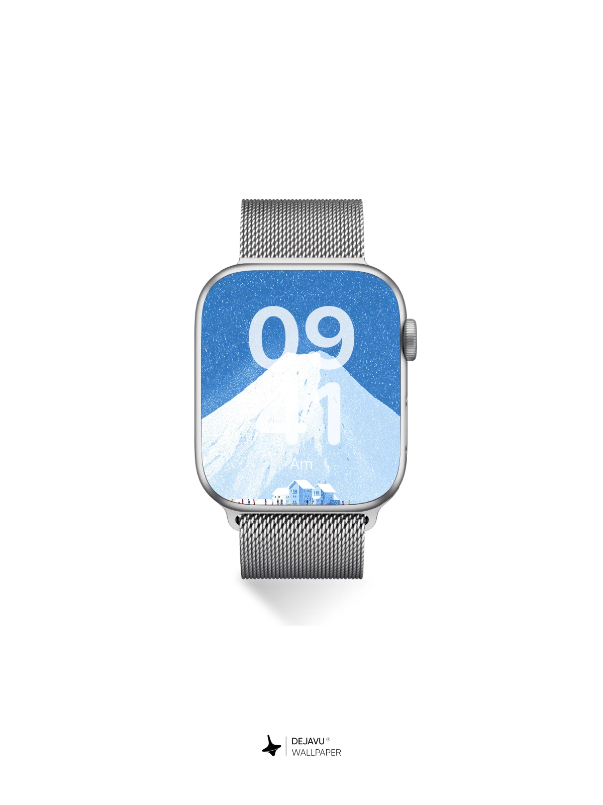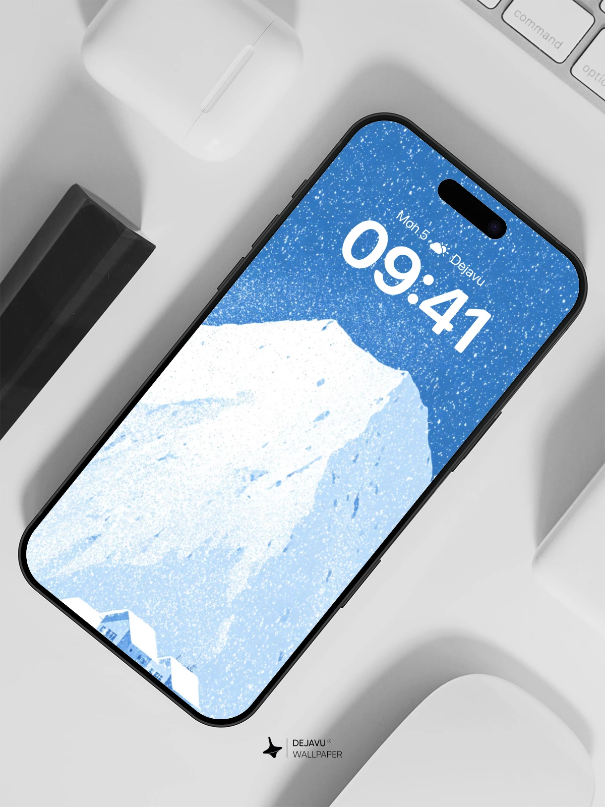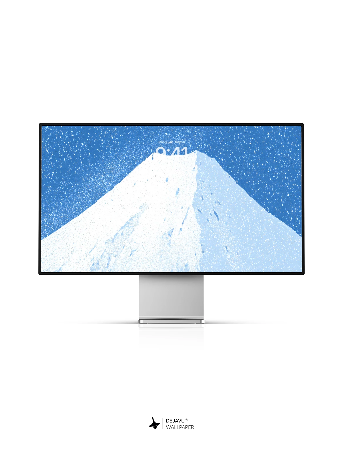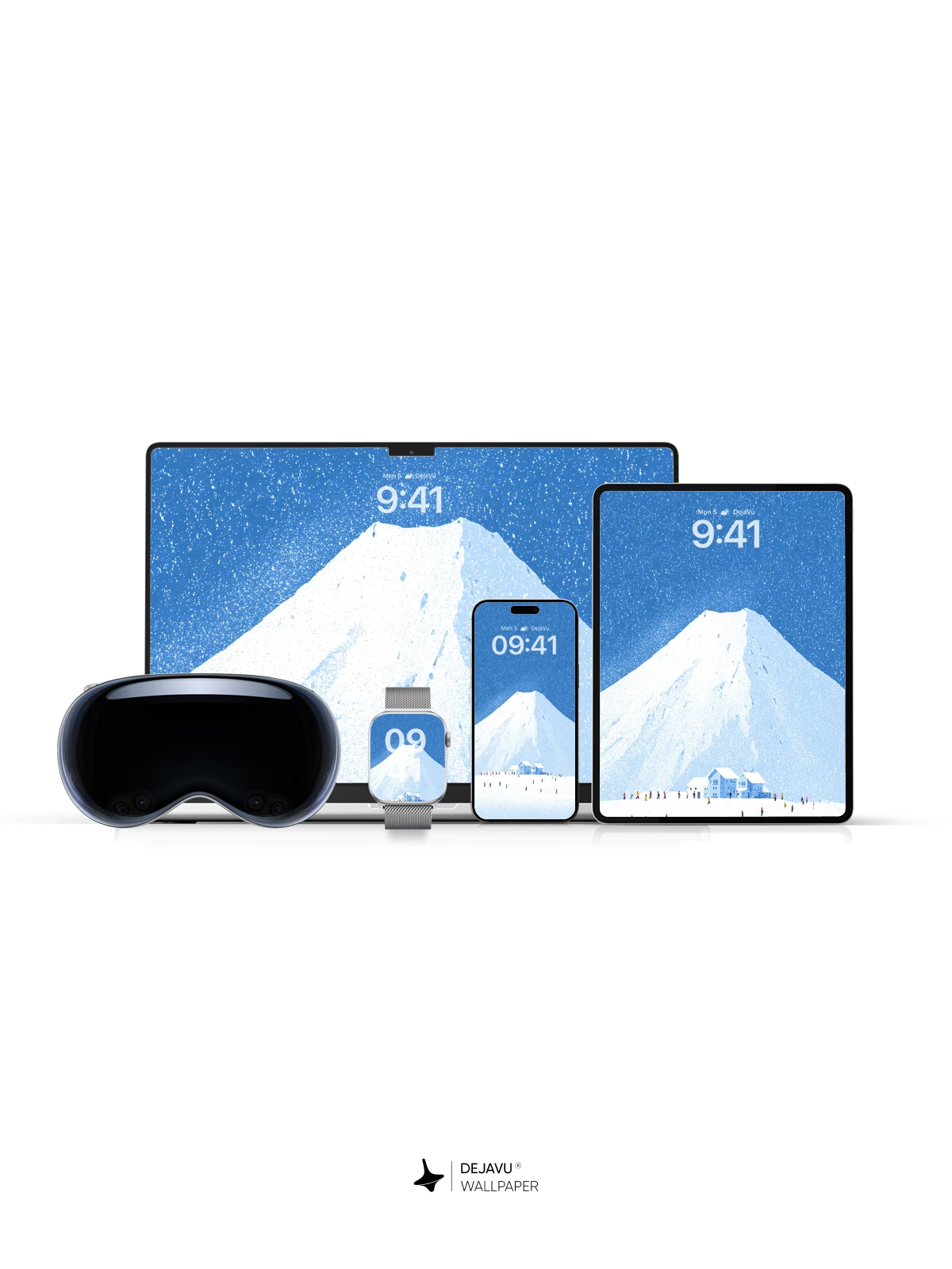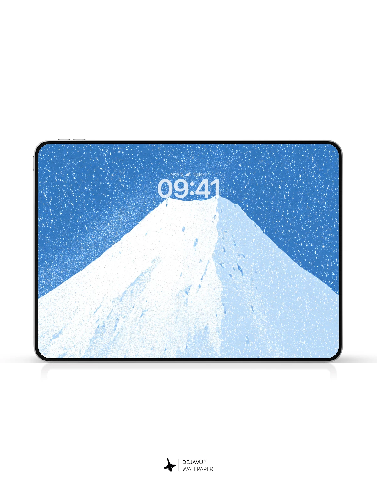 This breathtaking 8K wallpaper captures the tranquil beauty of a snowy Mount Fuji, inspired by traditional Japanese landscape aesthetics. Beneath a deep blue sky, gentle snowflakes drift over a pristine white expanse where tiny figures ski and gather near a charming alpine lodge. The minimalist composition evokes peace and solitude, making it an ideal high-resolution background for iPhone, Android, or tablet devices. Perfect for fans of nature-inspired art and seasonal serenity.