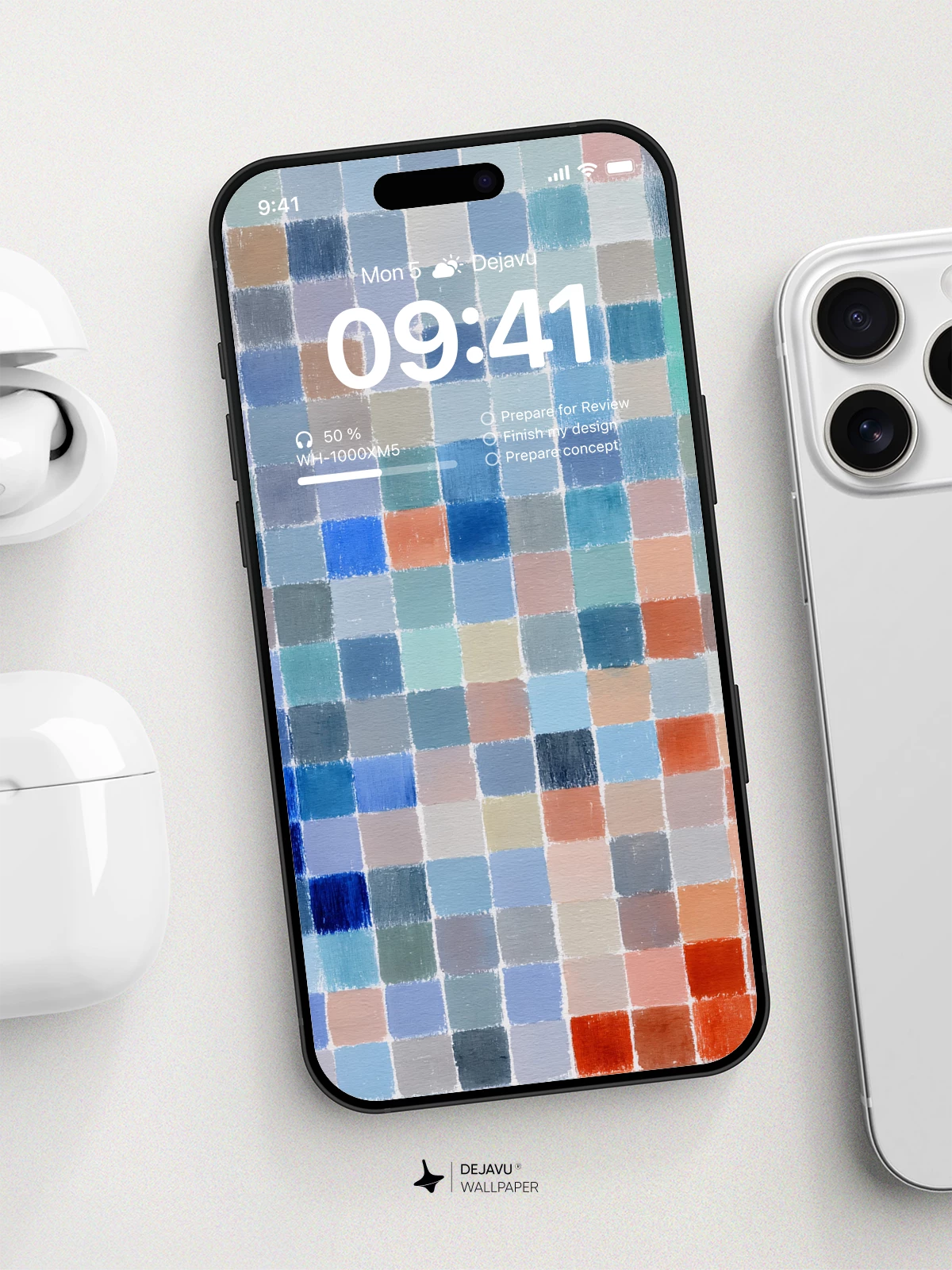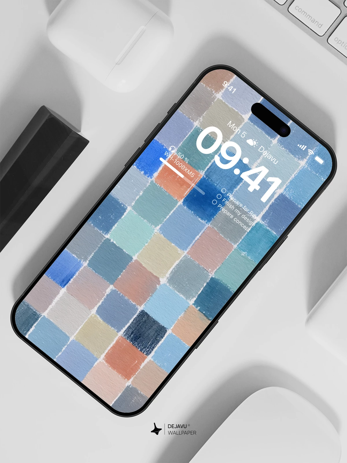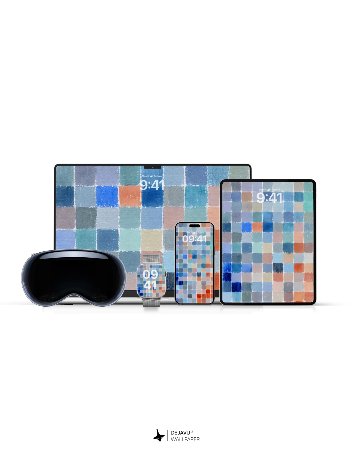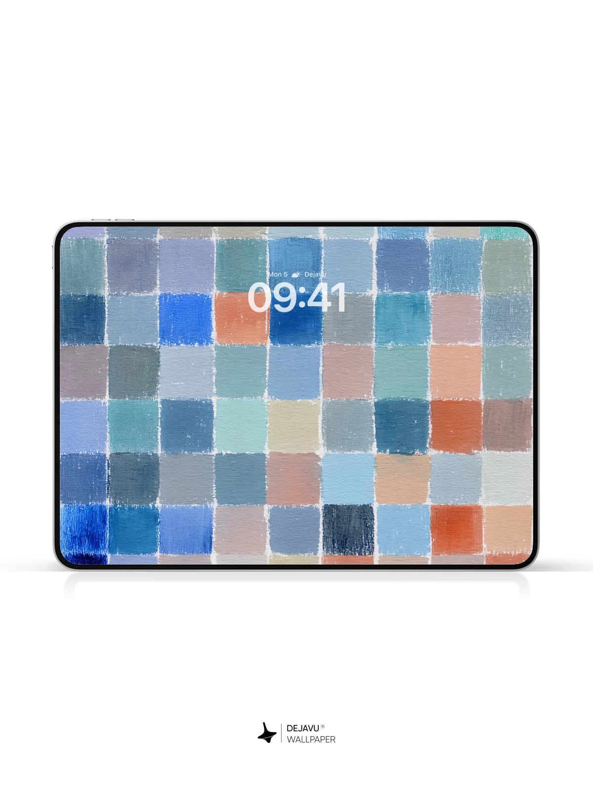 This 8K wallpaper features a mosaic of painted squares in a soothing palette of cool blues and muted earth tones. The uneven, organic edges of the tiles create a gentle rhythm, offering a calm and sophisticated backdrop for your iPhone, Android, or tablet screen.