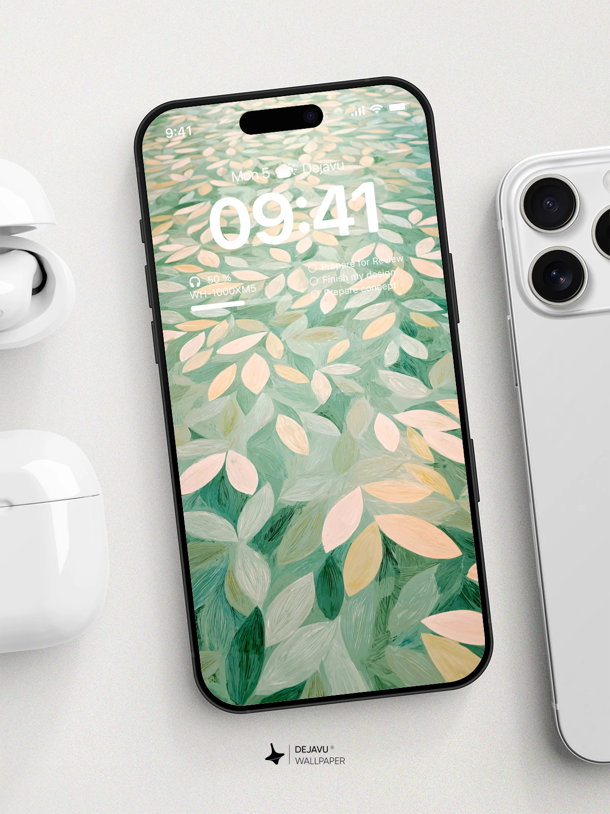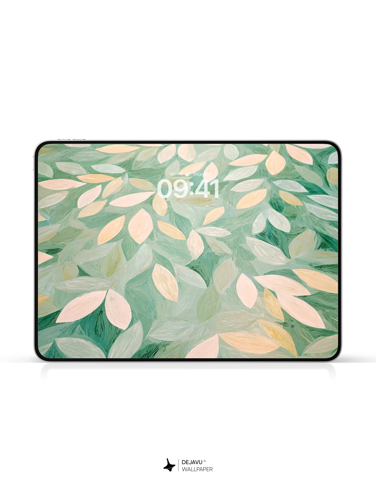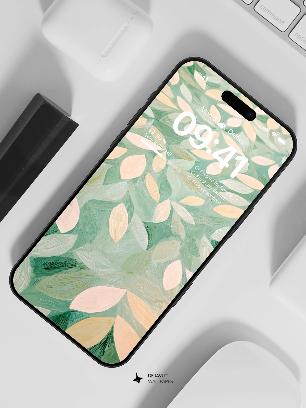 This wallpaper features a painterly arrangement of leaf-like forms in soft greens and warm creams. The visible brushwork and gentle color shifts create a soothing, organic texture. The composition is abstract enough to stay out of the way of icons, making it a perfect fit for iPhone, Android, and tablet screens.