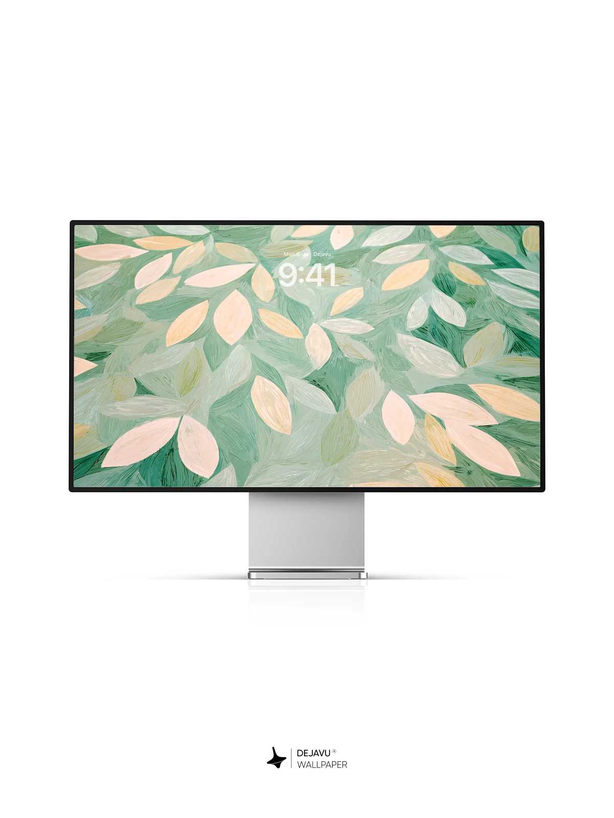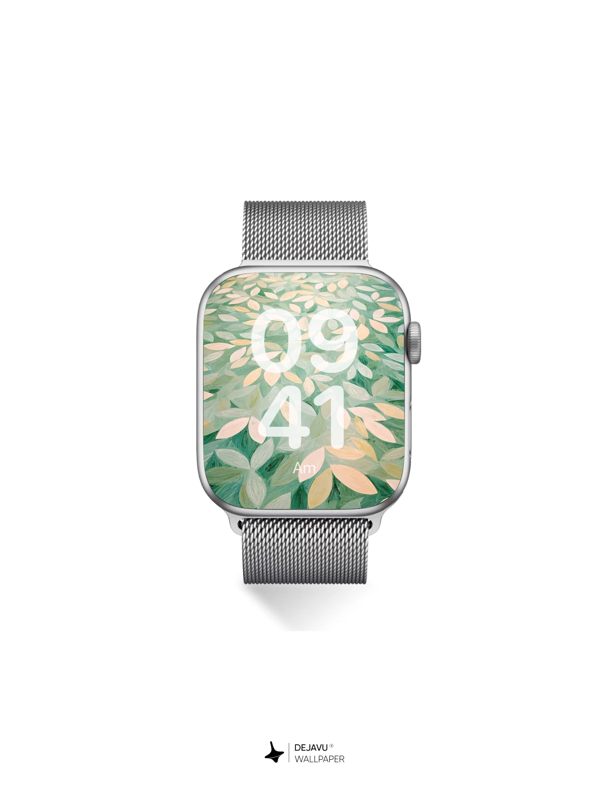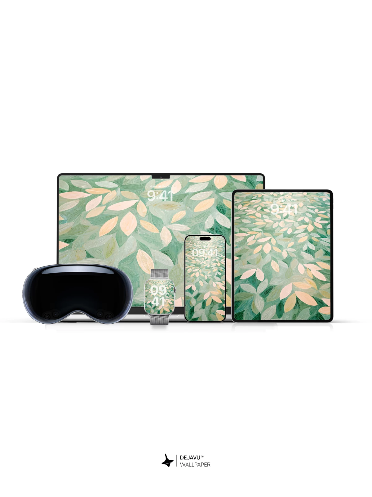This wallpaper features a painterly arrangement of leaf-like forms in soft greens and warm creams. The visible brushwork and gentle color shifts create a soothing, organic texture. The composition is abstract enough to stay out of the way of icons, making it a perfect fit for iPhone, Android, and tablet screens.