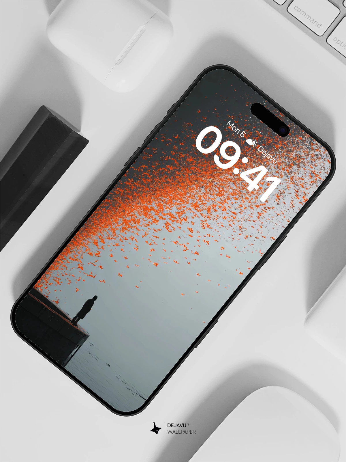 This 8K wallpaper captures a solitary figure on a platform, with a stream of glowing orange particles dispersing into the misty backdrop. The composition offers a striking balance between isolation and movement, making it ideal for enhancing the visual appeal of your iPhone, Android, or tablet. The rich textures and subtle gradients provide a modern, artistic touch to any device.