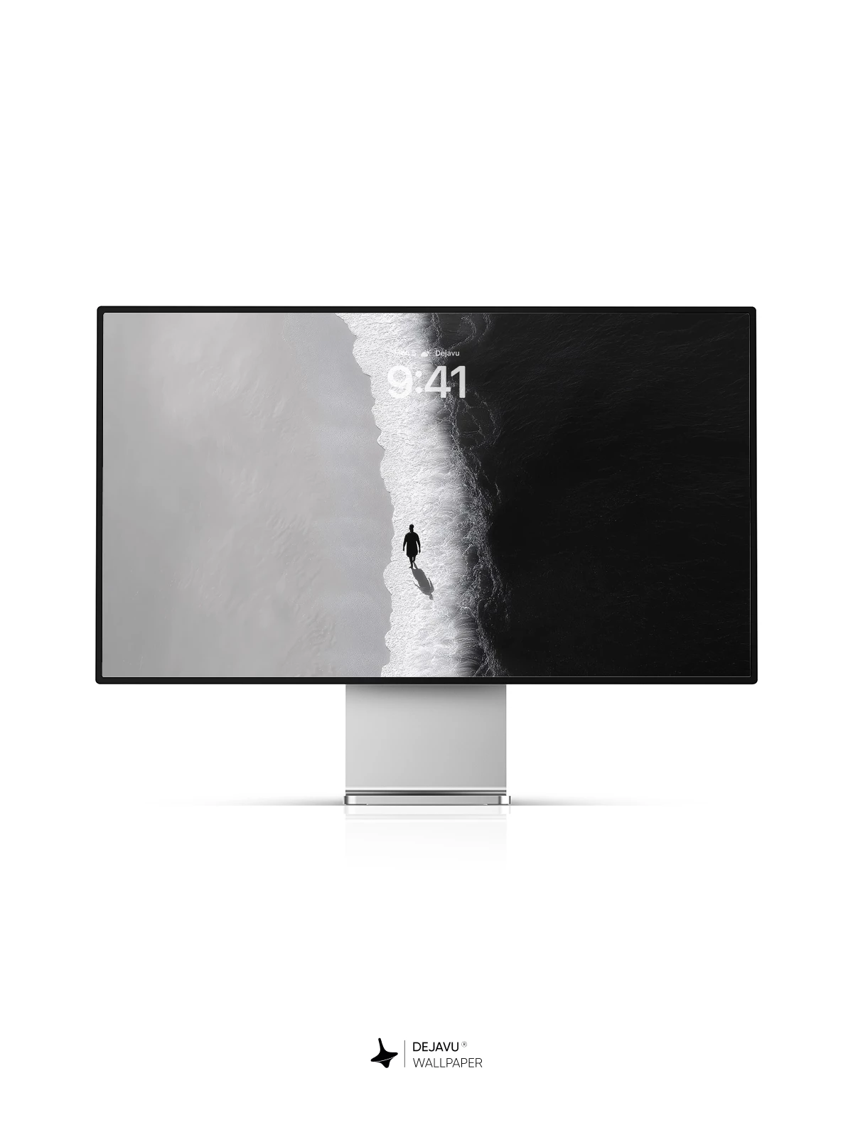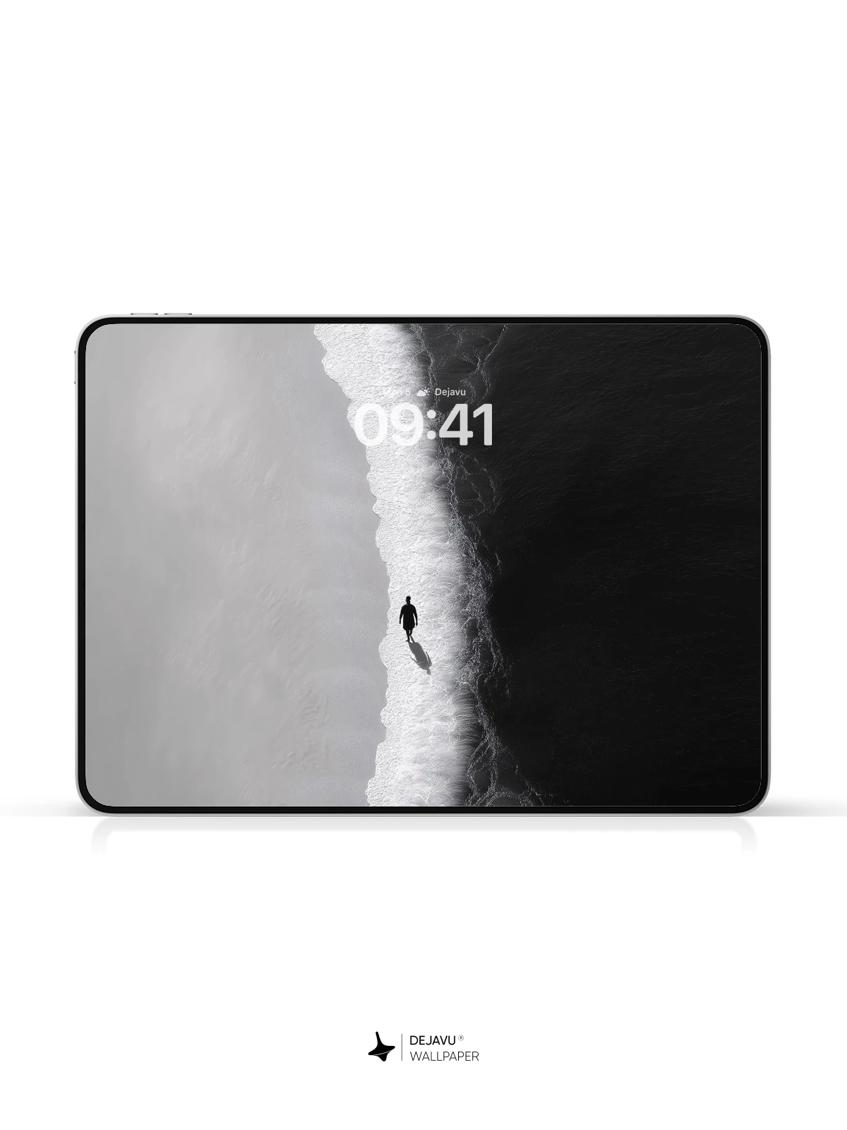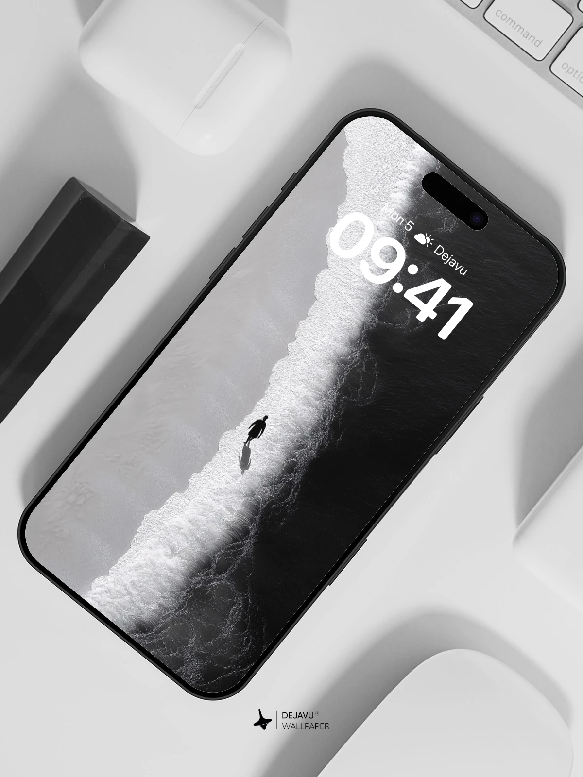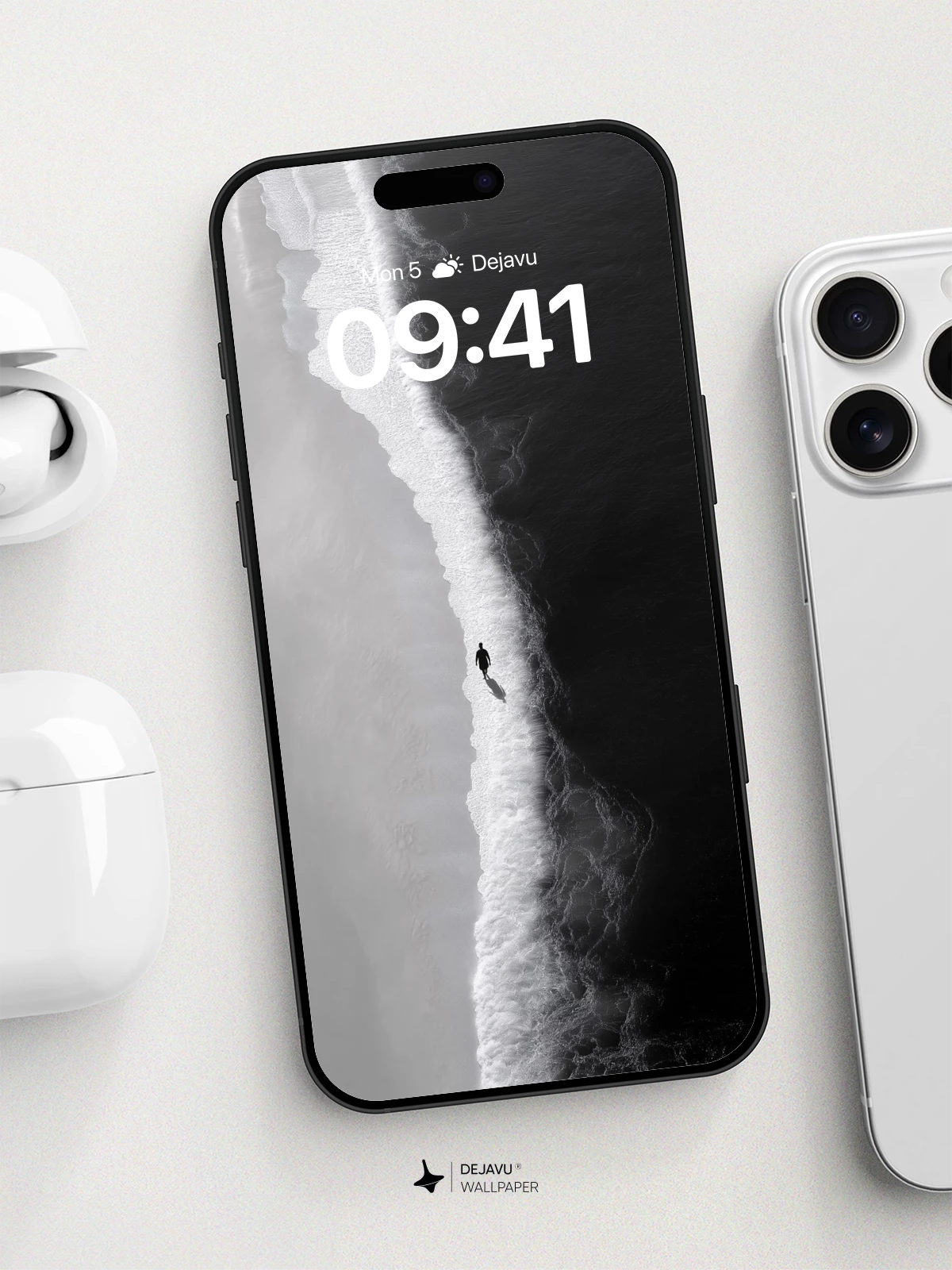 This striking aerial photograph captures a solitary figure walking along the foamy boundary where ocean meets shore, evoking deep emotions of isolation and connection with nature. The high-contrast interplay of dark water and white foam creates a powerful visual metaphor for life’s fragile balance. Ideal as an 8K wallpaper for iPhone, Android, or tablets, it brings raw natural beauty and contemplative depth to any screen.