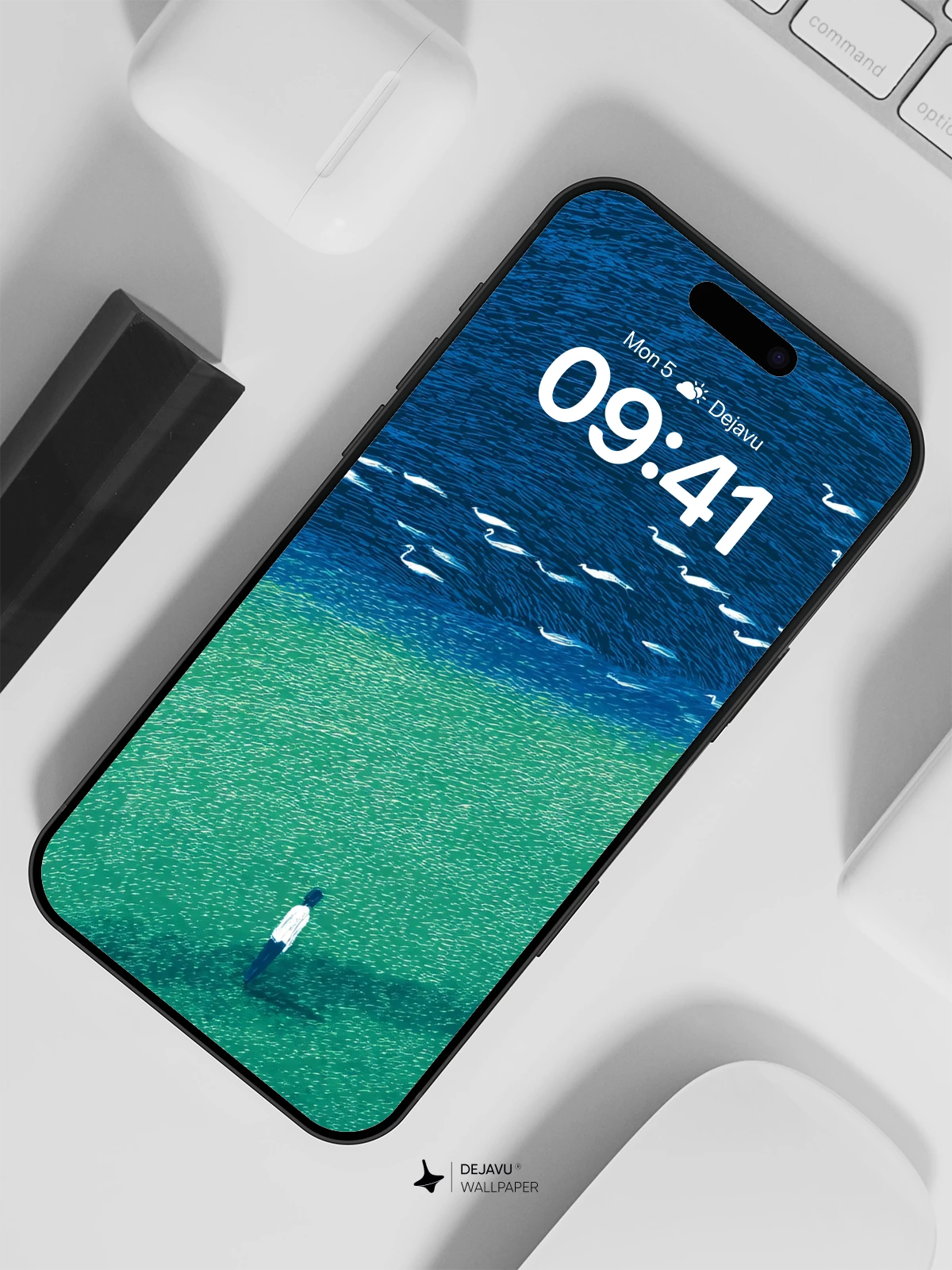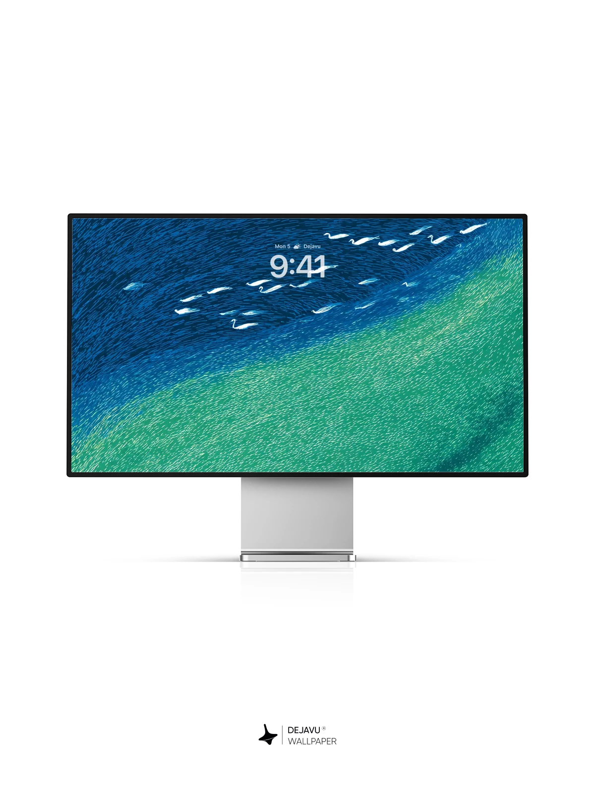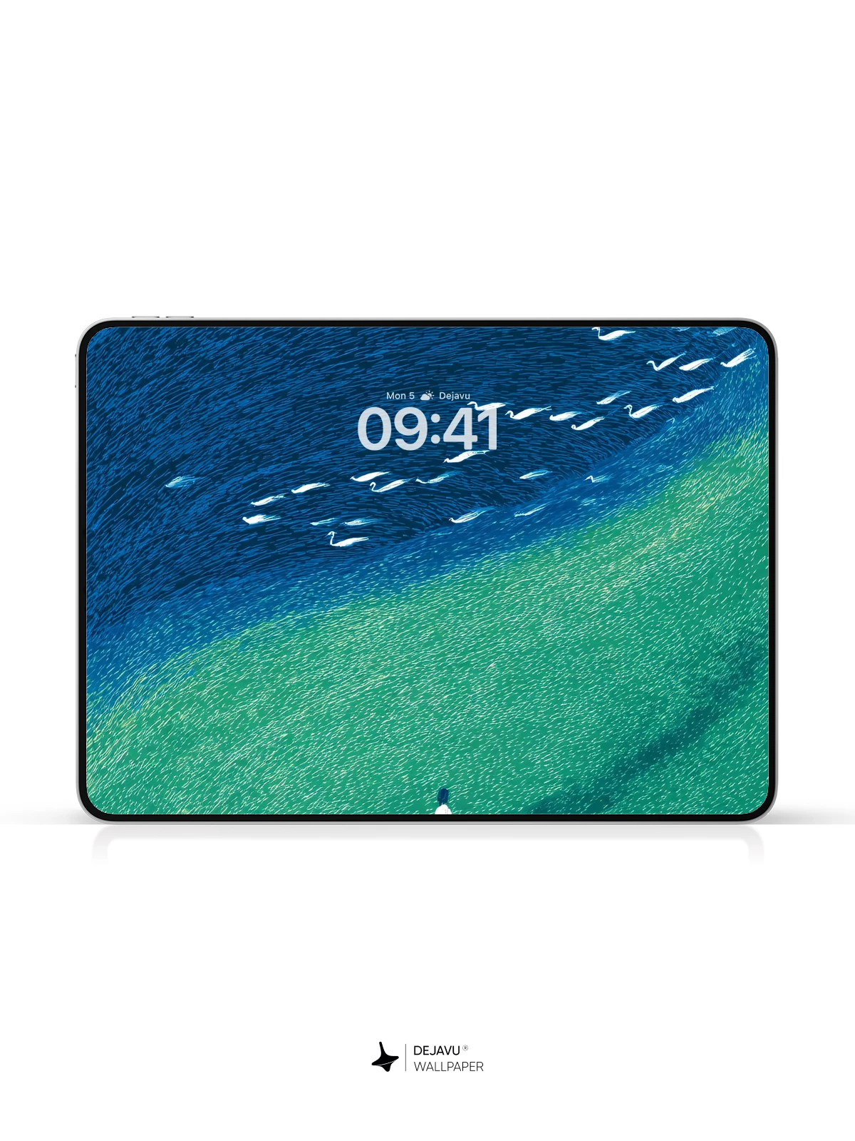 A minimalist scene of a lone figure on a green field facing a flock of white birds in a deep blue sky. The textured surfaces create a painterly feel. This 8K wallpaper works well on iPhone, Android, and tablets.