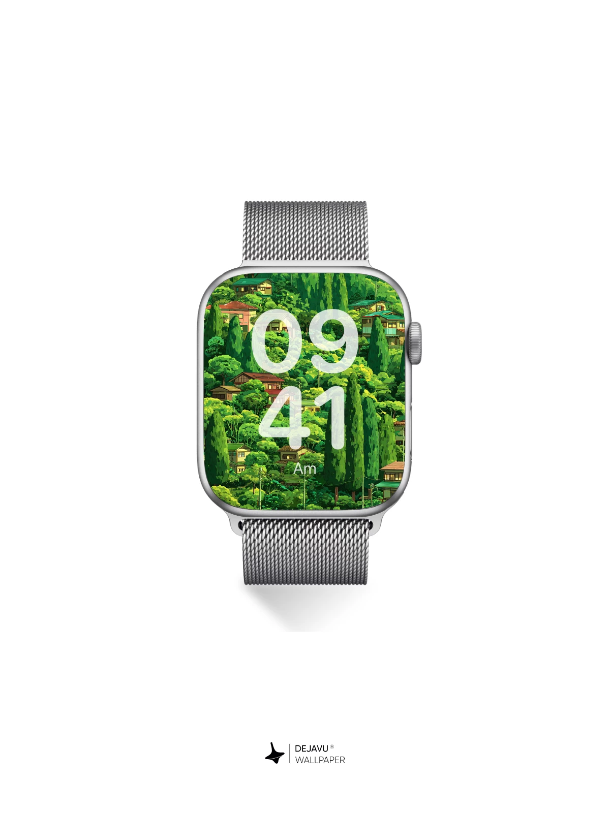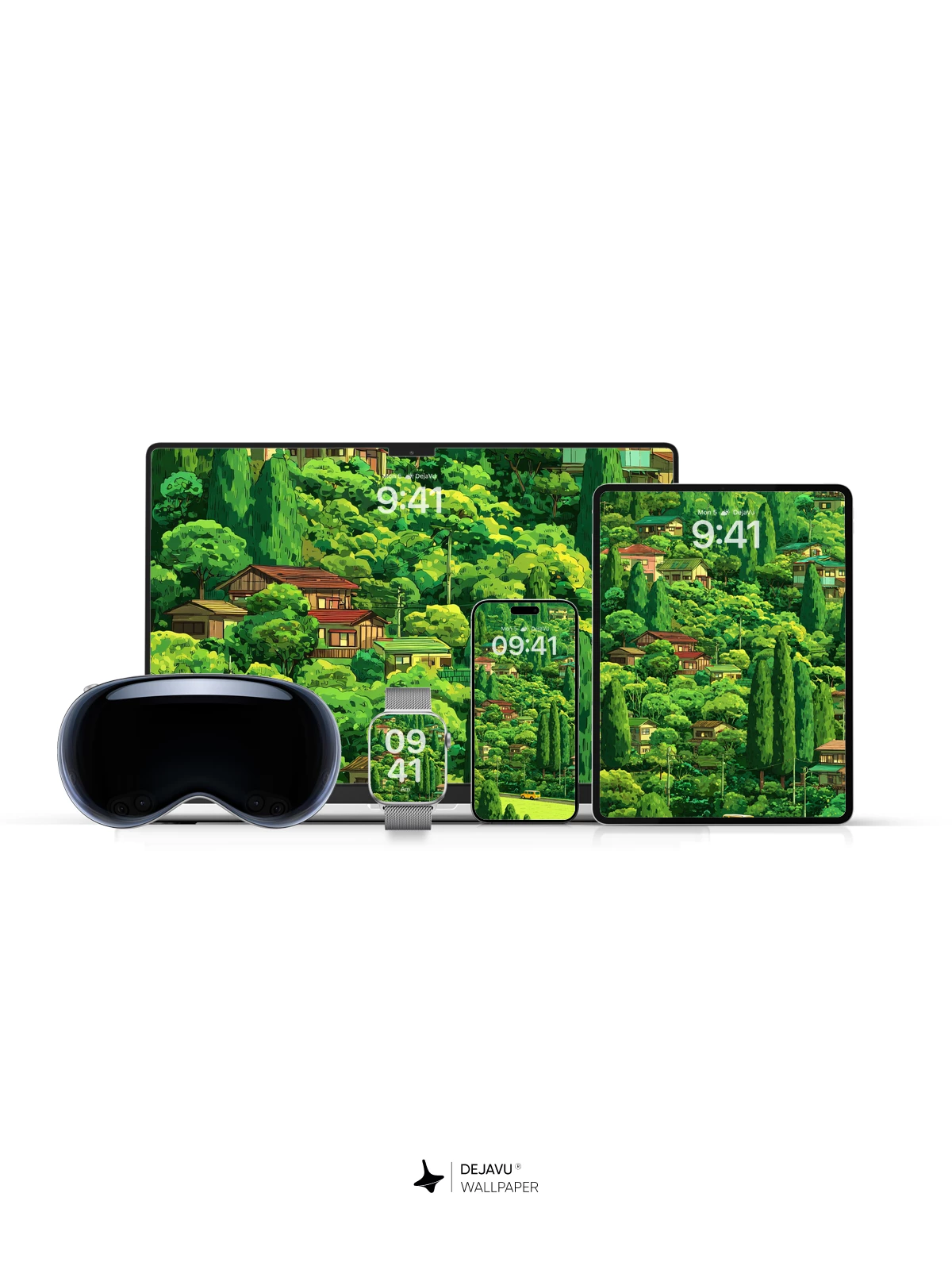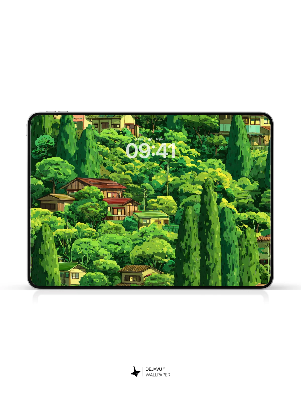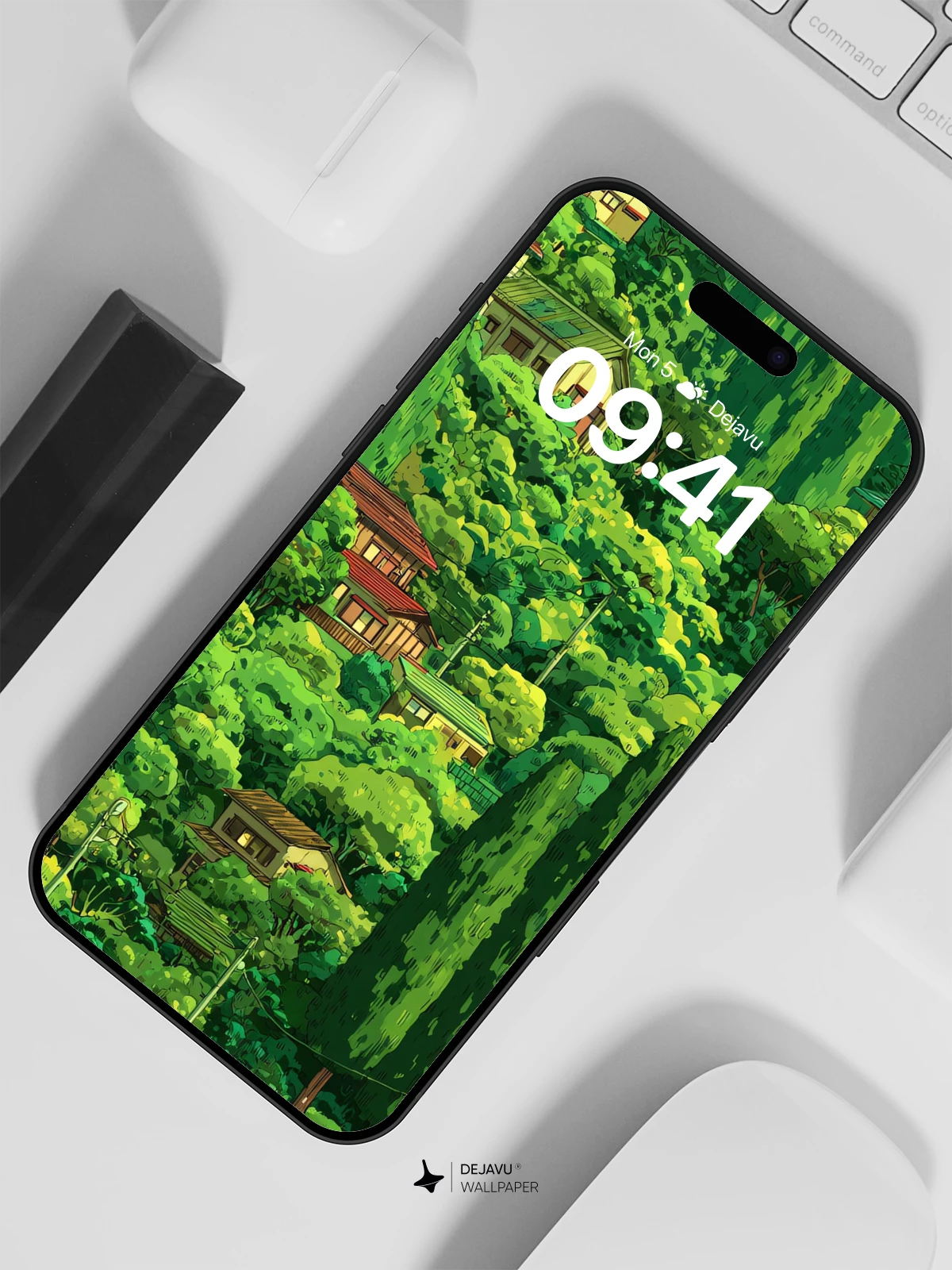This enchanting 8K wallpaper captures the serene beauty of a hidden mountain village, reminiscent of Studio Ghibli’s magical landscapes. Lush greenery wraps around traditional houses, while a bright yellow van winds through the valley below—evoking a sense of peaceful adventure. Perfect for iPhone, Android, and tablets, this high-resolution design transforms your screen into a window into a tranquil, storybook world.