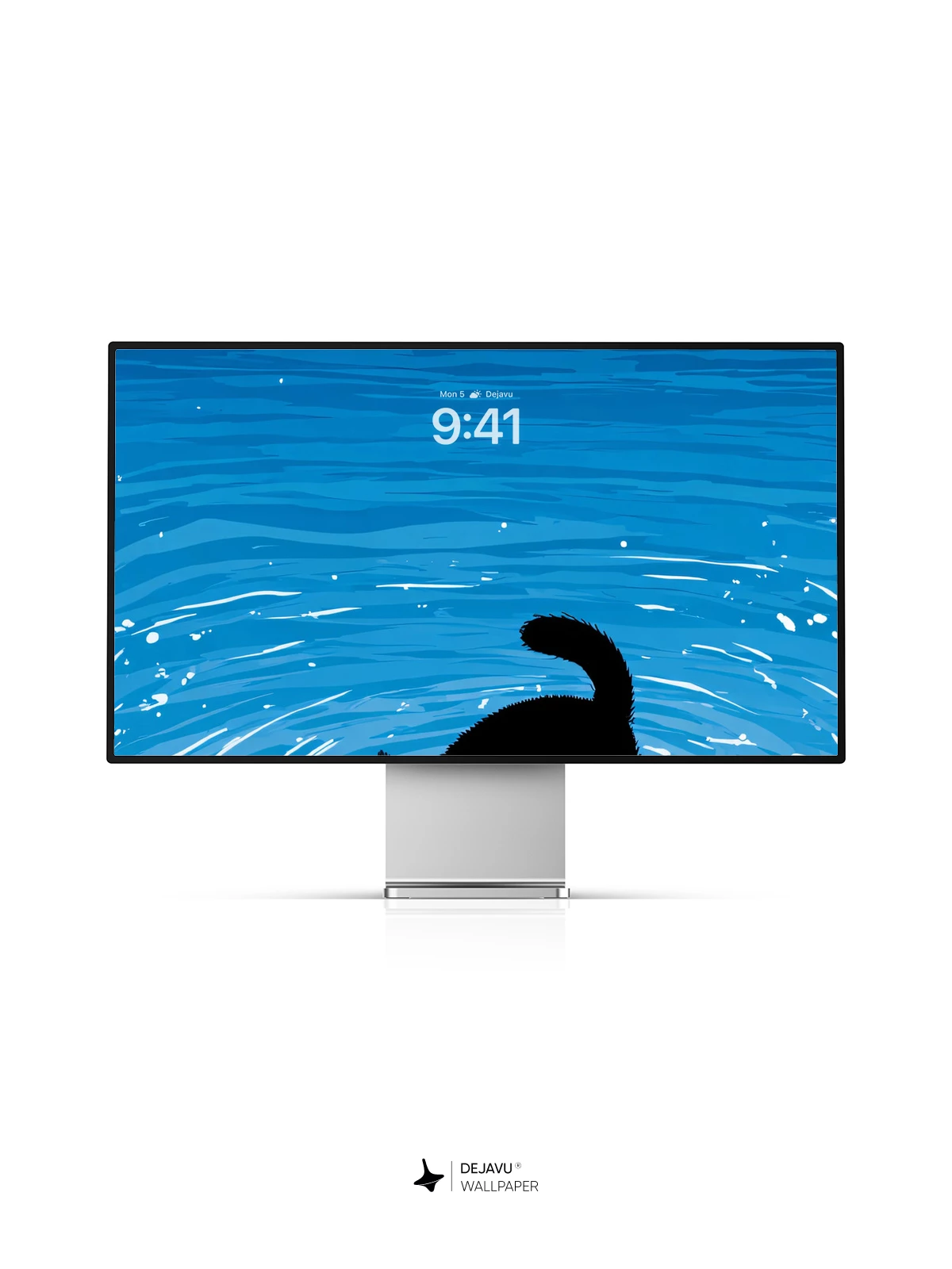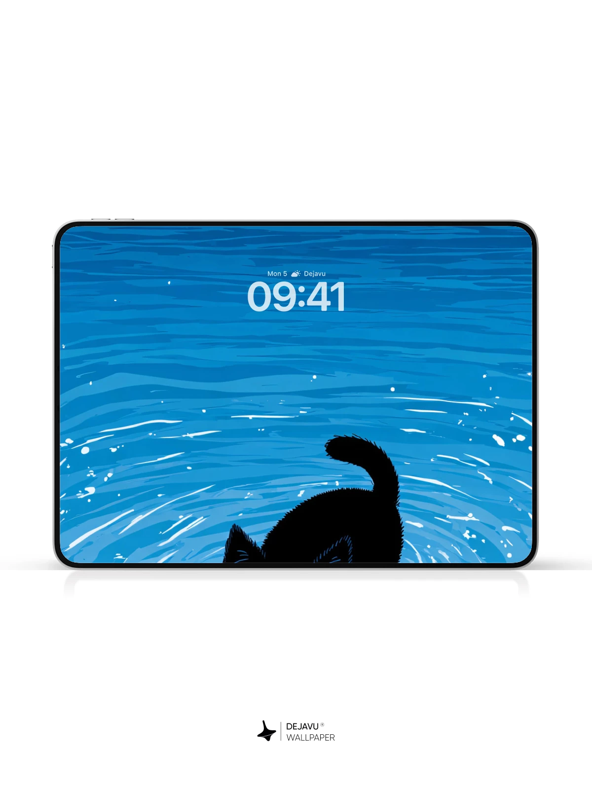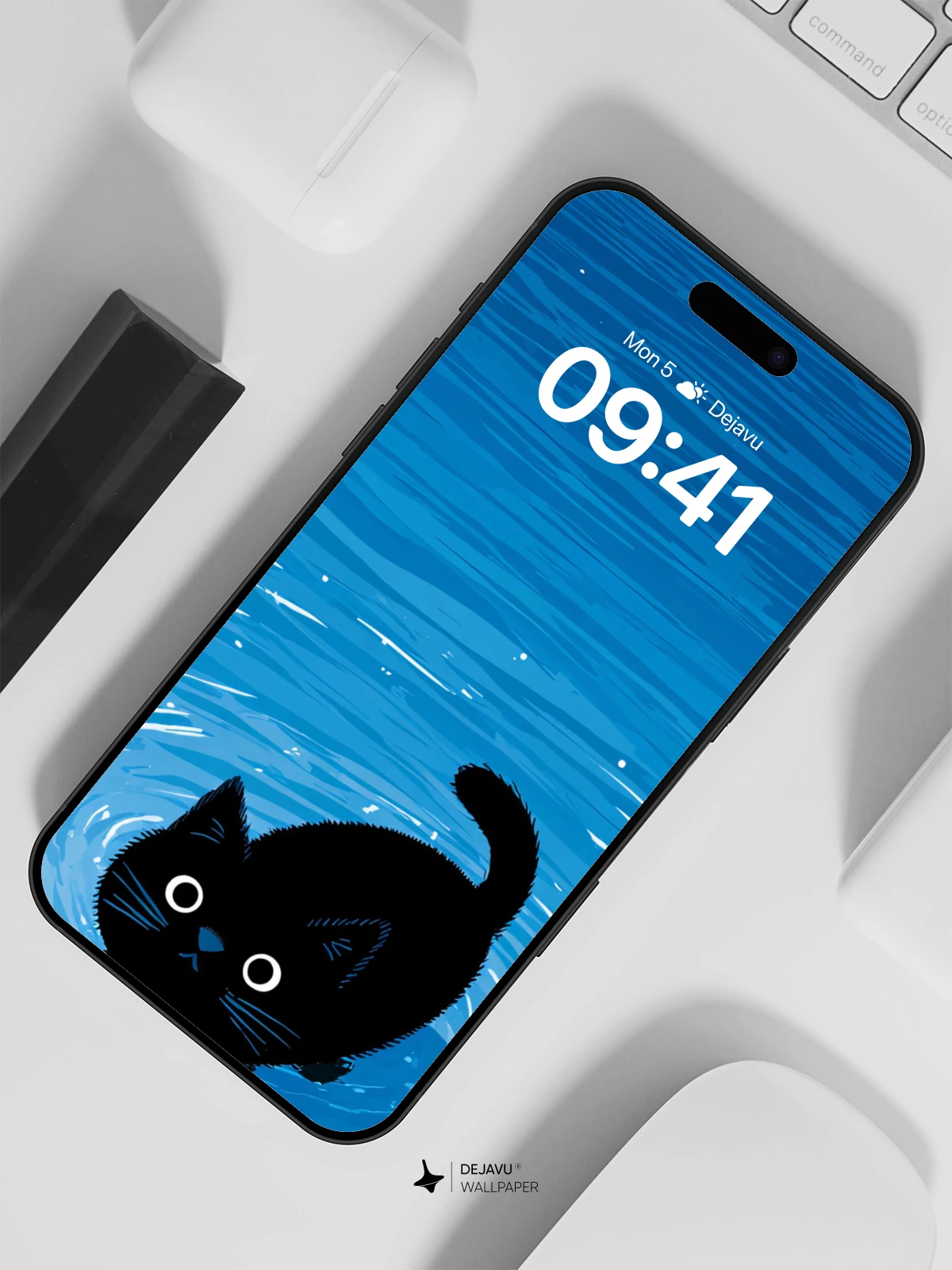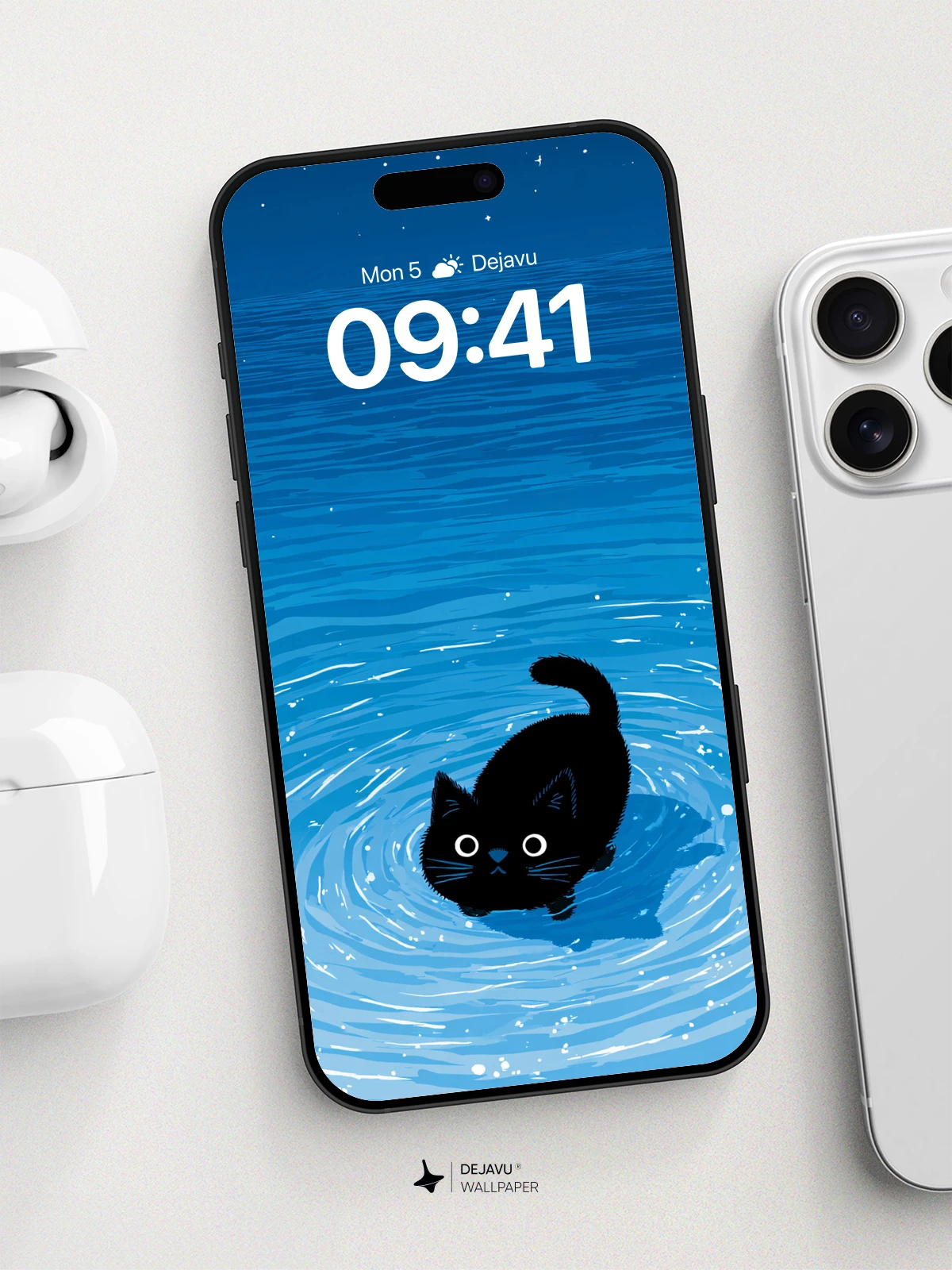 This enchanting 8K wallpaper features a surreal scene of a curious black cat floating atop a tranquil ocean under a starry night sky, its reflection rippling outward like a silent whisper. The minimalist yet magical design evokes a sense of wonder and peaceful solitude, ideal for calming your digital space. With its dreamlike atmosphere and smooth gradients, it’s beautifully optimized for iPhone, Android, tablets, and any device craving a touch of celestial charm.