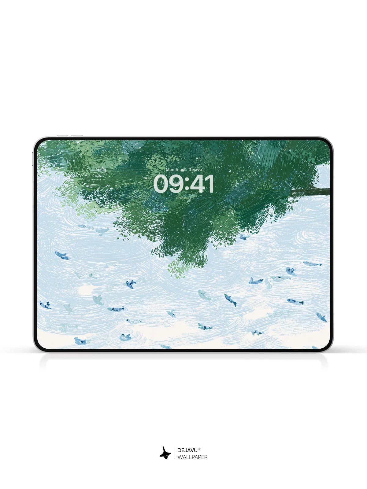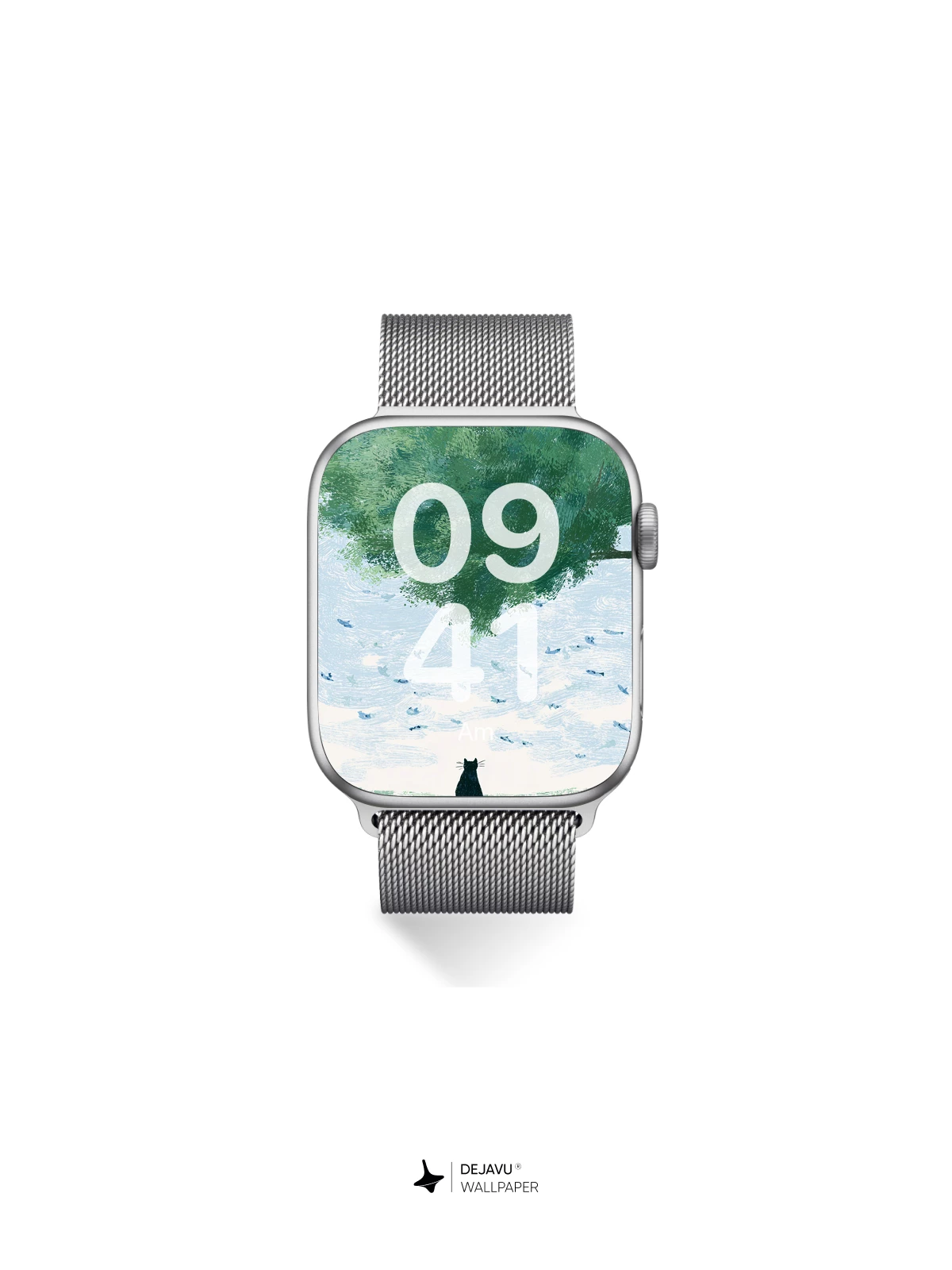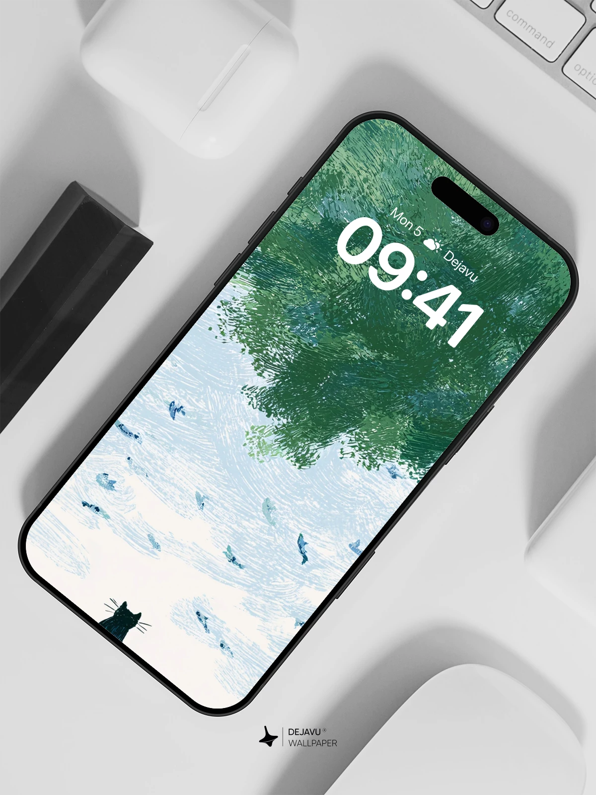 This enchanting illustration blends reality and imagination, where a solitary black cat sits beneath a sprawling green tree, watching fish glide through a sky-like expanse. The whimsical, painterly style evokes a sense of quiet wonder and introspection, making it an ideal 8K wallpaper for iPhone, Android, or tablet users seeking artful, surreal digital backgrounds.