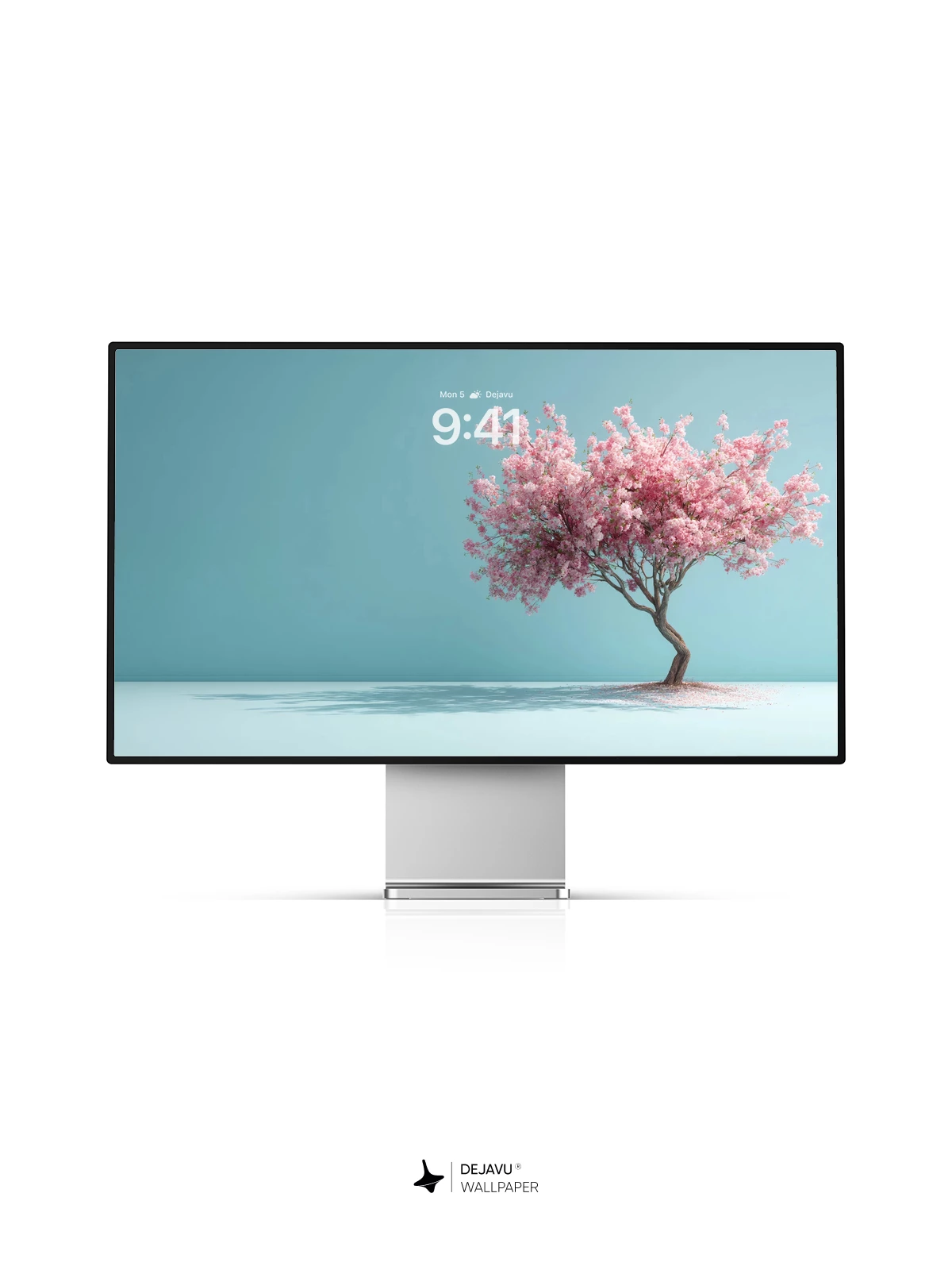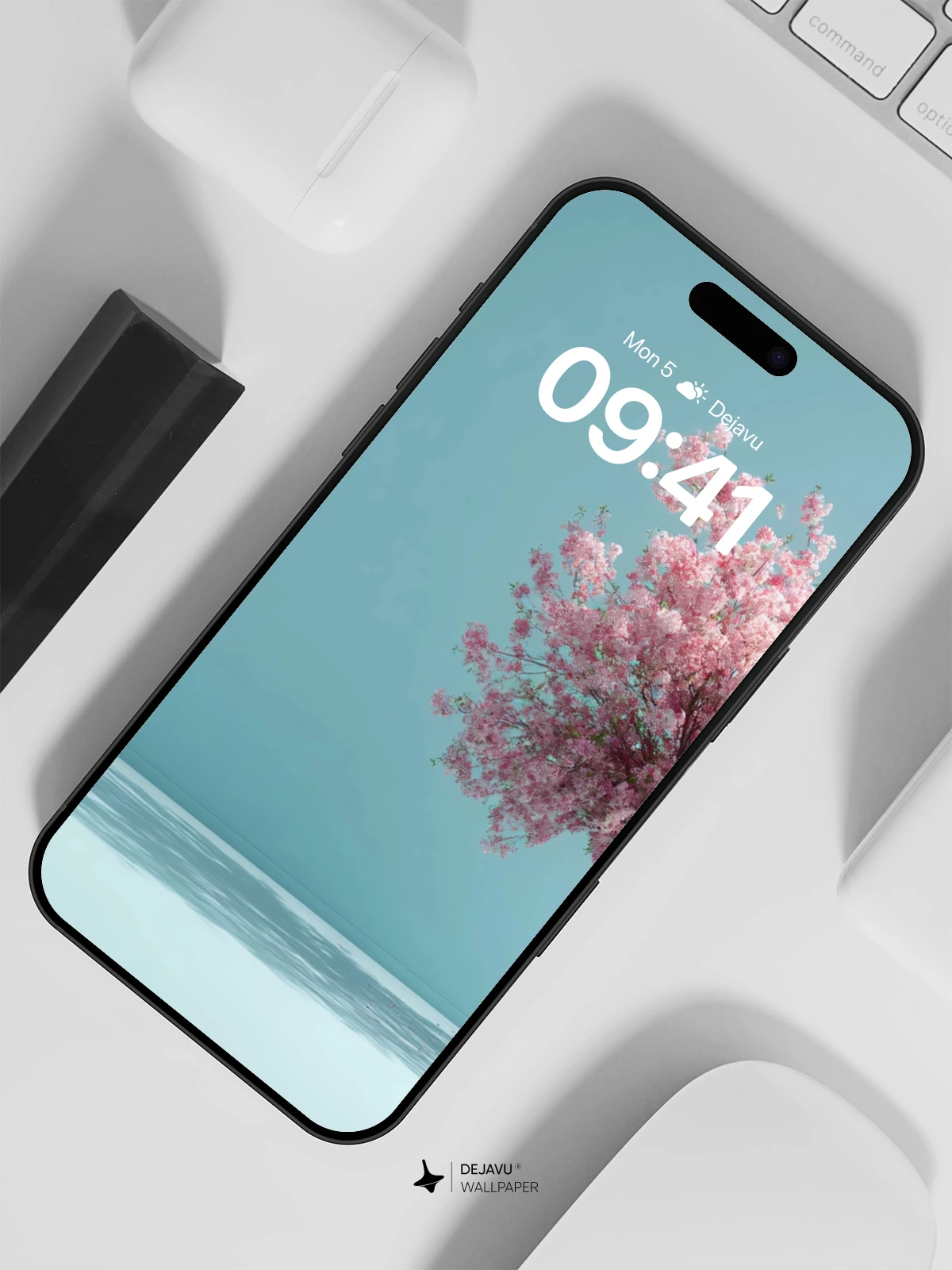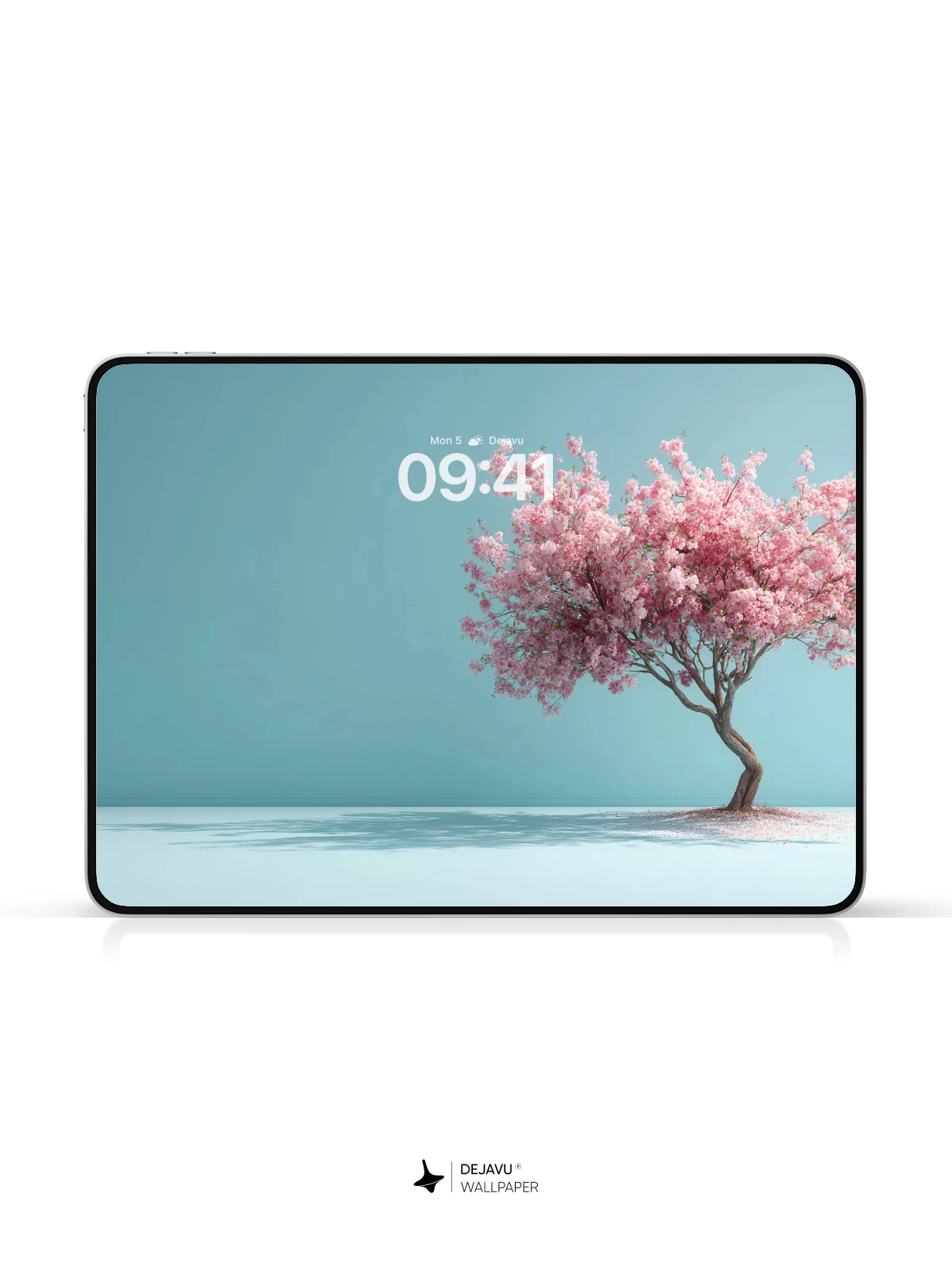 This surreal image captures a solitary cherry blossom tree in full bloom, its delicate pink flowers floating above a calm, reflective surface under a tranquil teal sky. The composition evokes a sense of peaceful solitude and timeless beauty, blending nature with ethereal minimalism. Ideal as an 8K wallpaper for iPhone, Android, or tablets, it brings a touch of poetic serenity to your device’s screen. Designed with clean lines and balanced negative space, it enhances any digital environment with quiet elegance.