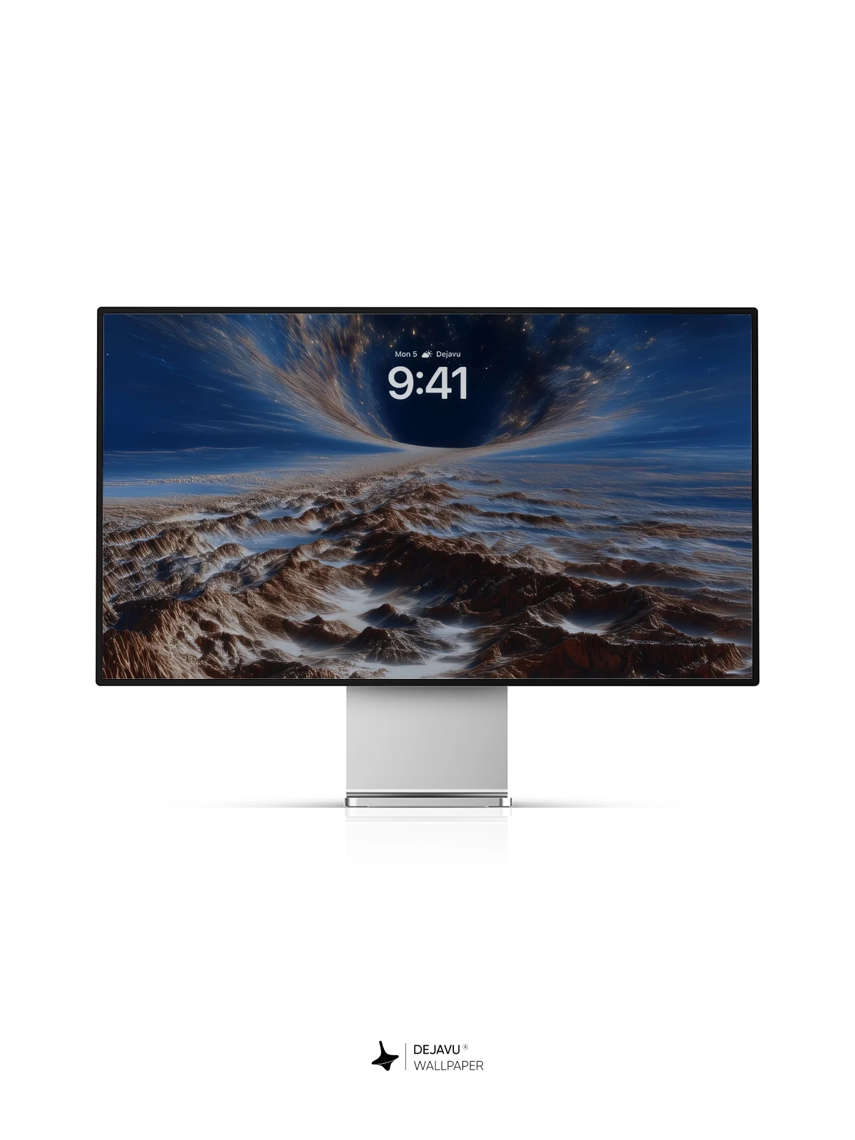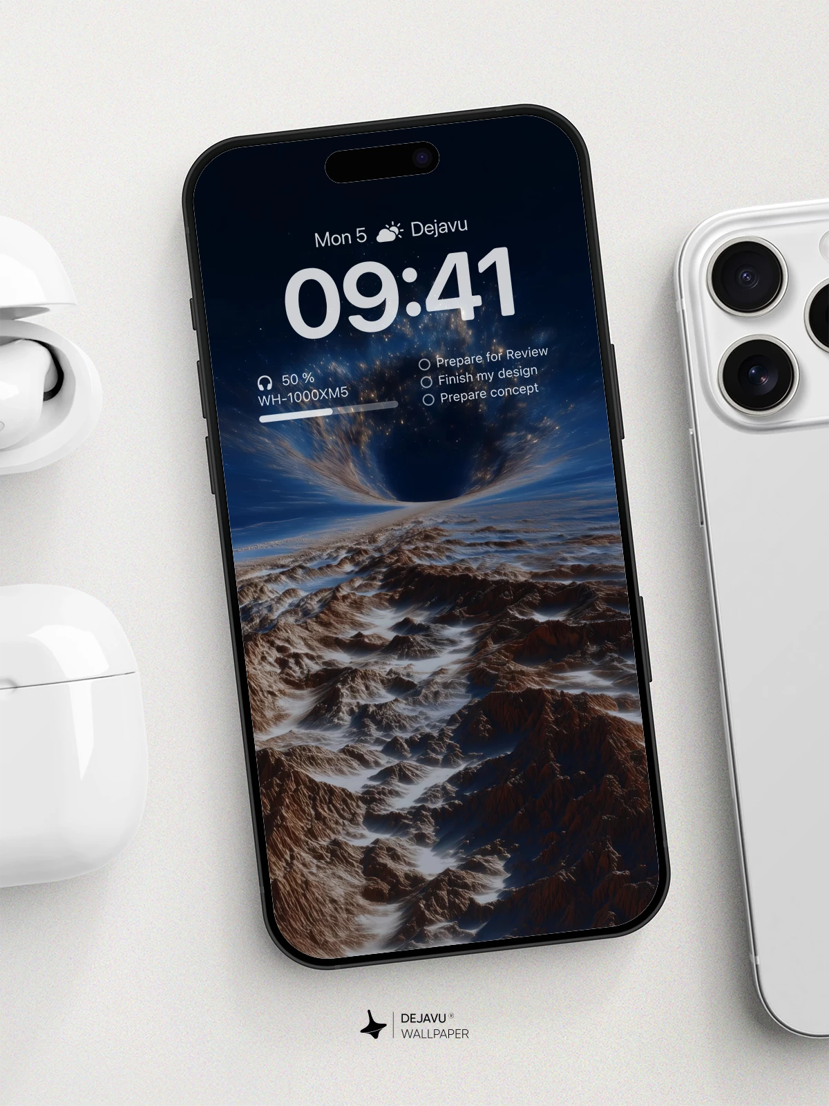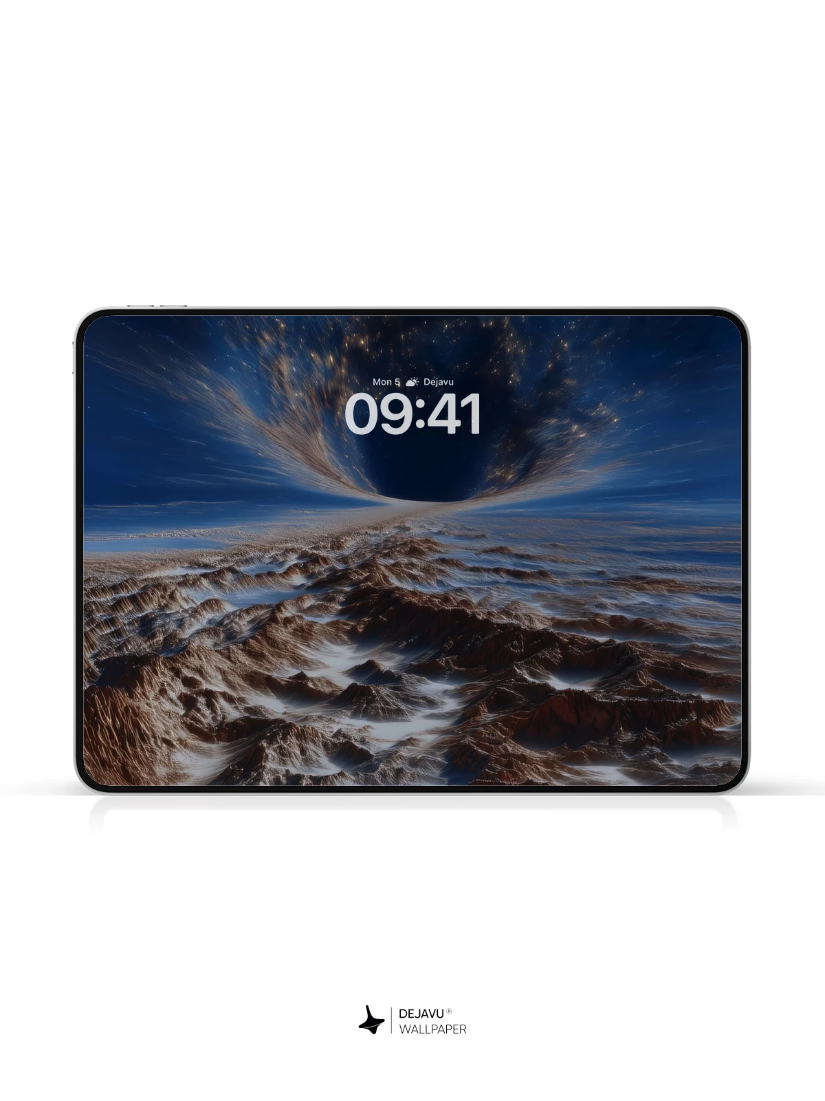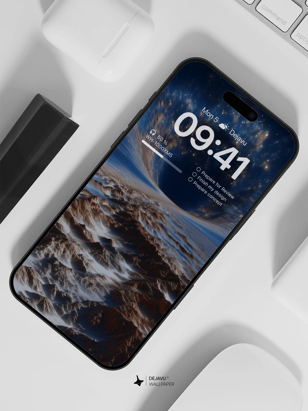 Immerse yourself in the enchanting world of ‘Surreal Cosmic Mountain Wallpaper 8K,’ where the harsh, textured peaks of an alien landscape meet the ethereal dance of celestial bodies. This imaginative design evokes a sense of wonder and infinity, as if standing at the edge of the universe. Ideal for enhancing the visual appeal of your iPhone, Android, or tablet, this artwork transforms any screen into a portal to a dreamlike realm. The harmonious fusion of natural and cosmic elements inspires awe, making it a captivating choice for those who appreciate unique, high-resolution digital art.