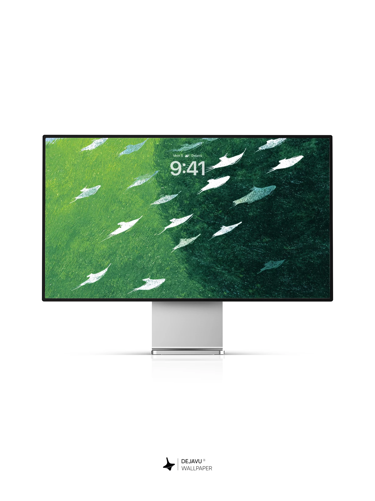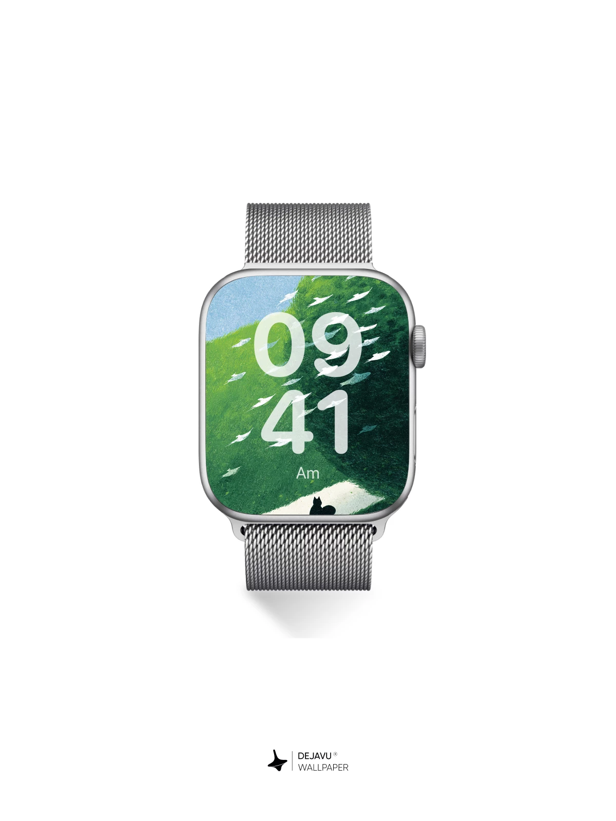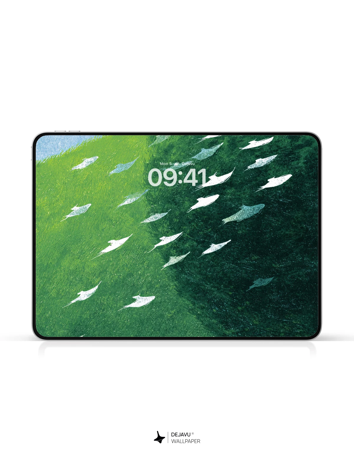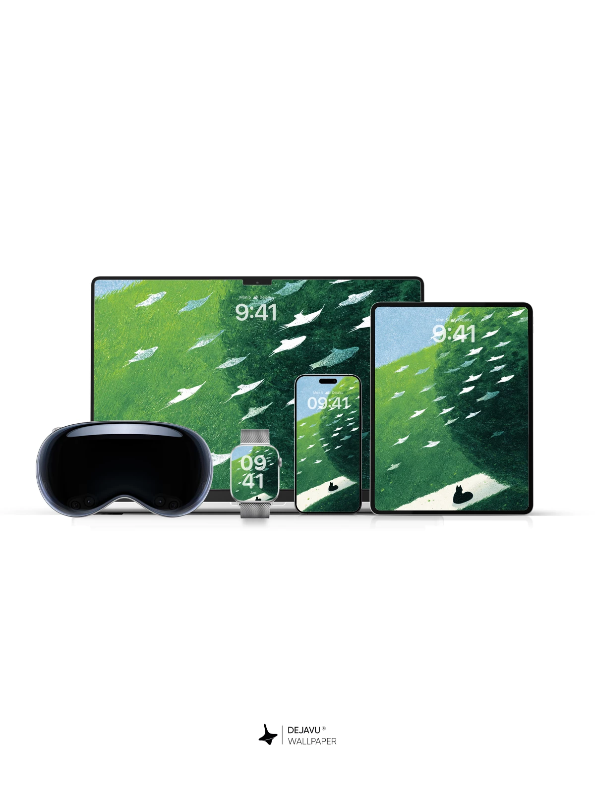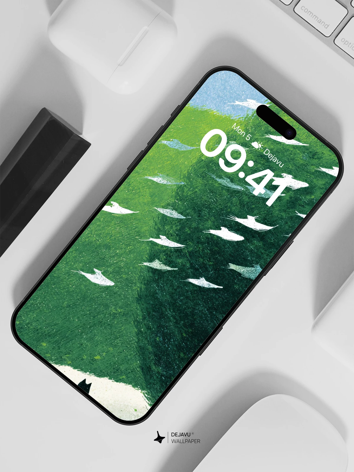 This mesmerizing artwork captures a surreal world where gentle green hills curve like waves under a soft blue sky, while flocks of white birds glide through the air in graceful formation. At the base of the slope, a lone black cat sits in silhouette on a sunlit path, adding a touch of quiet contemplation. Inspired by the poetic sensibilities of modern illustrative art, the piece evokes solitude and wonder, making it ideal as an 8K wallpaper for iPhone, Android, or tablet devices. Its calming yet imaginative design brings a sense of peaceful escape to any screen.