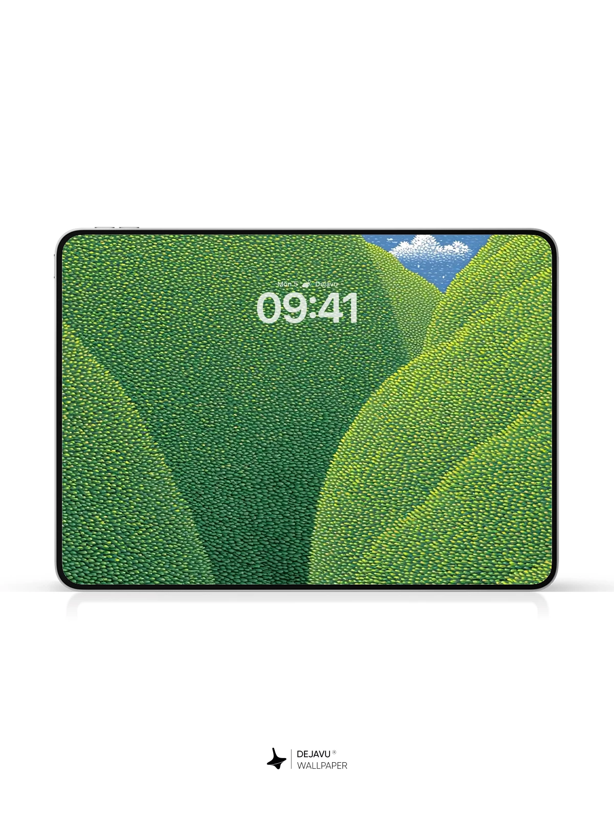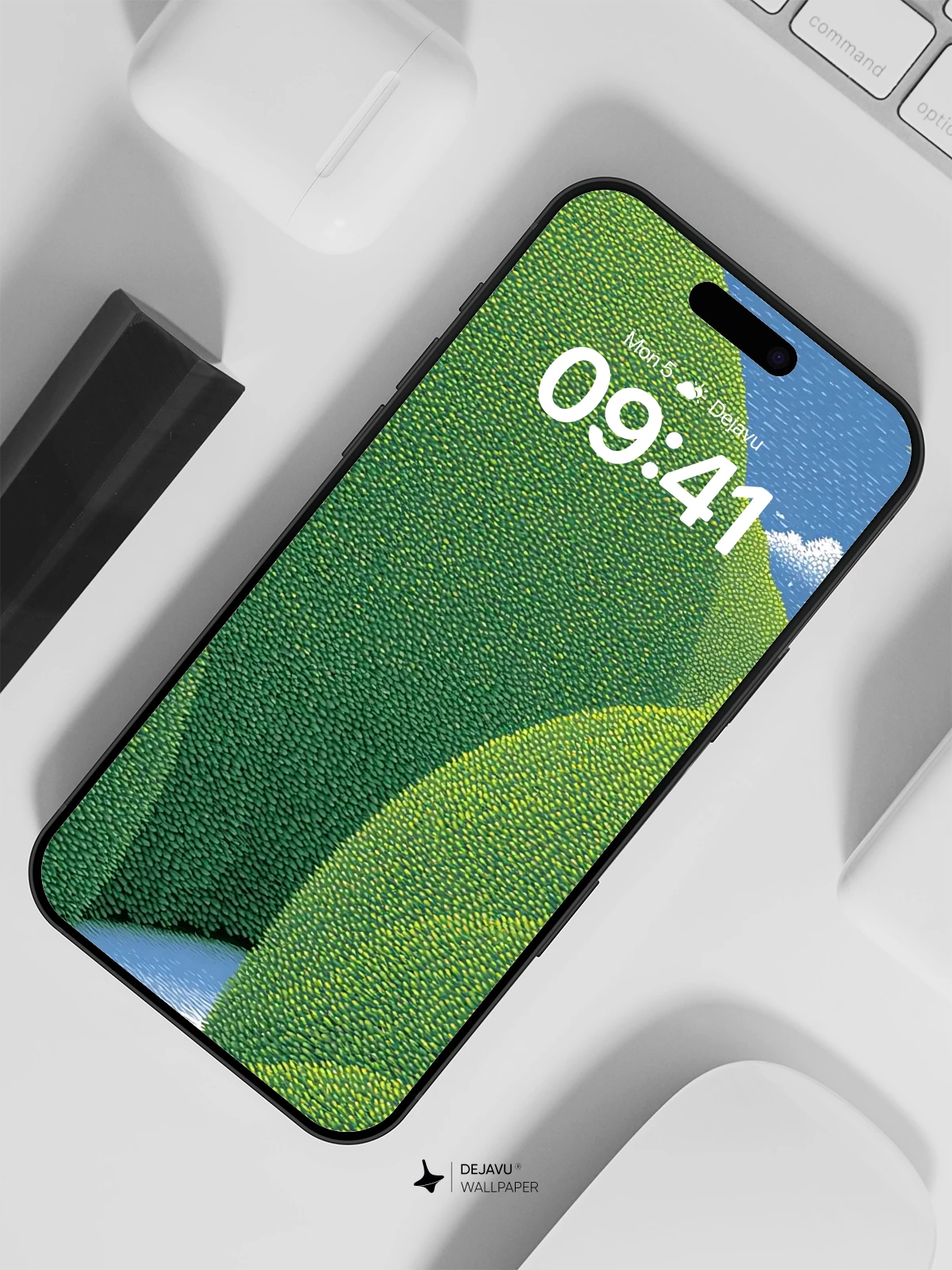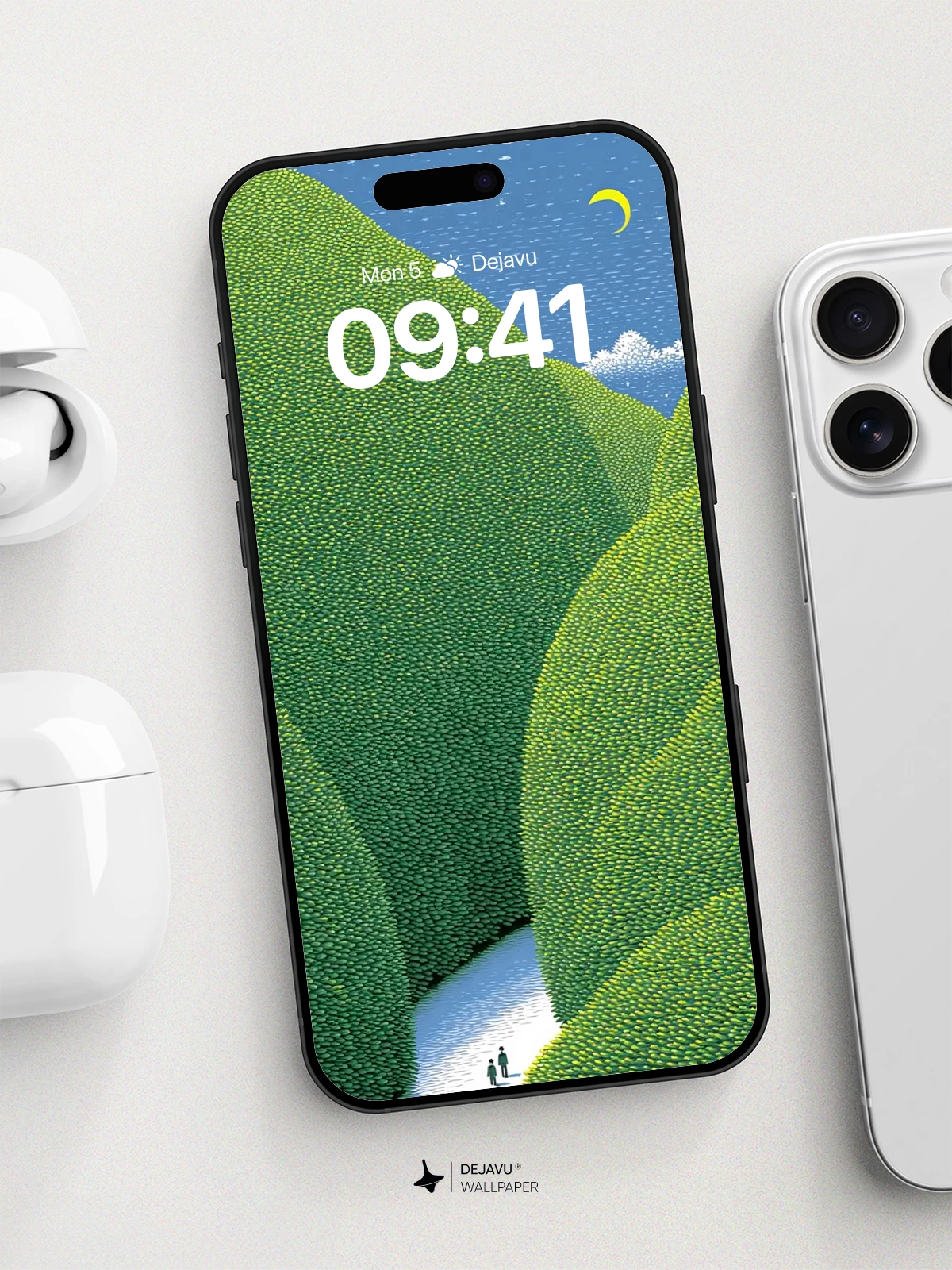 This surreal vision of undulating green hills, crafted with intricate texture and dreamlike scale, evokes a sense of wonder and peaceful solitude. Inspired by the whimsical landscapes of modern digital art, the scene features two tiny figures walking along a narrow path, emphasizing vastness and mystery. The vibrant contrast between emerald slopes and a soft blue sky with a glowing yellow crescent creates a tranquil yet otherworldly atmosphere. Ideal as an 8K wallpaper for iPhone, Android, or tablets, this image transforms your device into a portal to a serene, fantastical world.