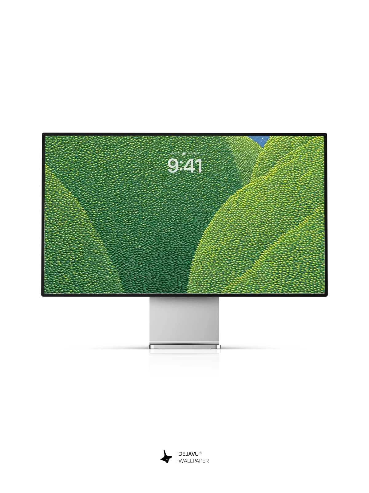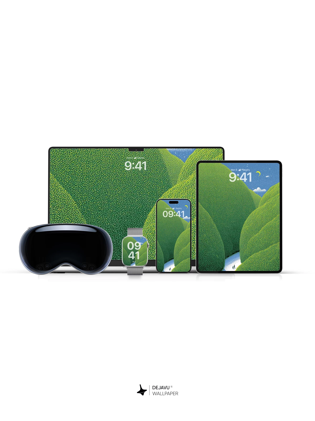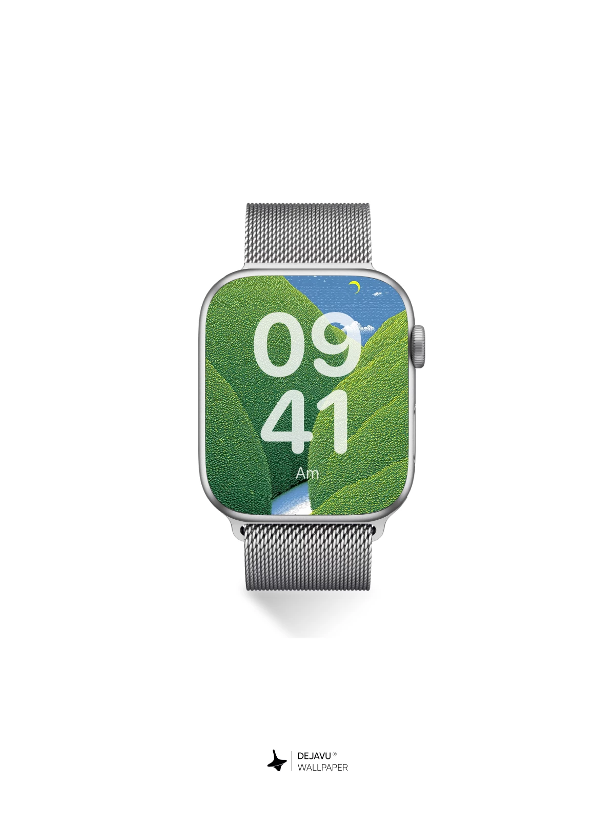 This surreal vision of undulating green hills, crafted with intricate texture and dreamlike scale, evokes a sense of wonder and peaceful solitude. Inspired by the whimsical landscapes of modern digital art, the scene features two tiny figures walking along a narrow path, emphasizing vastness and mystery. The vibrant contrast between emerald slopes and a soft blue sky with a glowing yellow crescent creates a tranquil yet otherworldly atmosphere. Ideal as an 8K wallpaper for iPhone, Android, or tablets, this image transforms your device into a portal to a serene, fantastical world.